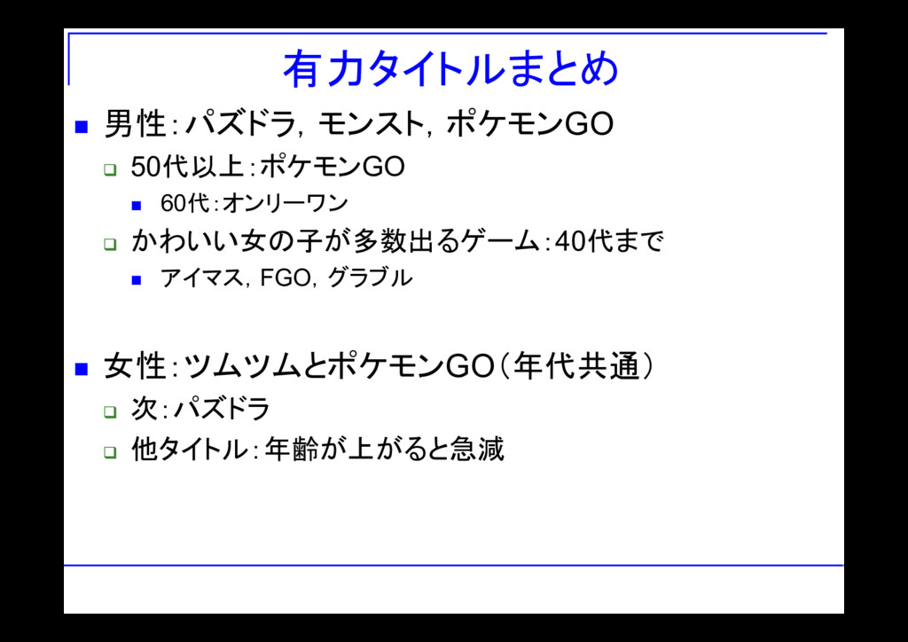 有力タイトルまとめ 男性:パズドラ,モンスト,ポケモンGO 50代以上:ポケモンGO 60代:オンリーワン かわいい女の子が多数出るゲーム:40代まで