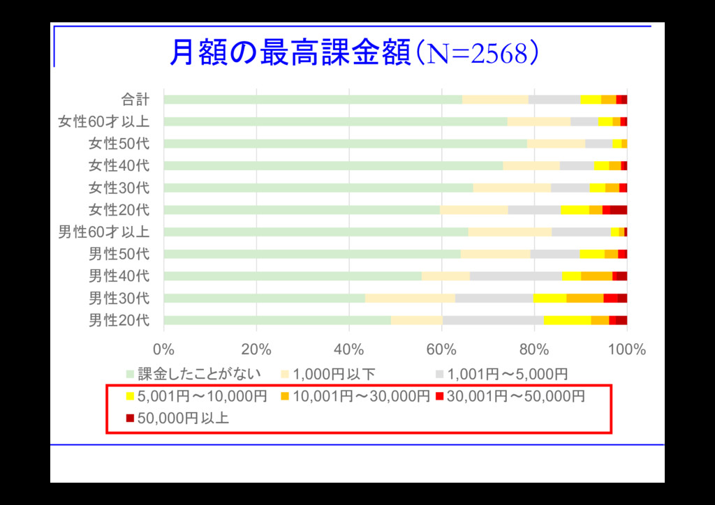 月額の最高課金額(N=2568) 0% 20% 40% 60% 80% 100% 男性20代 男性30代 男性40代
