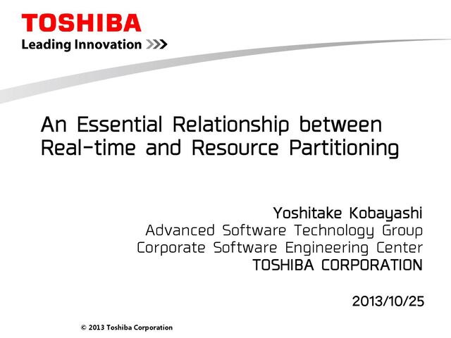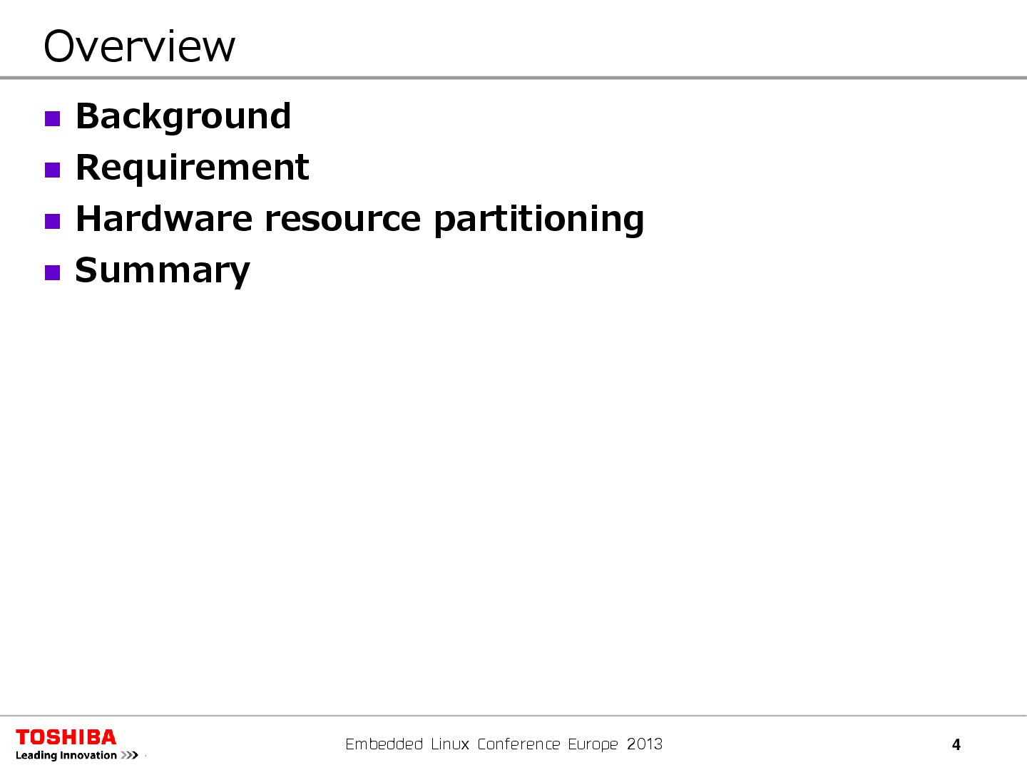 RT processes and GP processes on a same hardware platform Just use Linux for both processes Meet its required deadline for RT process Hardware resource partitioning Set of hardware resources which is isolated from the others Define CPU cores as RT core and GP core Issues to implement the resource partitioning Some kernel thread cannot be migrated Core specific kernel thread Need to care with CPU affinity feature Focused on cascade in timer.c Protect from cascade function on RT core Keep timer list empty Future plan Fixing issues SCHED_DEADLINE on RT core with fine granularity support