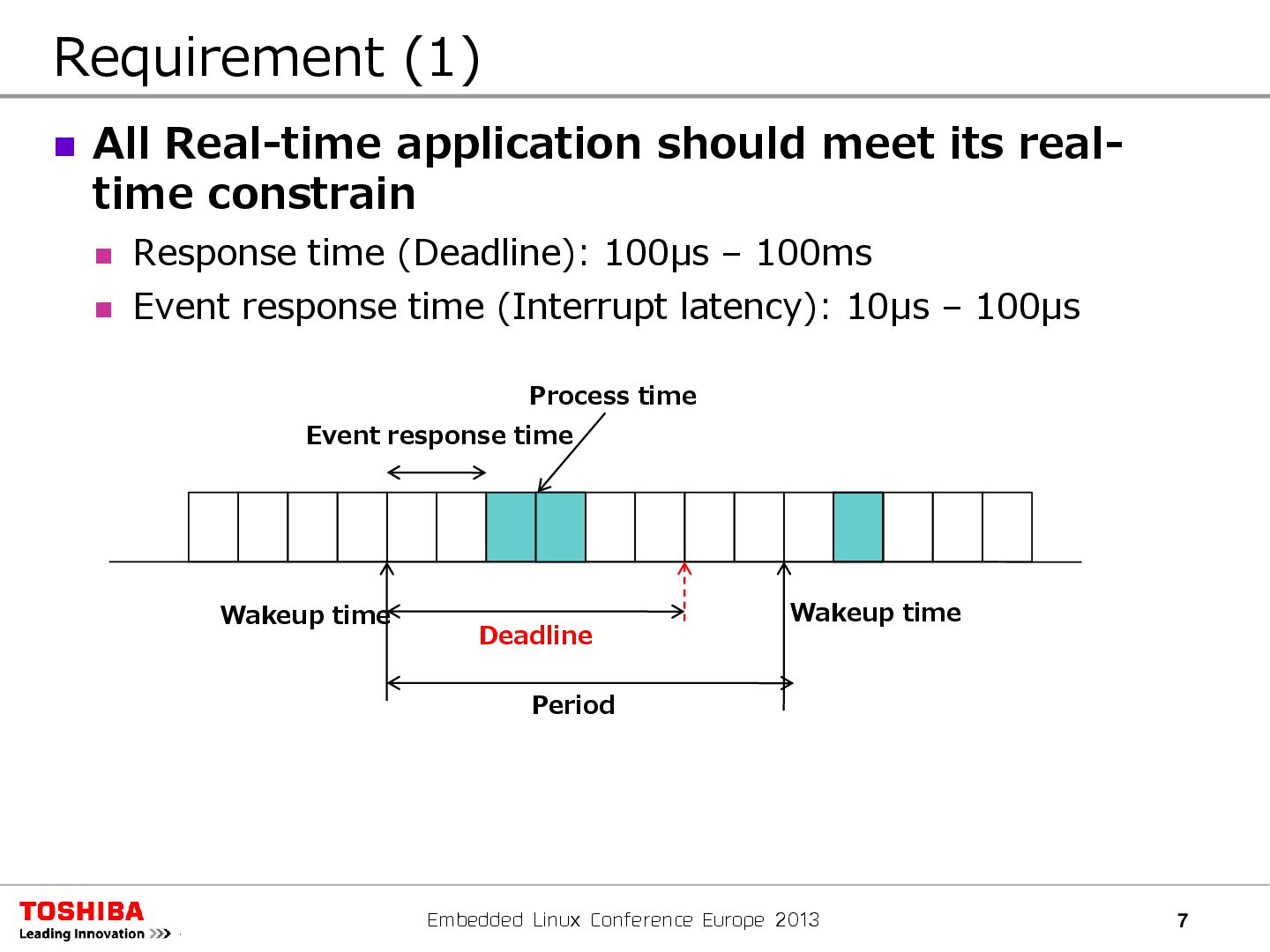 Real-time application should meet its real- time constrain Response time (Deadline): 100μs – 100ms Event response time (Interrupt latency): 10μs – 100μs Wakeup time Process time Deadline Period Event response time Wakeup time