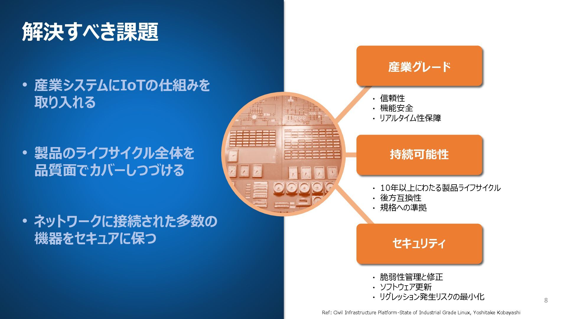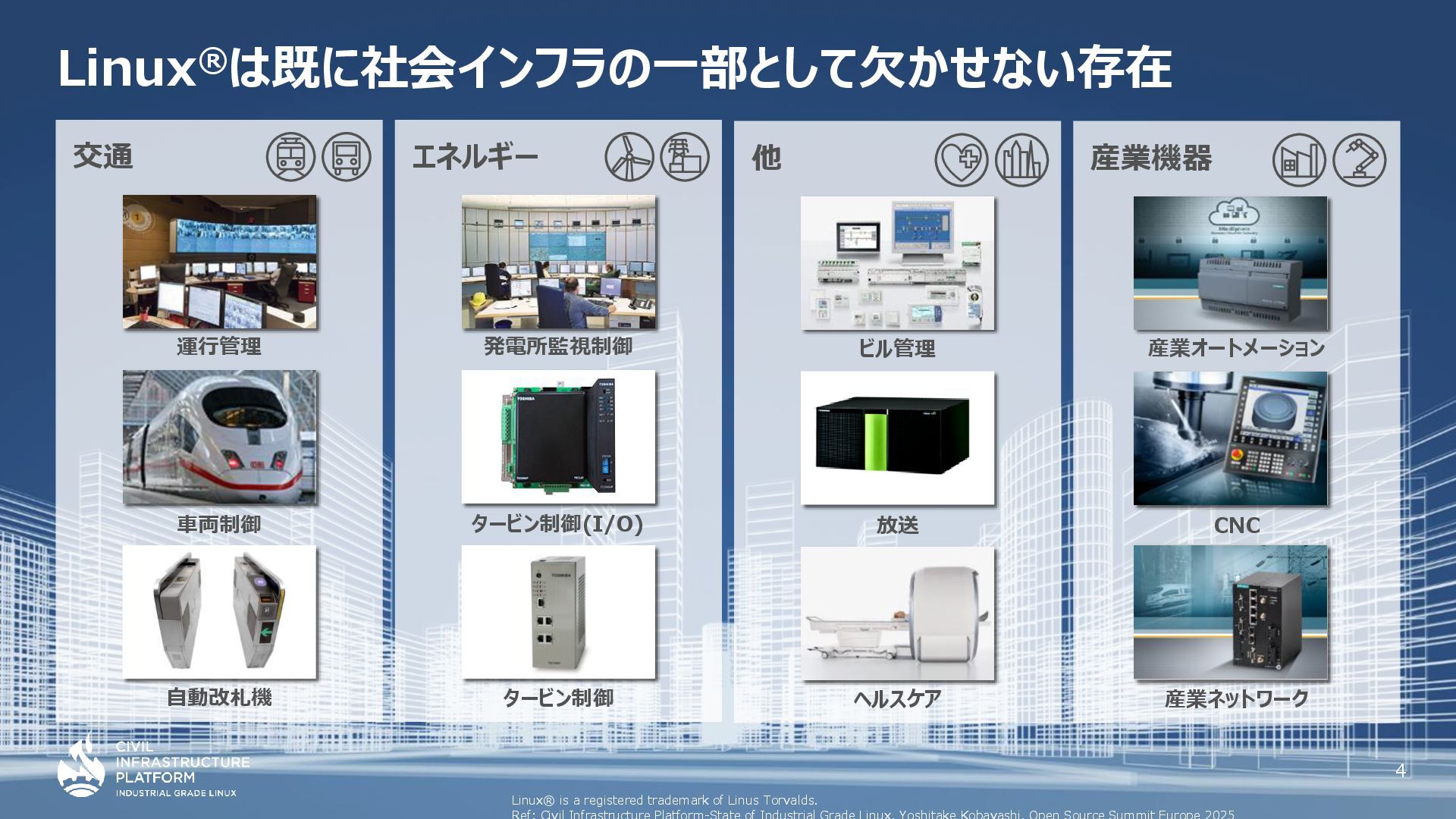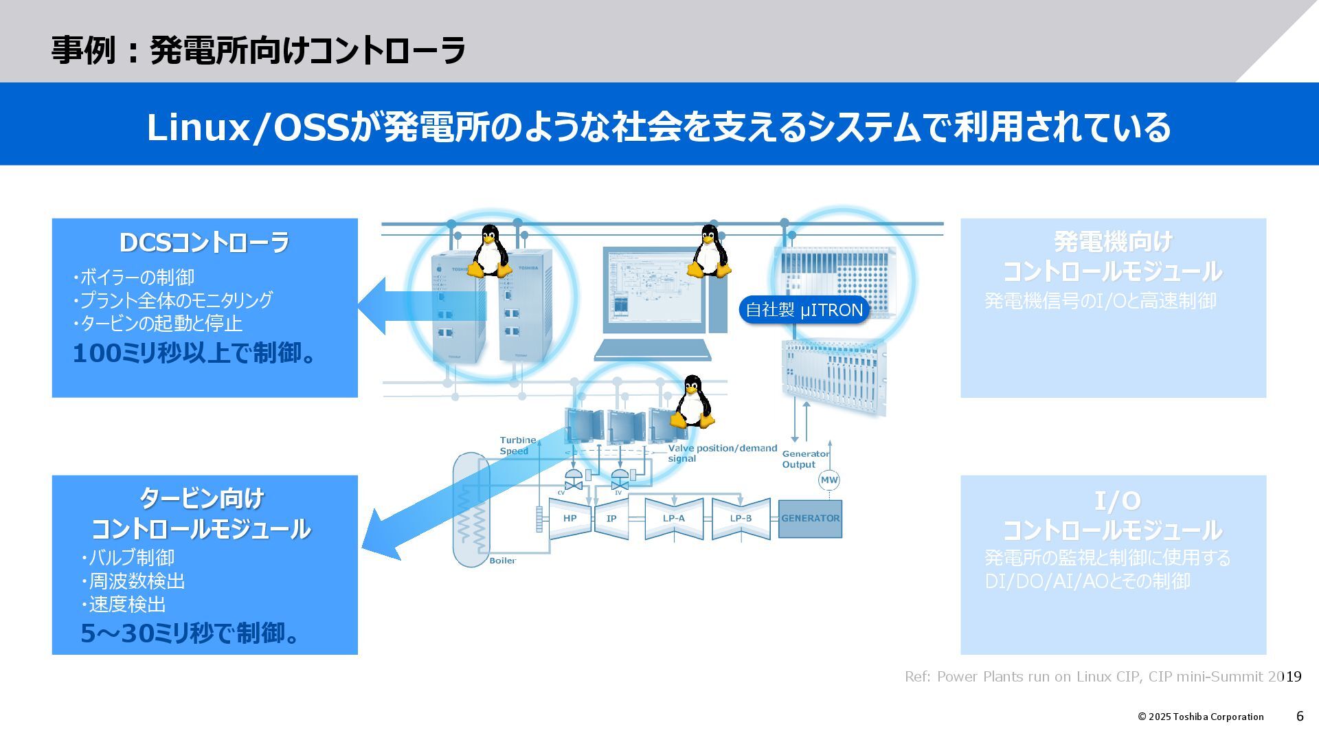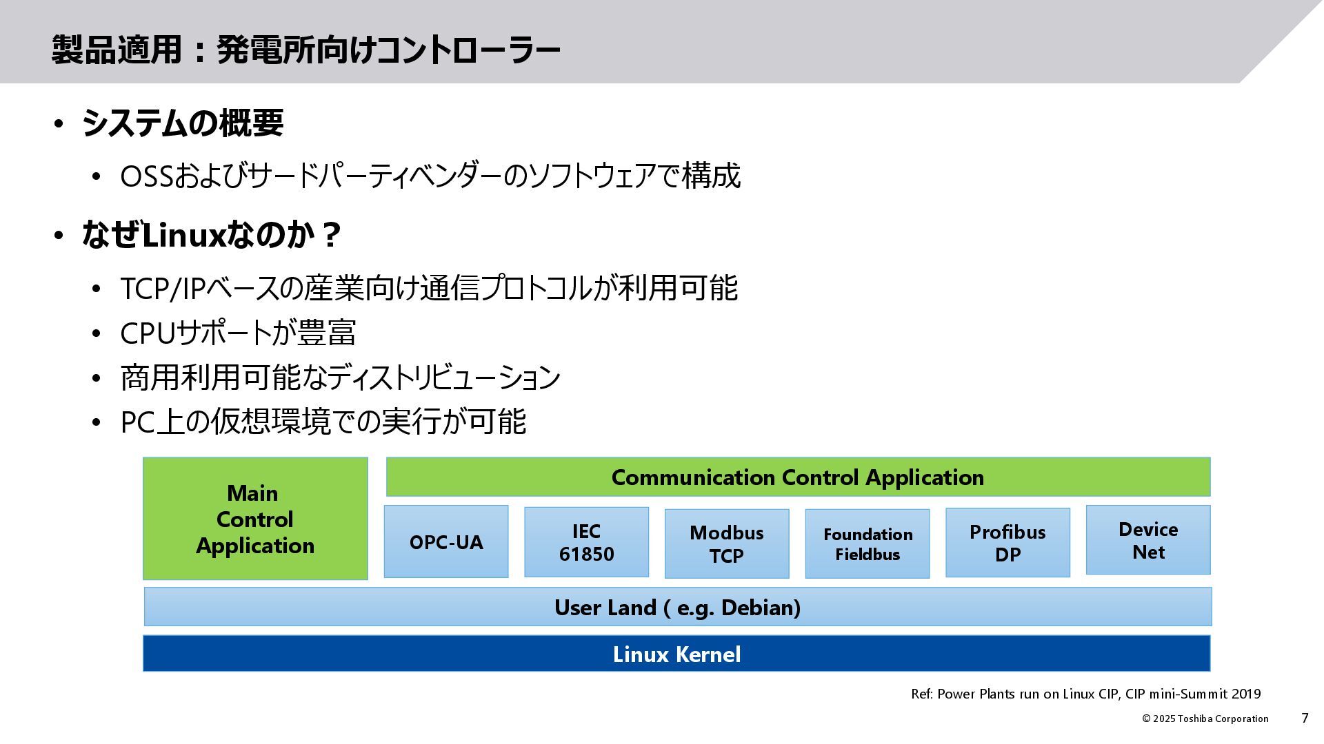 • なぜLinuxなのか? • TCP/IPベースの産業向け通信プロトコルが利用可能 • CPUサポートが豊富 • 商用利用可能なディストリビューション • PC上の仮想環境での実行が可能 Main Control Application Communication Control Application User Land ( e.g. Debian) OPC-UA Modbus TCP Profibus DP Device Net Linux Kernel IEC 61850 Foundation Fieldbus Ref: Power Plants run on Linux CIP, CIP mini-Summit 2019