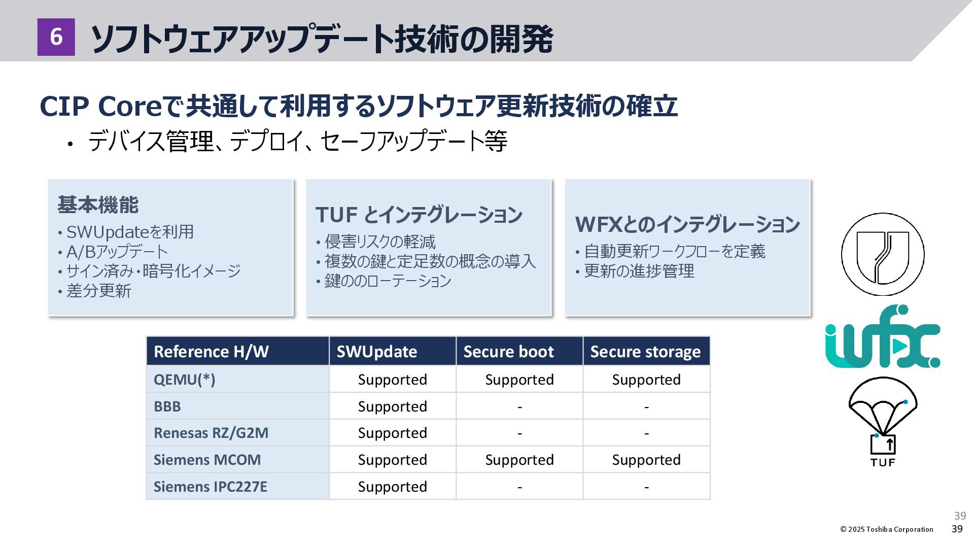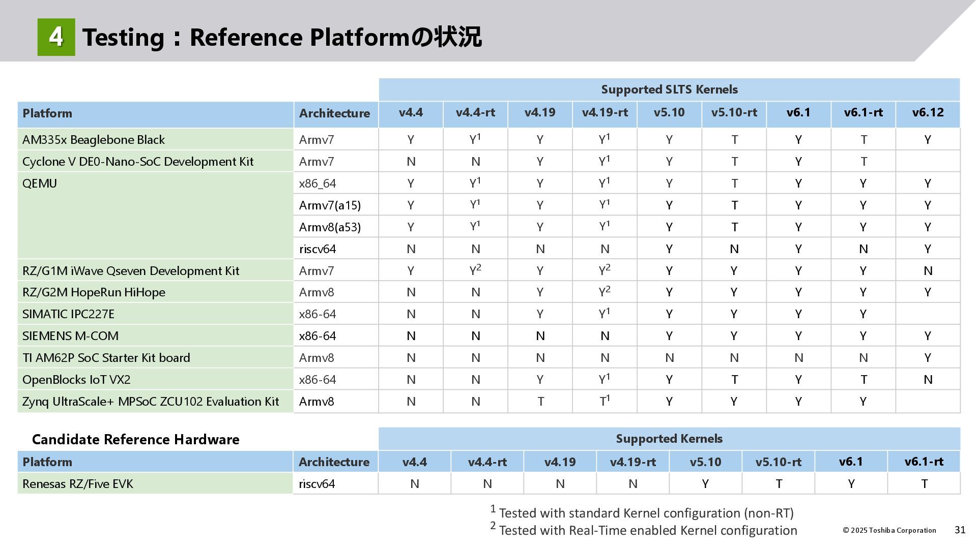Tested with standard Kernel configuration (non-RT) 2 Tested with Real-Time enabled Kernel configuration Supported SLTS Kernels Platform Architecture v4.4 v4.4-rt v4.19 v4.19-rt v5.10 v5.10-rt v6.1 v6.1-rt v6.12 AM335x Beaglebone Black Armv7 Y Y1 Y Y1 Y T Y T Y Cyclone V DE0-Nano-SoC Development Kit Armv7 N N Y Y1 Y T Y T QEMU x86_64 Y Y1 Y Y1 Y T Y Y Y Armv7(a15) Y Y1 Y Y1 Y T Y Y Y Armv8(a53) Y Y1 Y Y1 Y T Y Y Y riscv64 N N N N Y N Y N Y RZ/G1M iWave Qseven Development Kit Armv7 Y Y2 Y Y2 Y Y Y Y N RZ/G2M HopeRun HiHope Armv8 N N Y Y2 Y Y Y Y Y SIMATIC IPC227E x86-64 N N Y Y1 Y Y Y Y SIEMENS M-COM x86-64 N N N N Y Y Y Y Y TI AM62P SoC Starter Kit board Armv8 N N N N N N N N Y OpenBlocks IoT VX2 x86-64 N N Y Y1 Y T Y T N Zynq UltraScale+ MPSoC ZCU102 Evaluation Kit Armv8 N N T T1 Y Y Y Y Candidate Reference Hardware Supported Kernels Platform Architecture v4.4 v4.4-rt v4.19 v4.19-rt v5.10 v5.10-rt v6.1 v6.1-rt Renesas RZ/Five EVK riscv64 N N N N Y T Y T