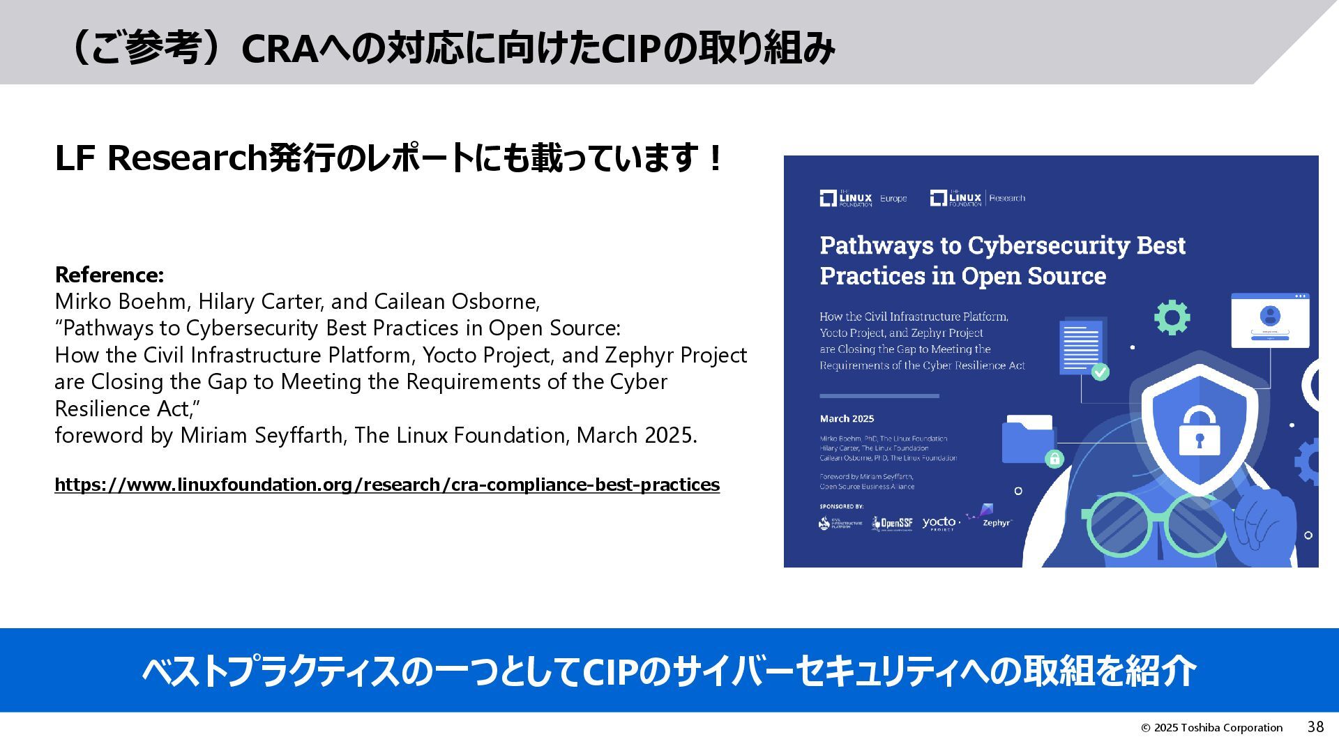 Mirko Boehm, Hilary Carter, and Cailean Osborne, “Pathways to Cybersecurity Best Practices in Open Source: How the Civil Infrastructure Platform, Yocto Project, and Zephyr Project are Closing the Gap to Meeting the Requirements of the Cyber Resilience Act,” foreword by Miriam Seyffarth, The Linux Foundation, March 2025. https://www.linuxfoundation.org/research/cra-compliance-best-practices