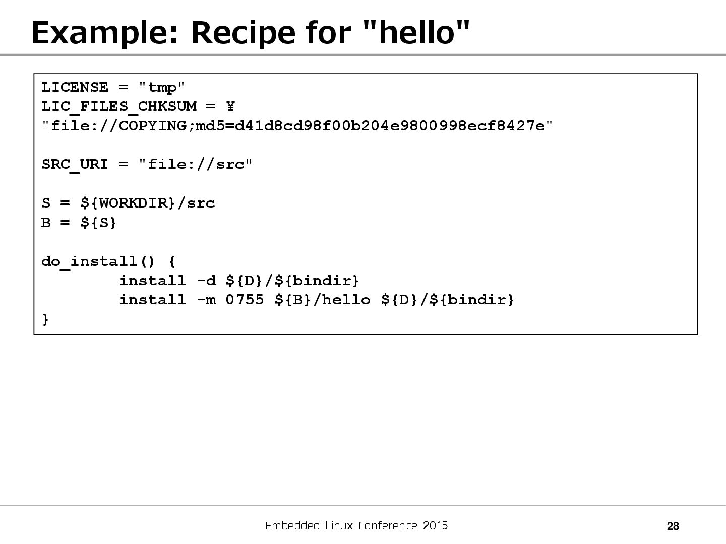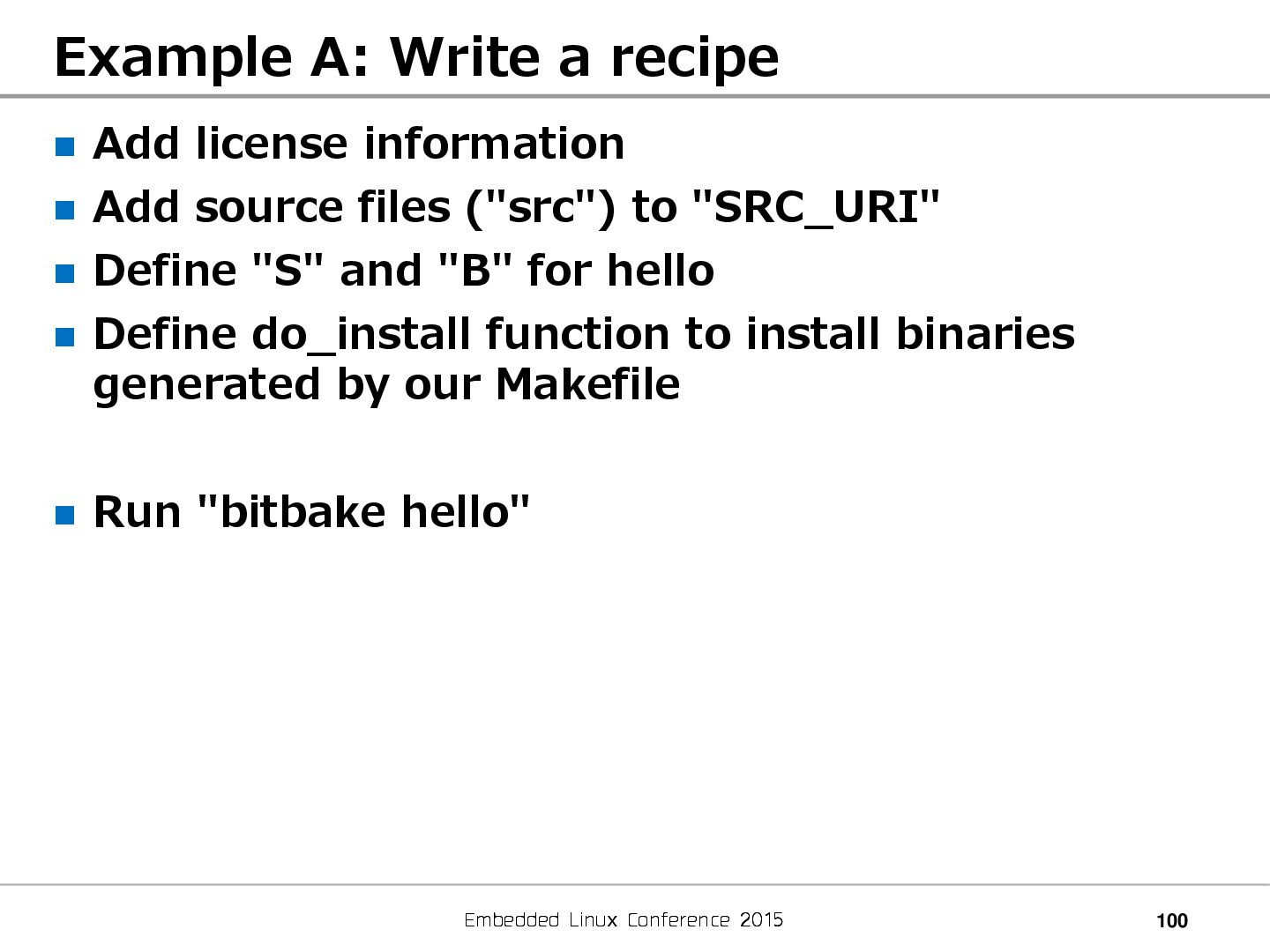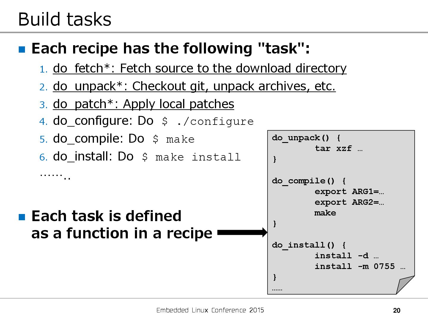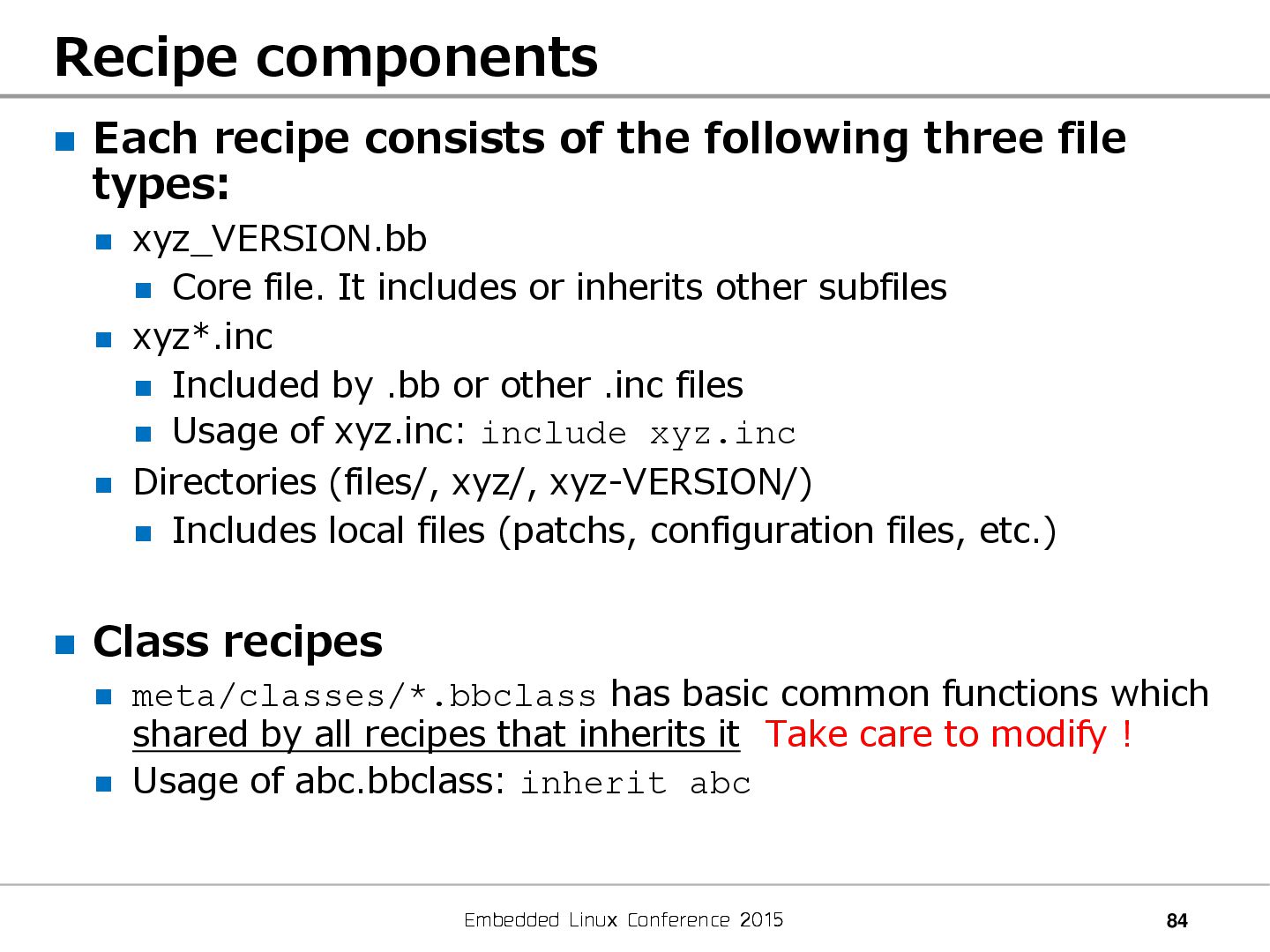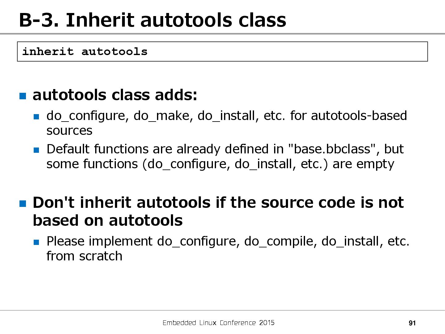 Inherit autotools class autotools class adds: do_configure, do_make, do_install, etc. for autotools-based sources Default functions are already defined in "base.bbclass", but some functions (do_configure, do_install, etc.) are empty Don't inherit autotools if the source code is not based on autotools Please implement do_configure, do_compile, do_install, etc. from scratch inherit autotools