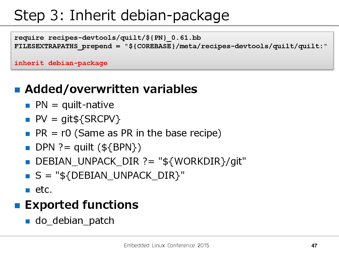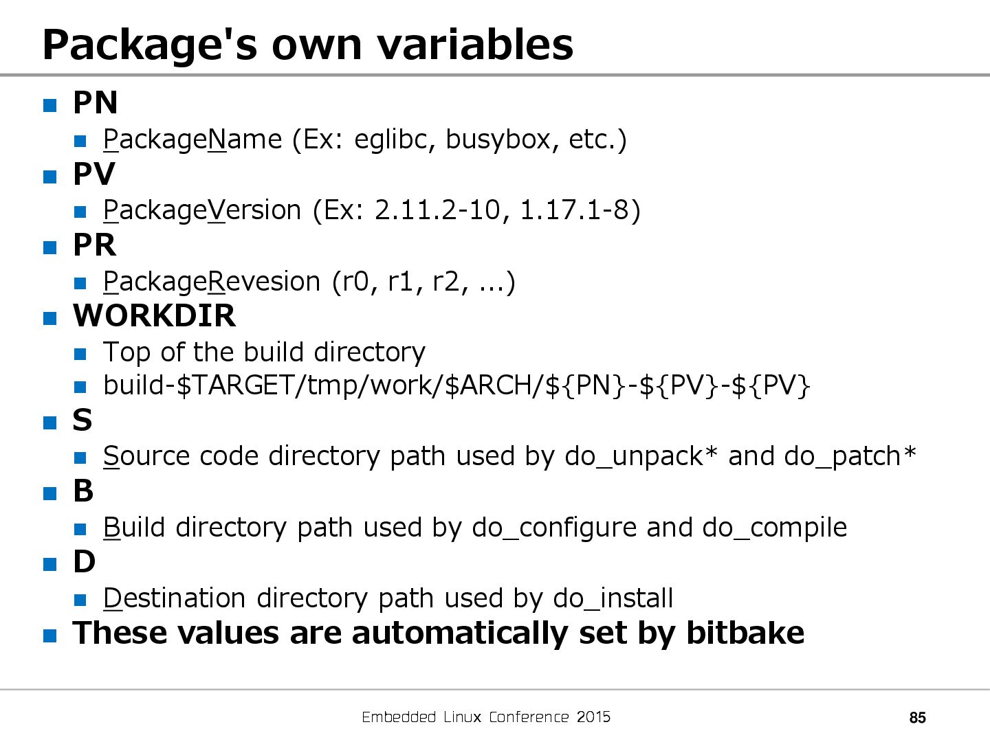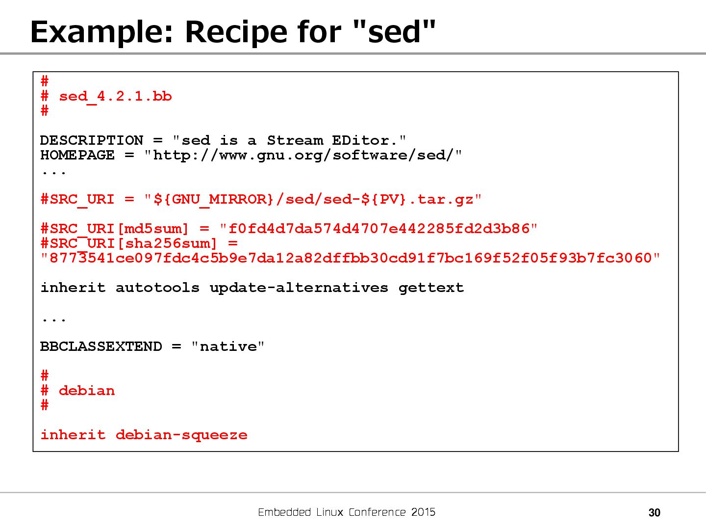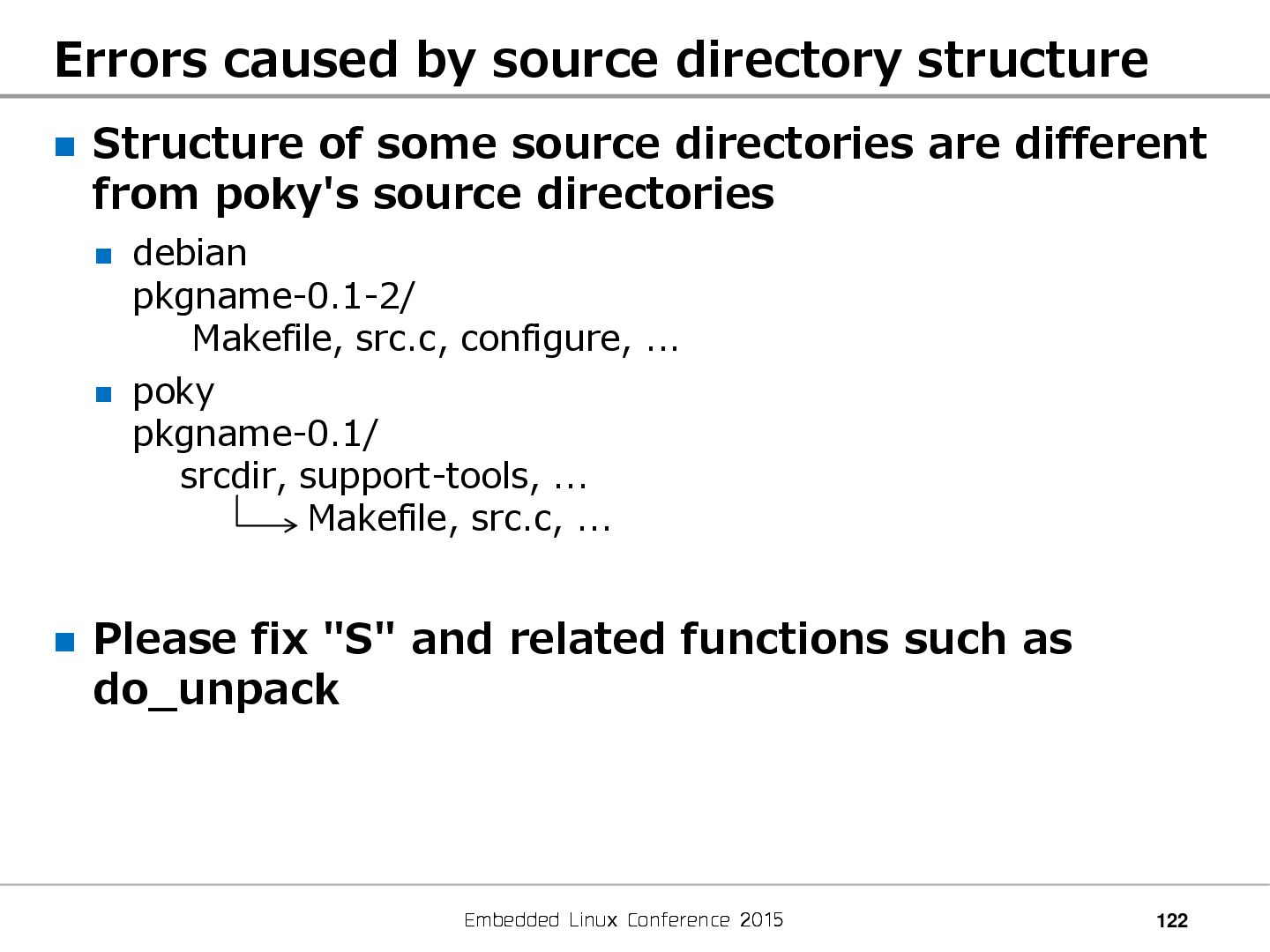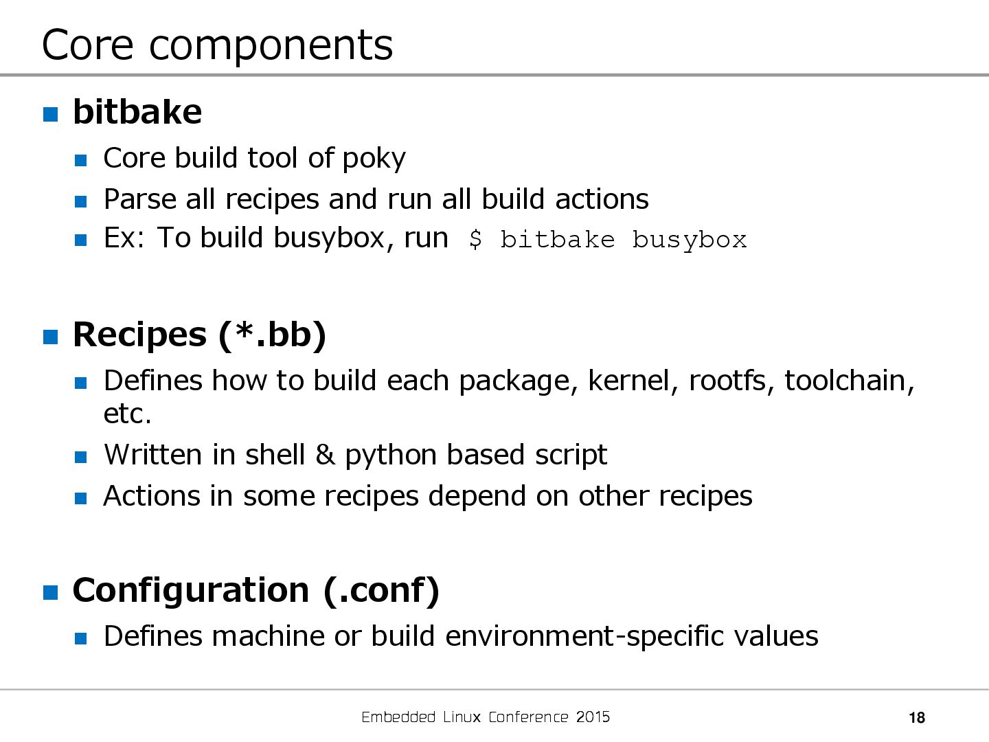 Inherit autotools class autotools class adds: do_configure, do_make, do_install, etc. for autotools-based sources Default functions are already defined in "base.bbclass", but some functions (do_configure, do_install, etc.) are empty Don't inherit autotools if the source code is not based on autotools Please implement do_configure, do_compile, do_install, etc. from scratch inherit autotools
