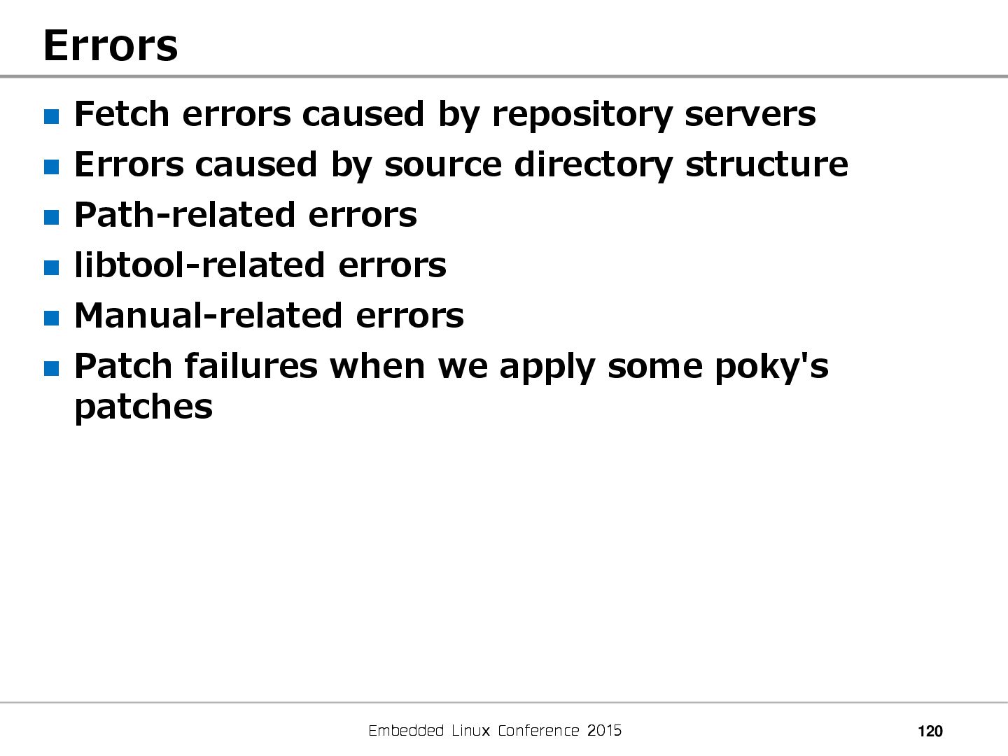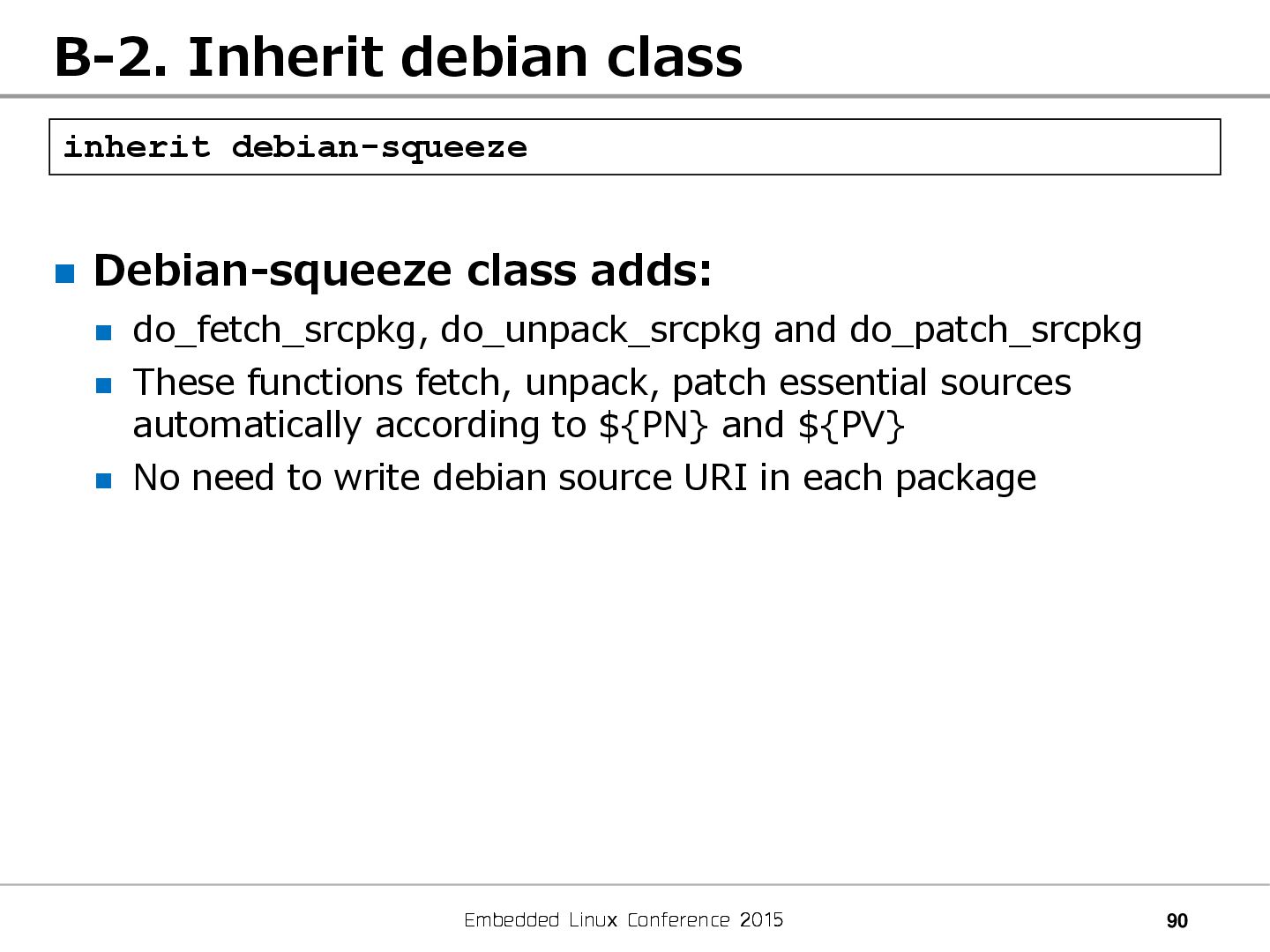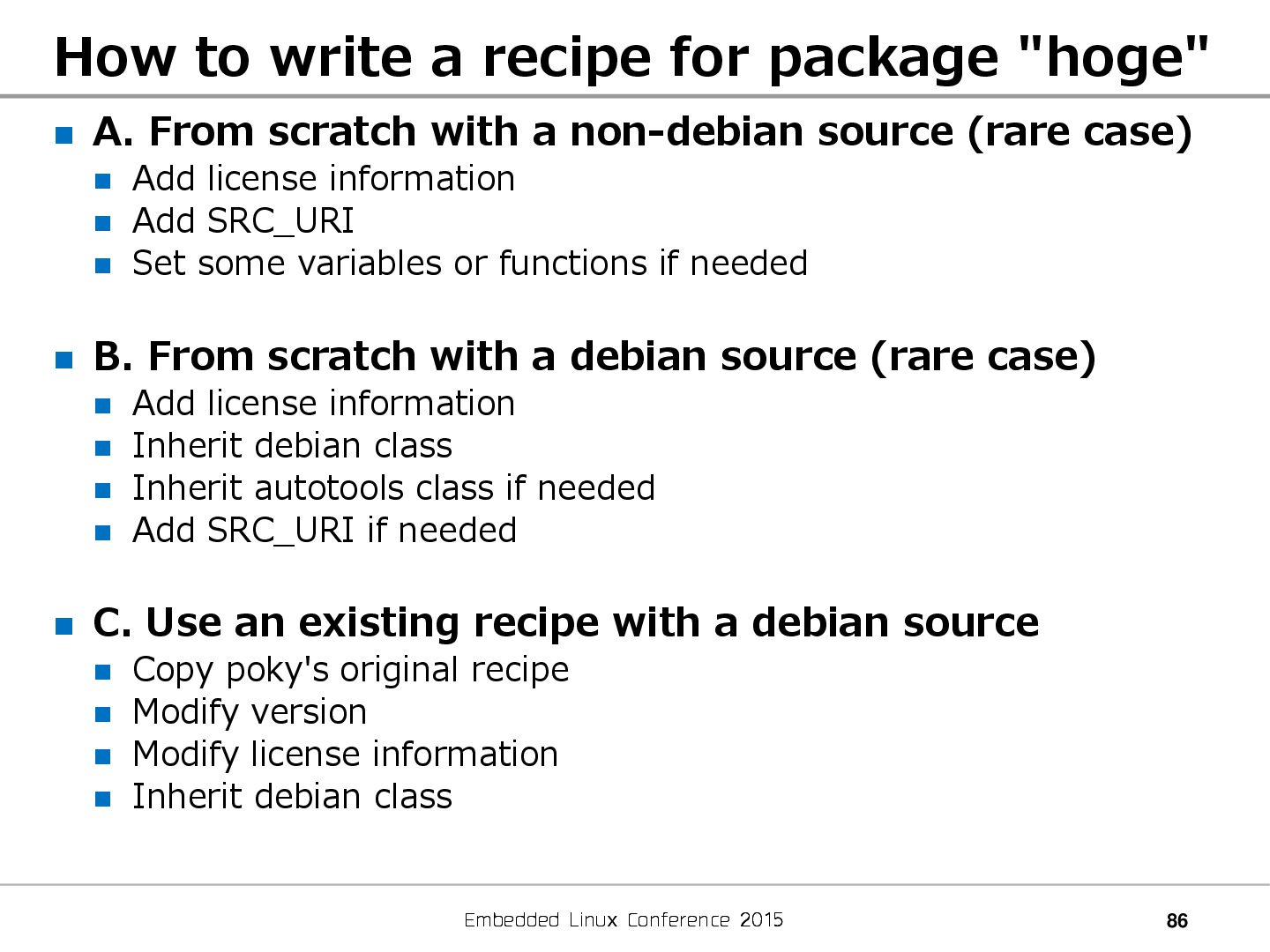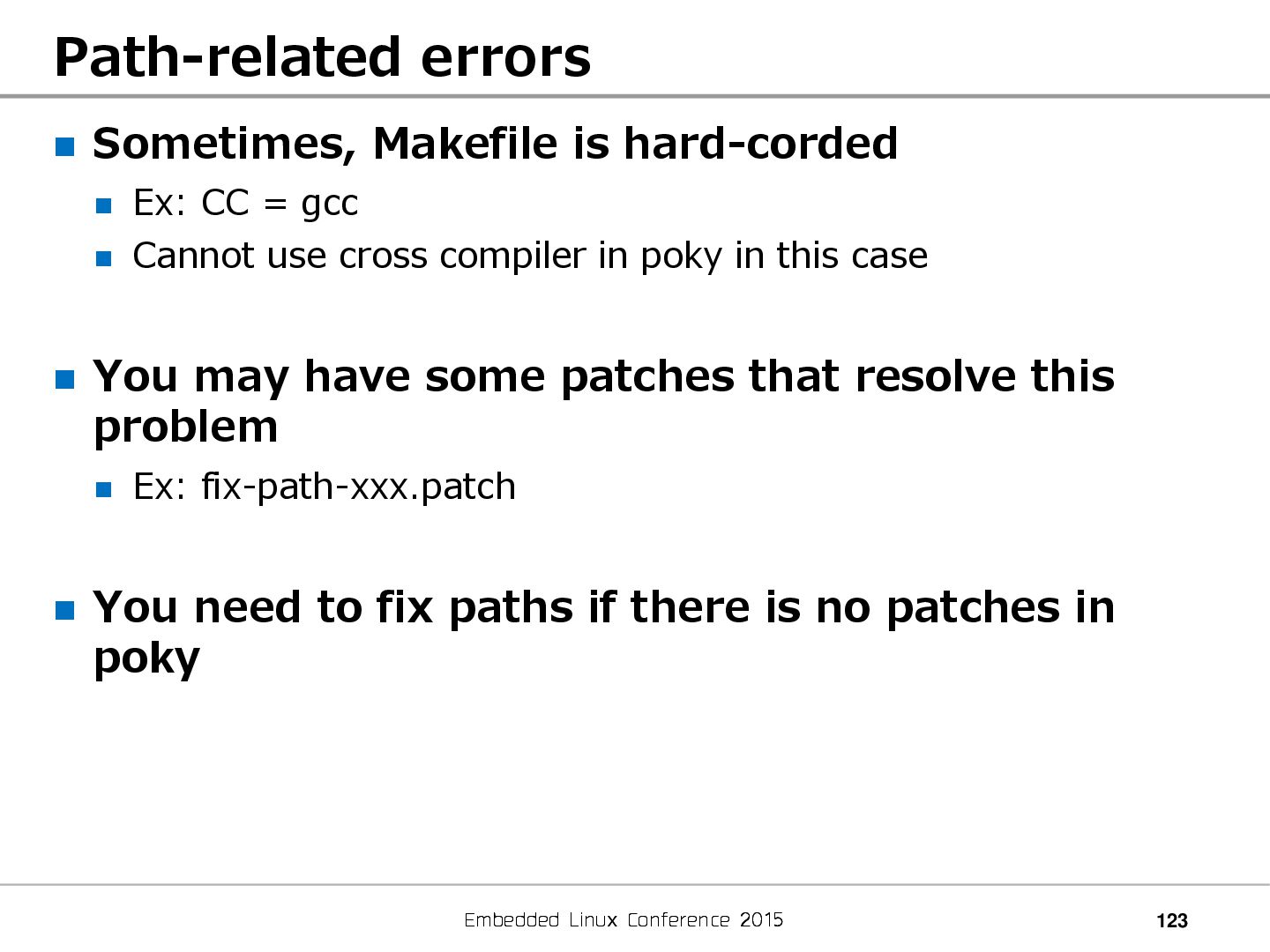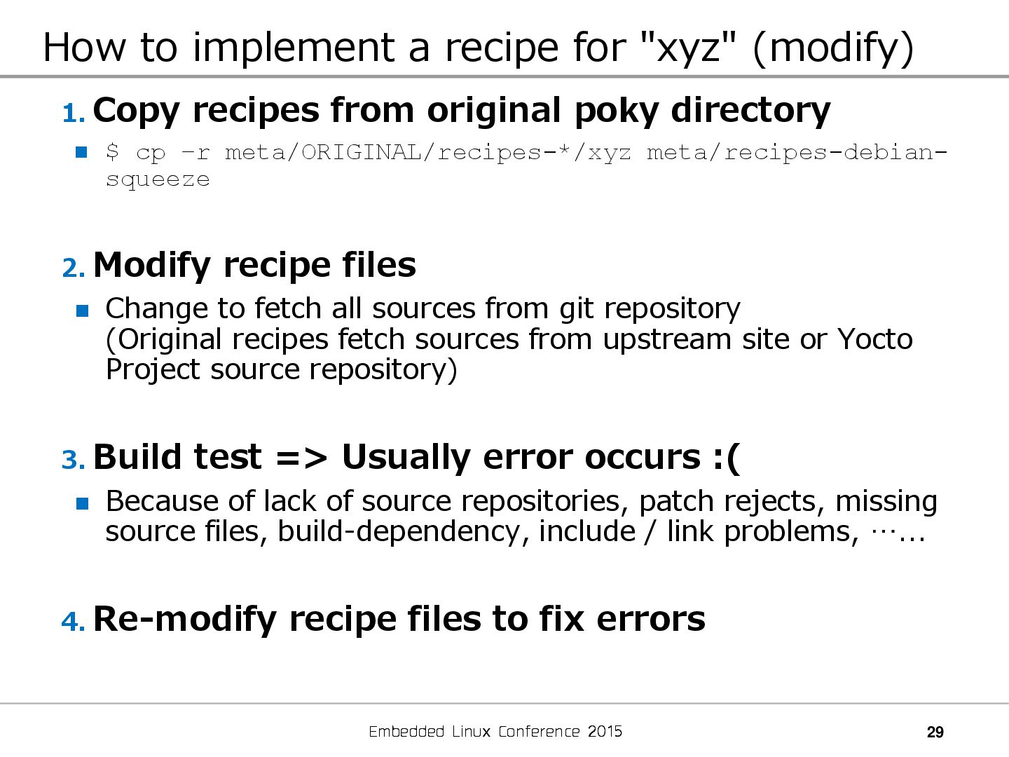 Inherit autotools class autotools class adds: do_configure, do_make, do_install, etc. for autotools-based sources Default functions are already defined in "base.bbclass", but some functions (do_configure, do_install, etc.) are empty Don't inherit autotools if the source code is not based on autotools Please implement do_configure, do_compile, do_install, etc. from scratch inherit autotools