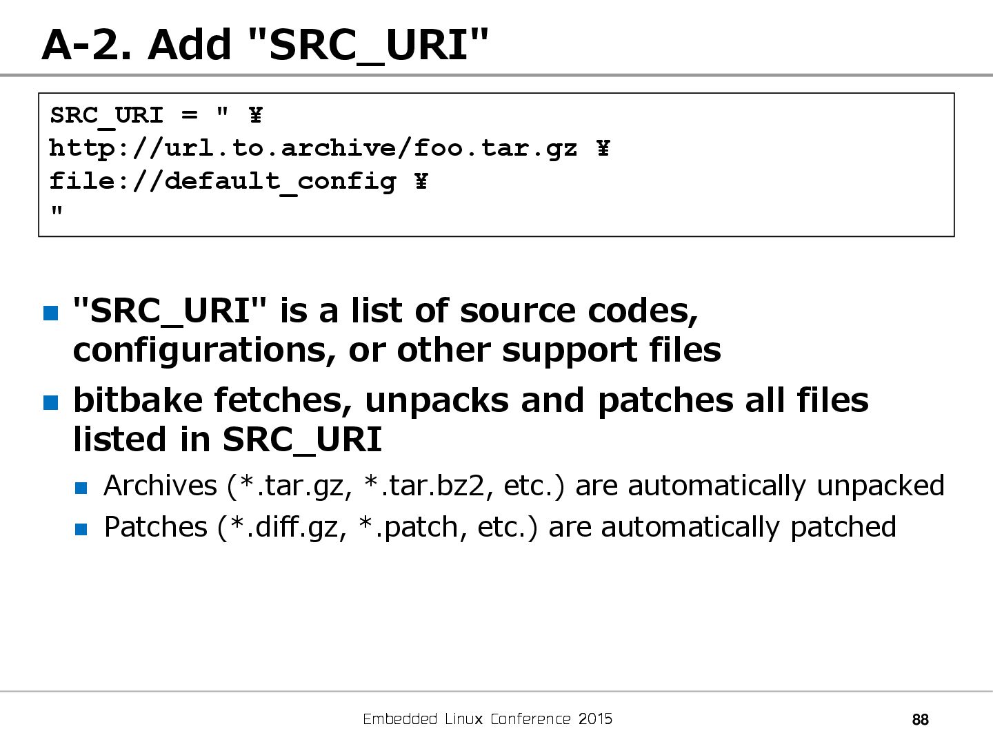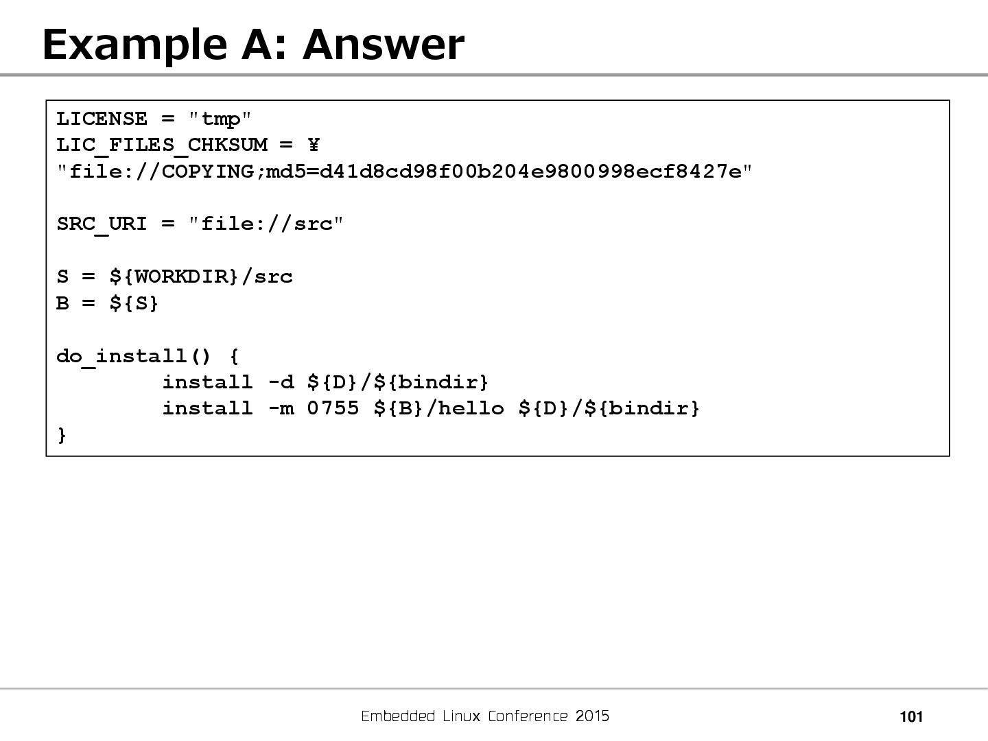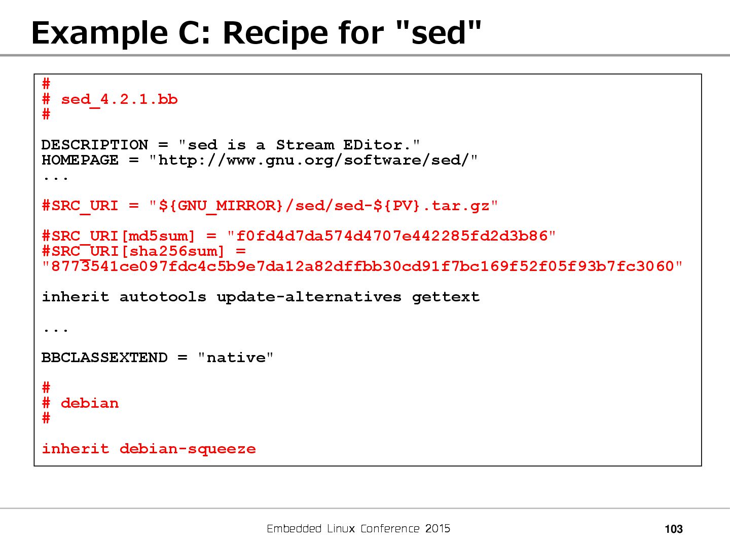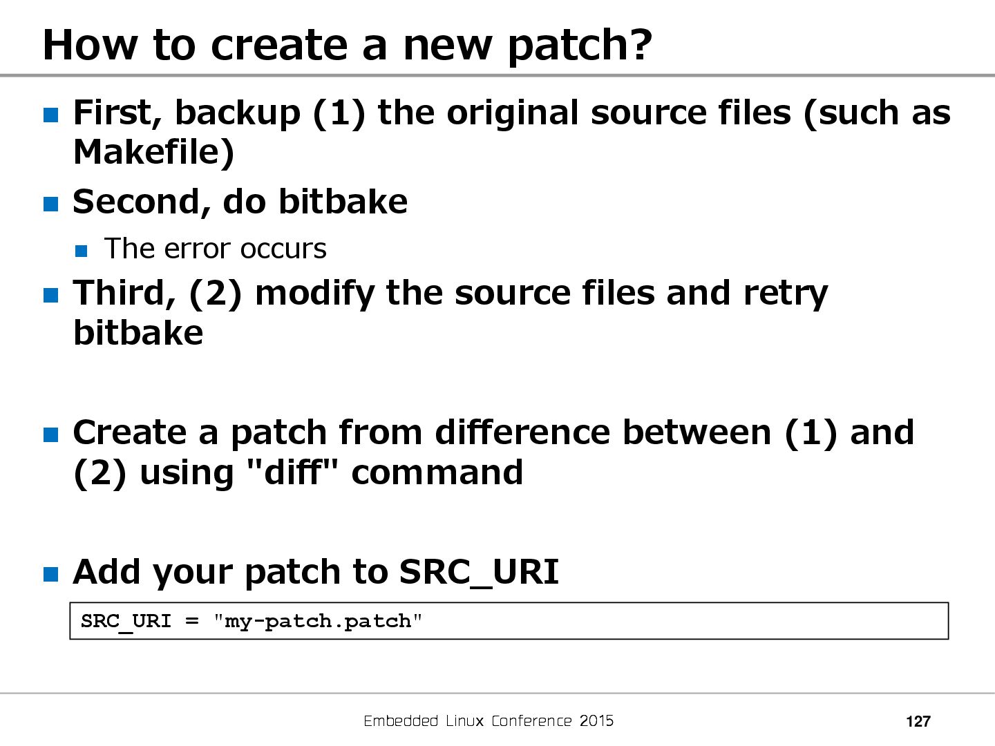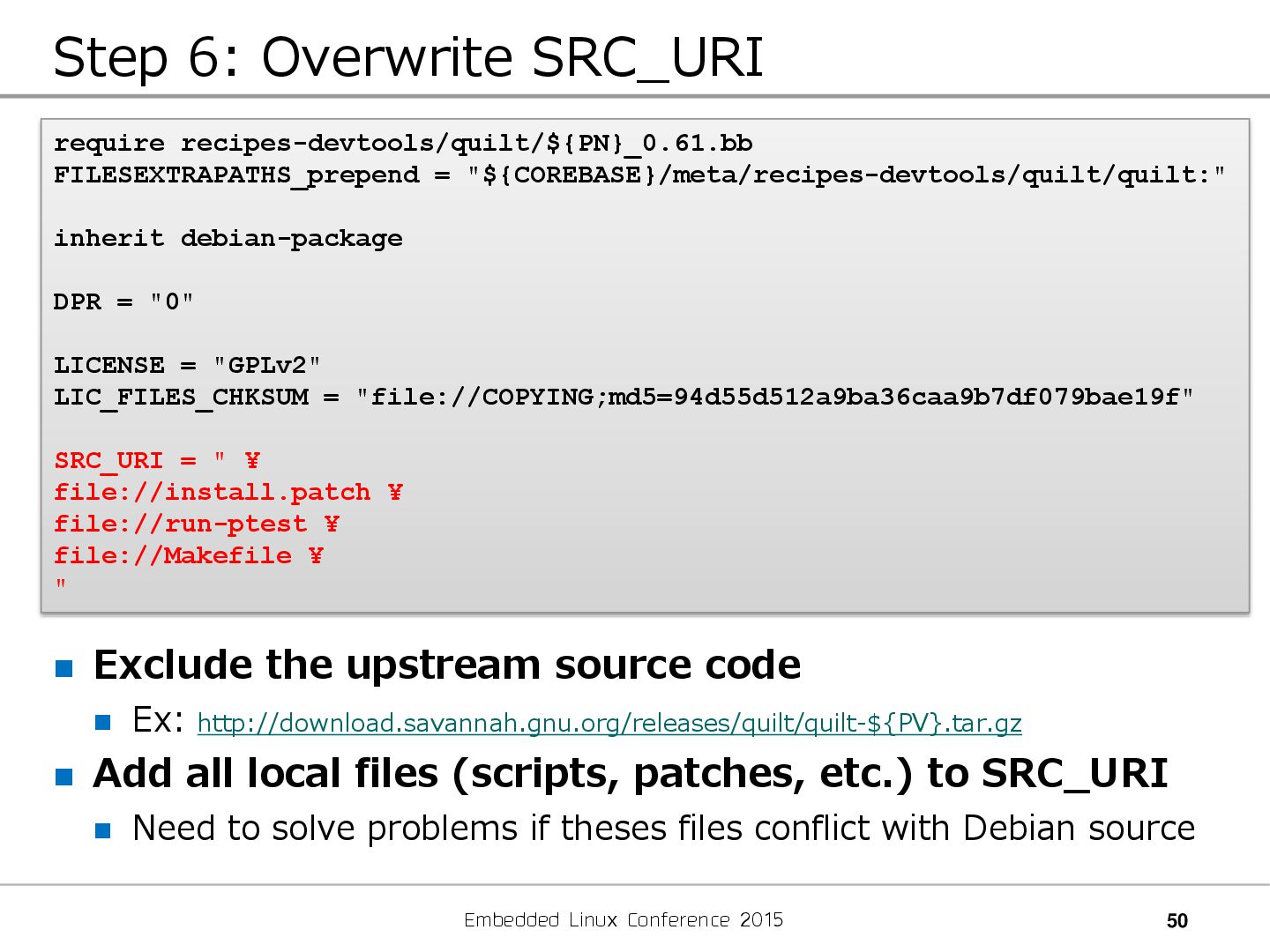 Inherit autotools class autotools class adds: do_configure, do_make, do_install, etc. for autotools-based sources Default functions are already defined in "base.bbclass", but some functions (do_configure, do_install, etc.) are empty Don't inherit autotools if the source code is not based on autotools Please implement do_configure, do_compile, do_install, etc. from scratch inherit autotools