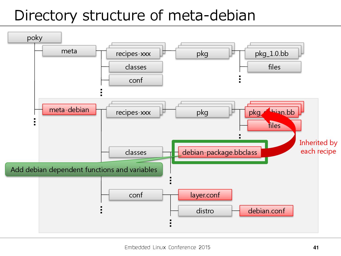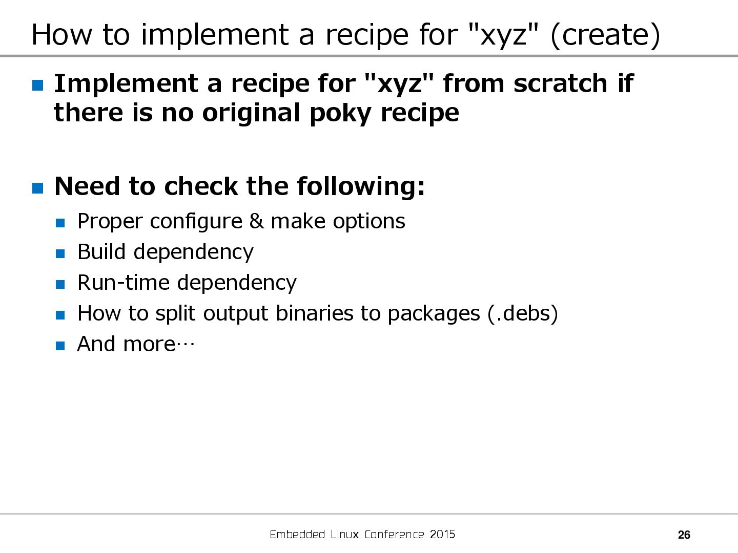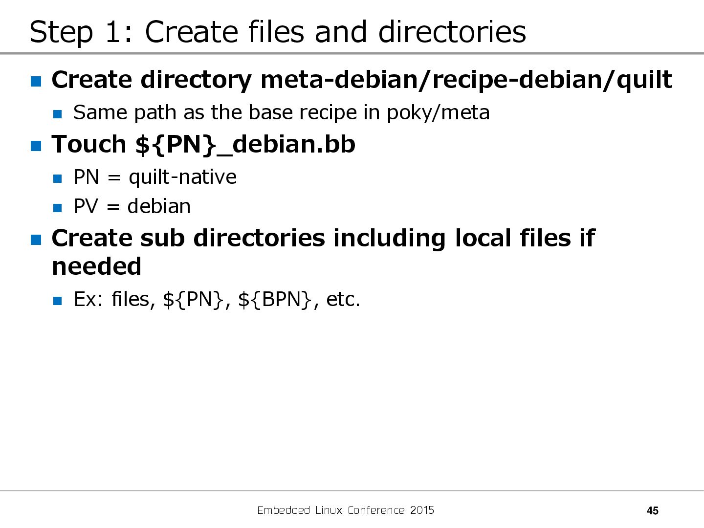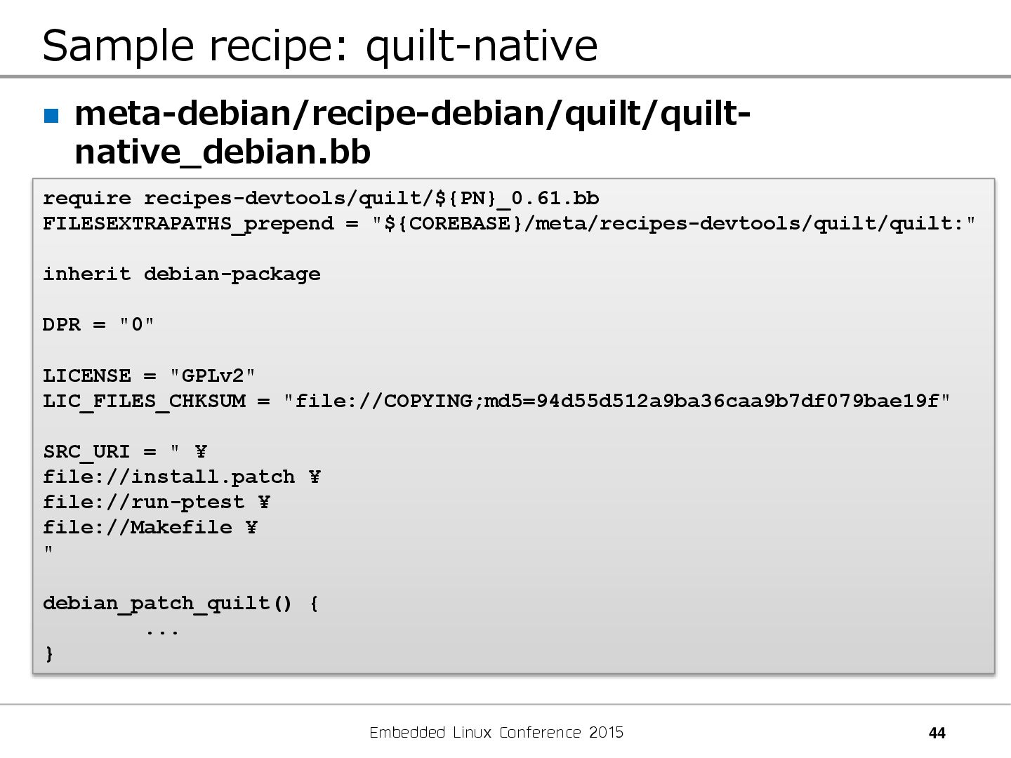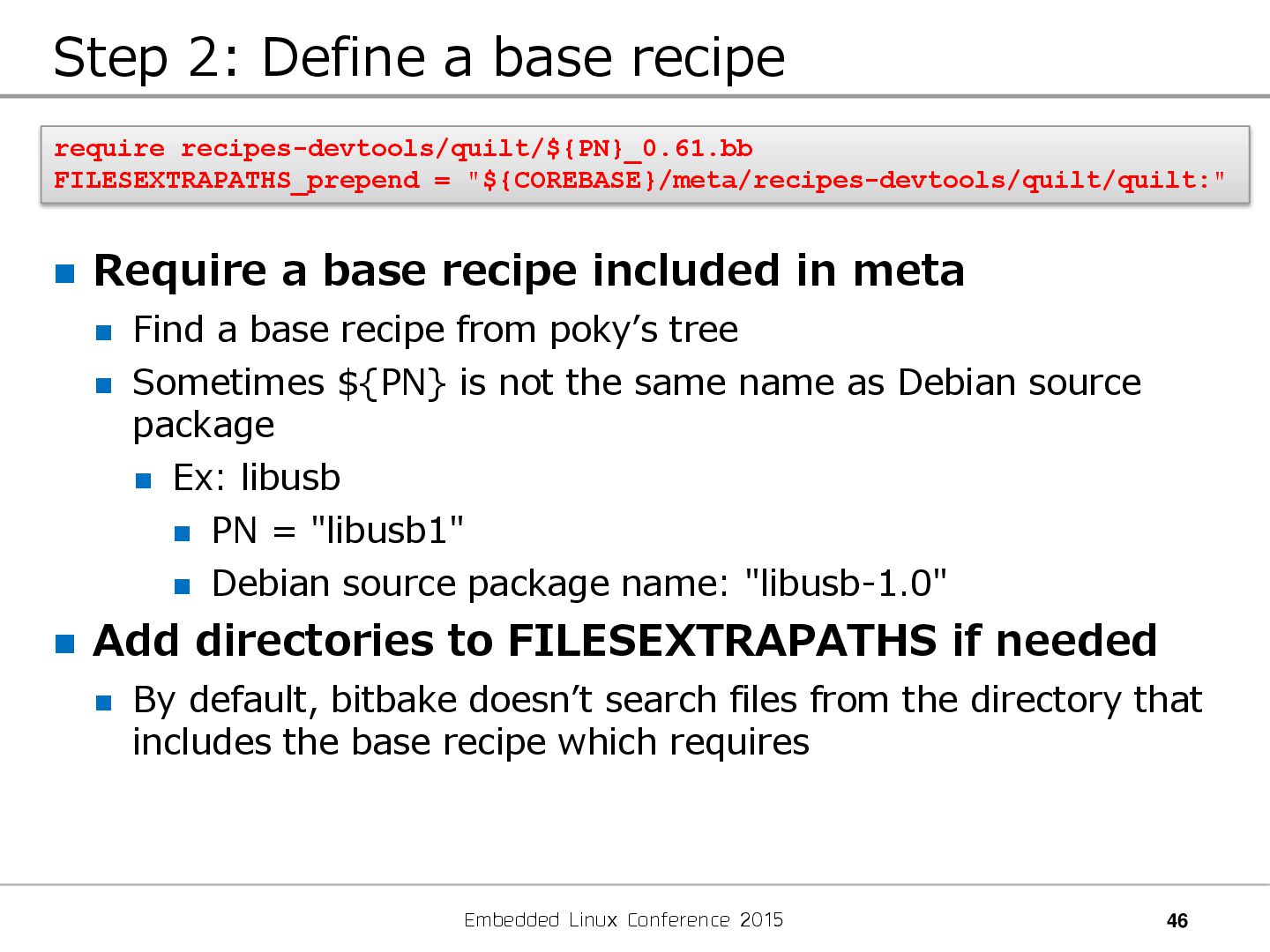 Inherit autotools class autotools class adds: do_configure, do_make, do_install, etc. for autotools-based sources Default functions are already defined in "base.bbclass", but some functions (do_configure, do_install, etc.) are empty Don't inherit autotools if the source code is not based on autotools Please implement do_configure, do_compile, do_install, etc. from scratch inherit autotools