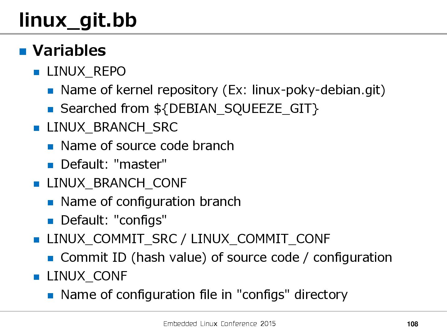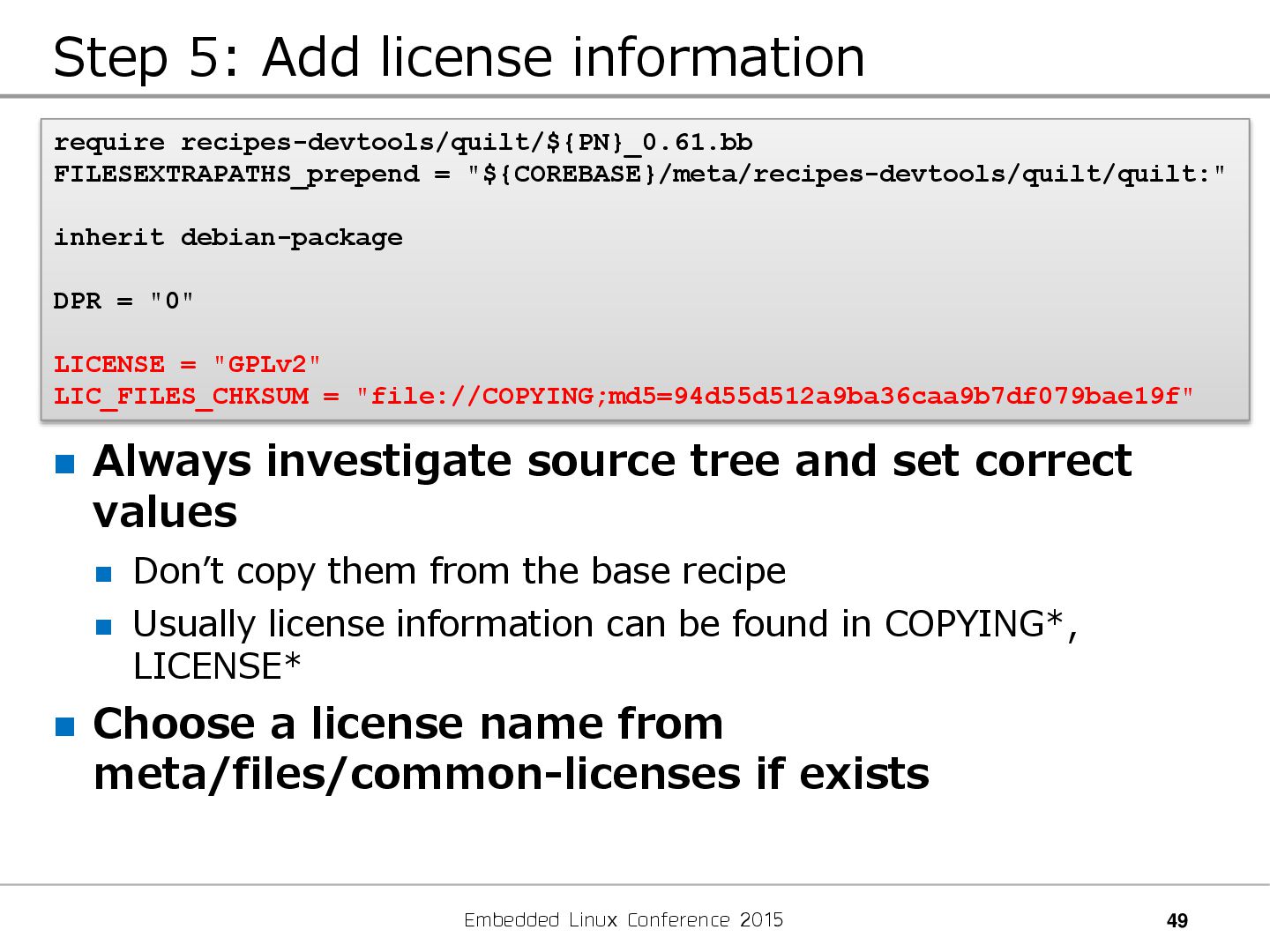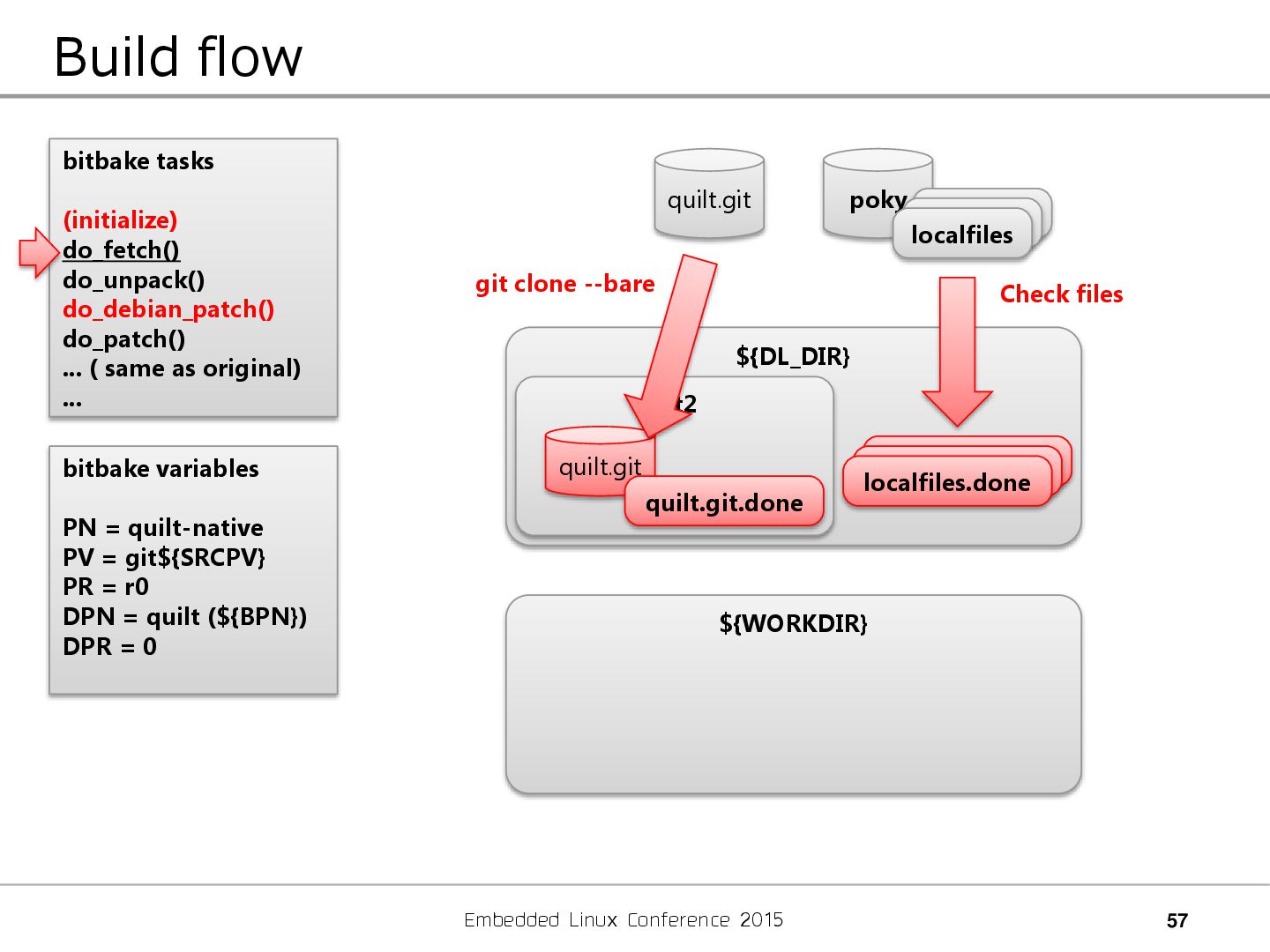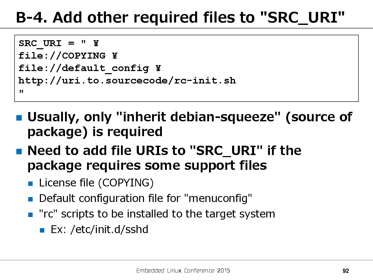 Inherit autotools class autotools class adds: do_configure, do_make, do_install, etc. for autotools-based sources Default functions are already defined in "base.bbclass", but some functions (do_configure, do_install, etc.) are empty Don't inherit autotools if the source code is not based on autotools Please implement do_configure, do_compile, do_install, etc. from scratch inherit autotools