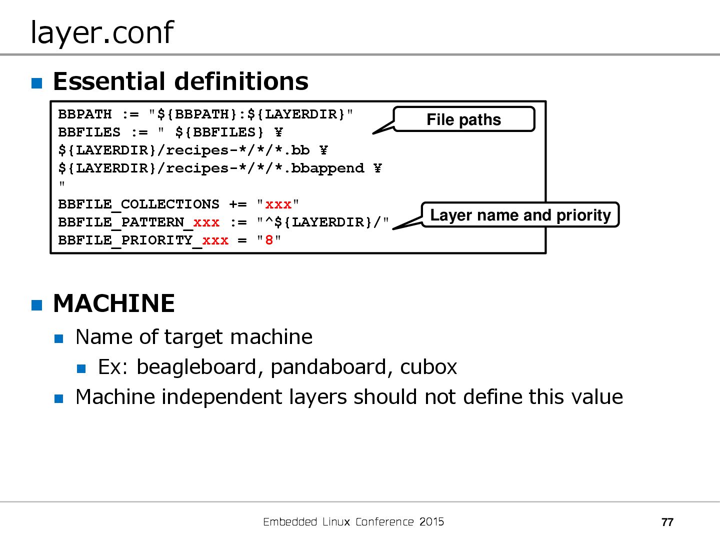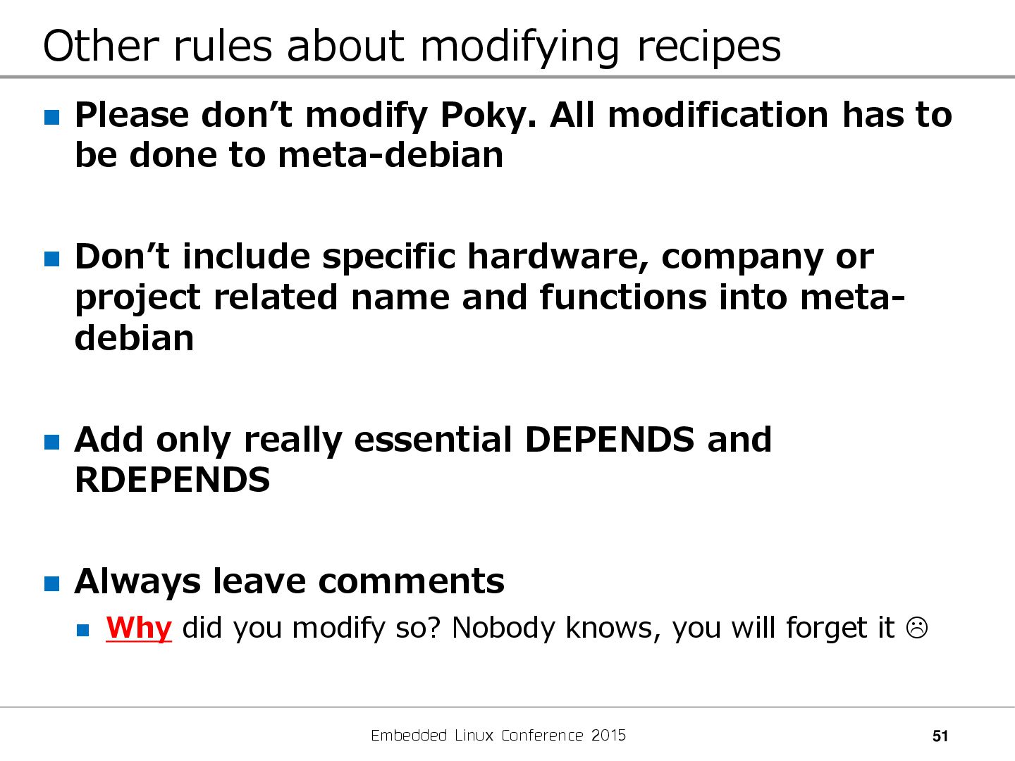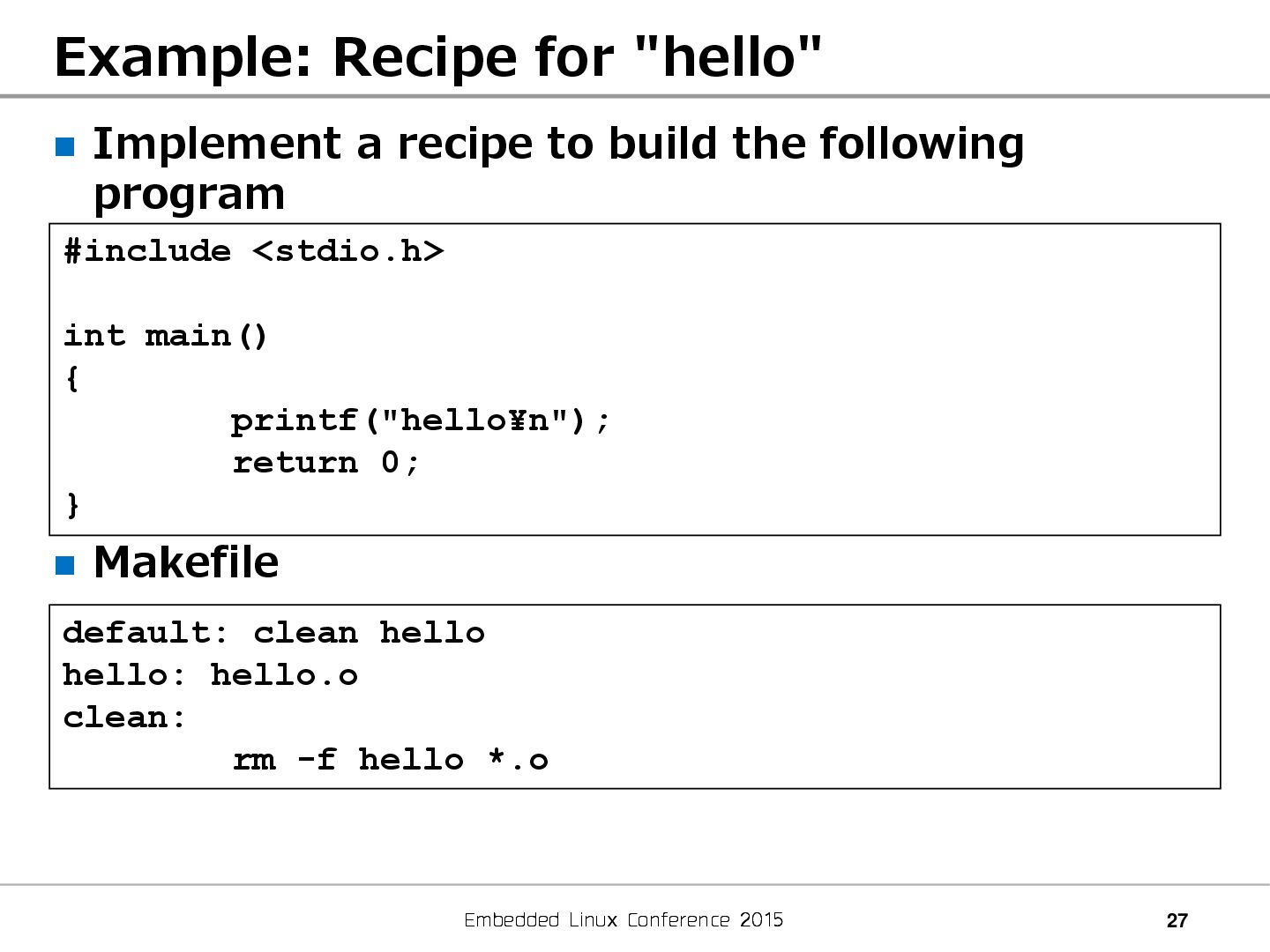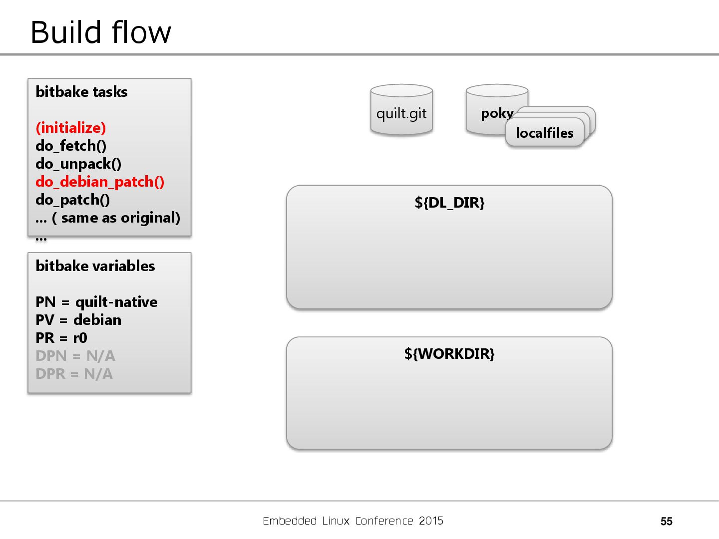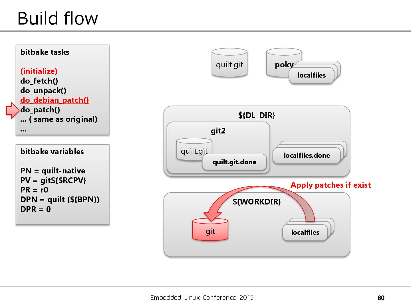 Inherit autotools class autotools class adds: do_configure, do_make, do_install, etc. for autotools-based sources Default functions are already defined in "base.bbclass", but some functions (do_configure, do_install, etc.) are empty Don't inherit autotools if the source code is not based on autotools Please implement do_configure, do_compile, do_install, etc. from scratch inherit autotools