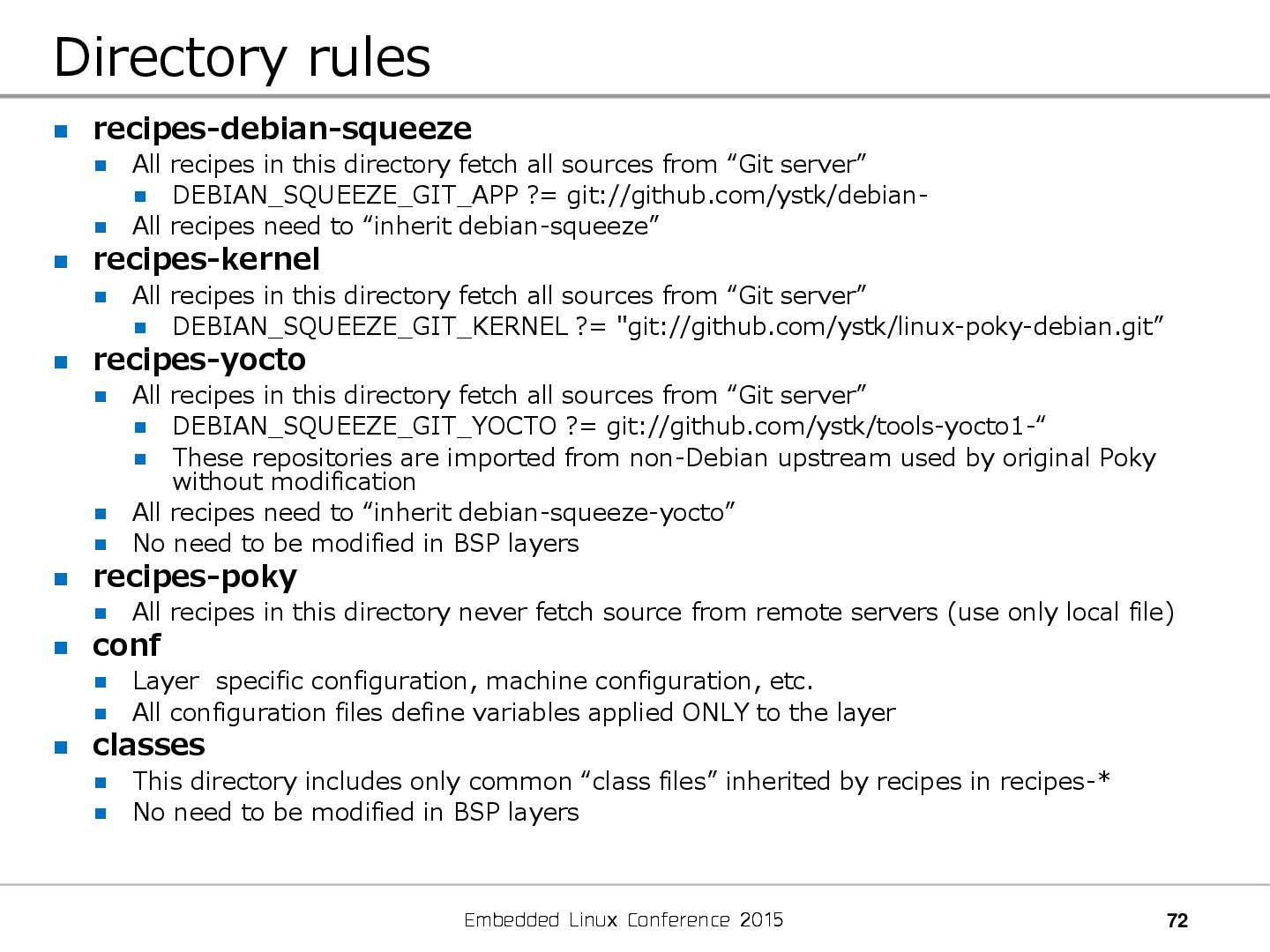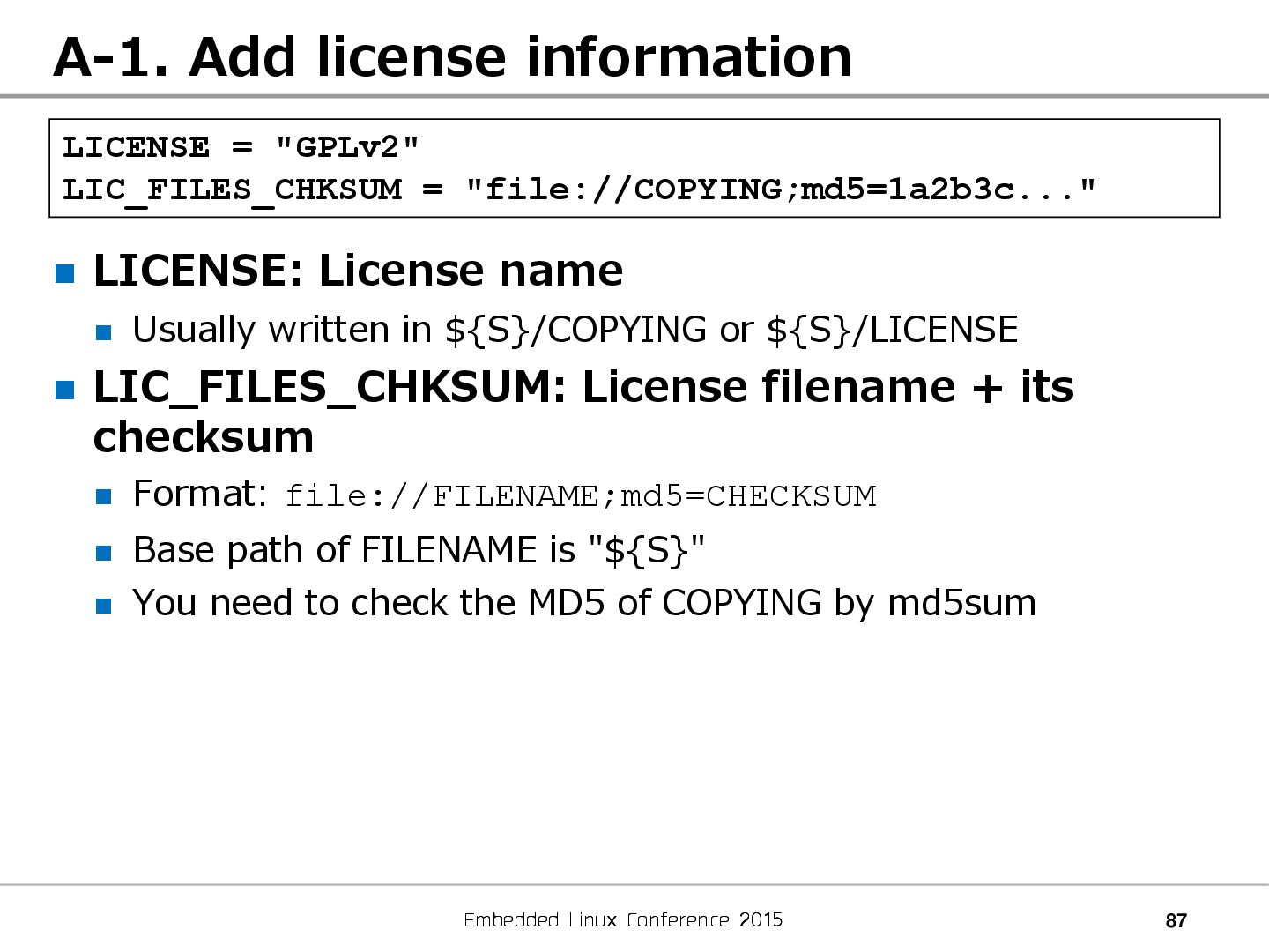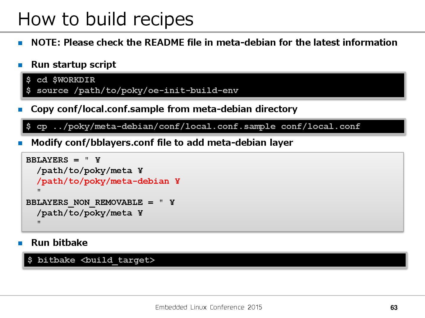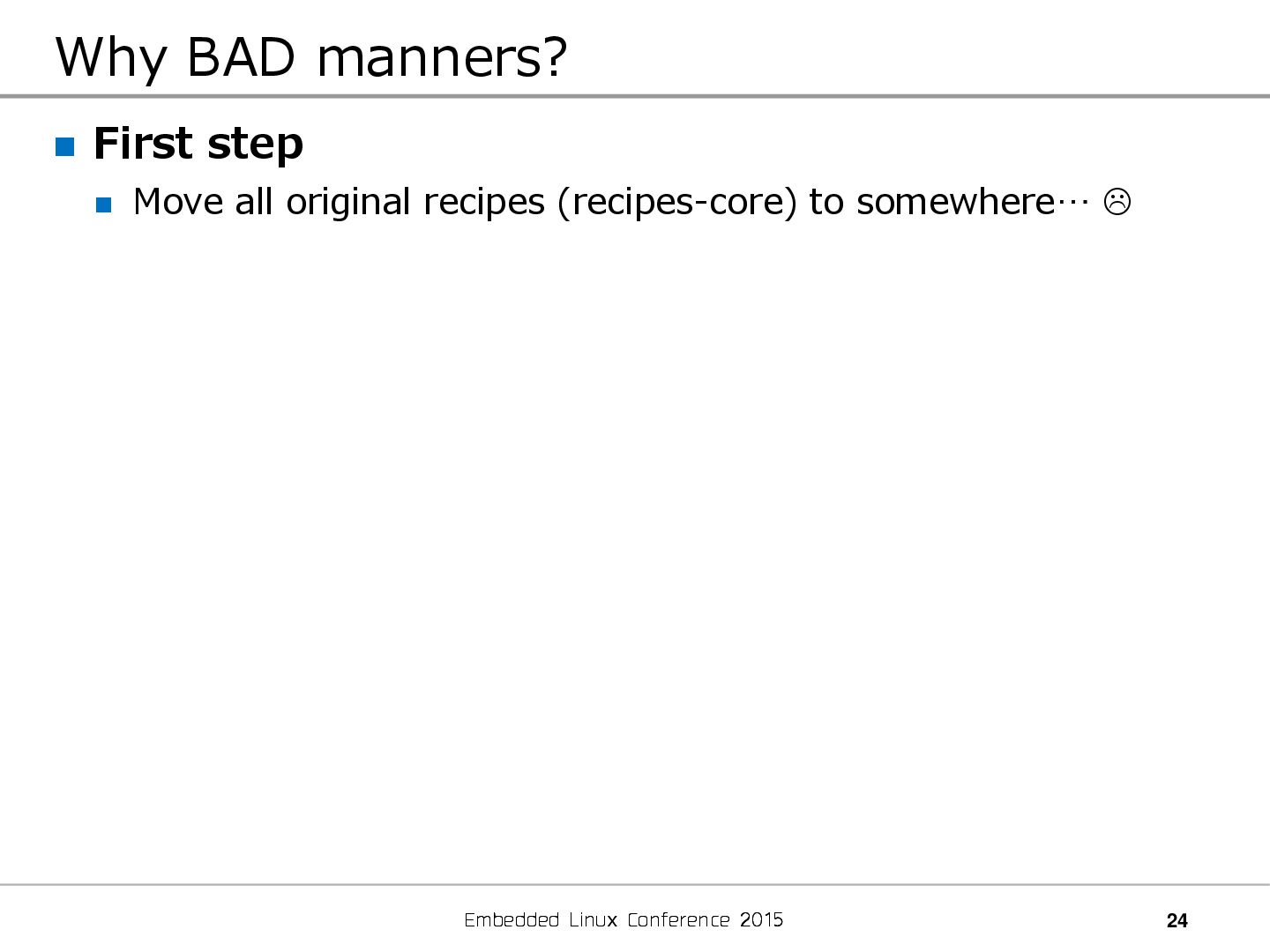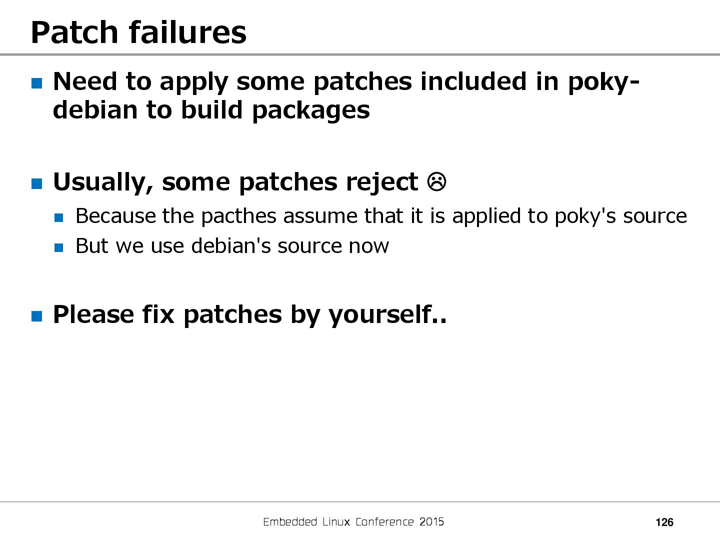 Inherit autotools class autotools class adds: do_configure, do_make, do_install, etc. for autotools-based sources Default functions are already defined in "base.bbclass", but some functions (do_configure, do_install, etc.) are empty Don't inherit autotools if the source code is not based on autotools Please implement do_configure, do_compile, do_install, etc. from scratch inherit autotools