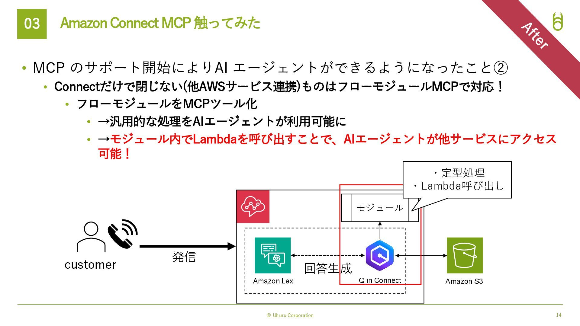 15. © Uhuru Corporation • Amazon Connect が MCPのサポートを開始! • 従来より複雑な要件(問い合わせ)に対応したAIエージェントを実装可能に