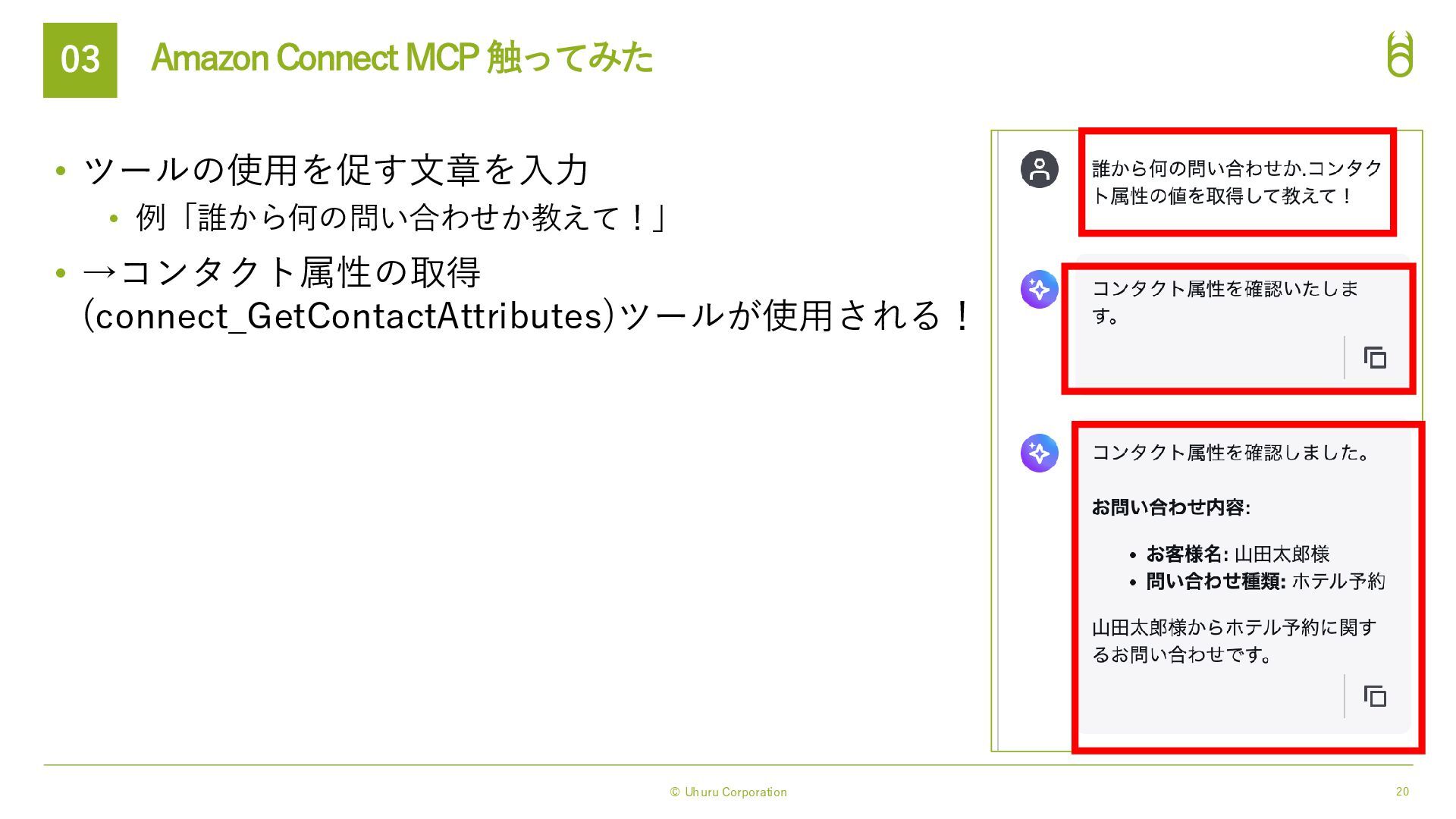 13. © Uhuru Corporation 20 Amazon Connect MCP 触ってみた 03 •