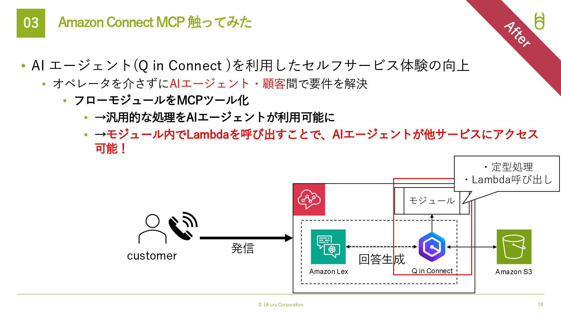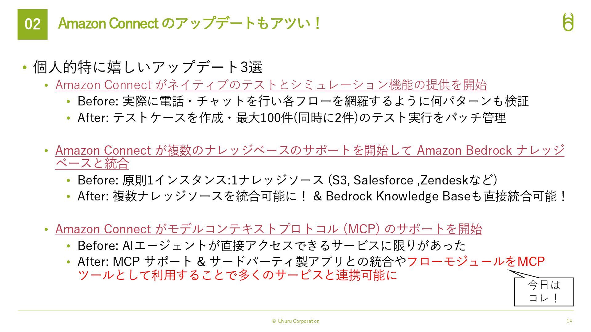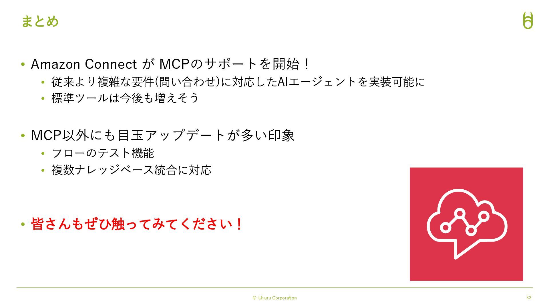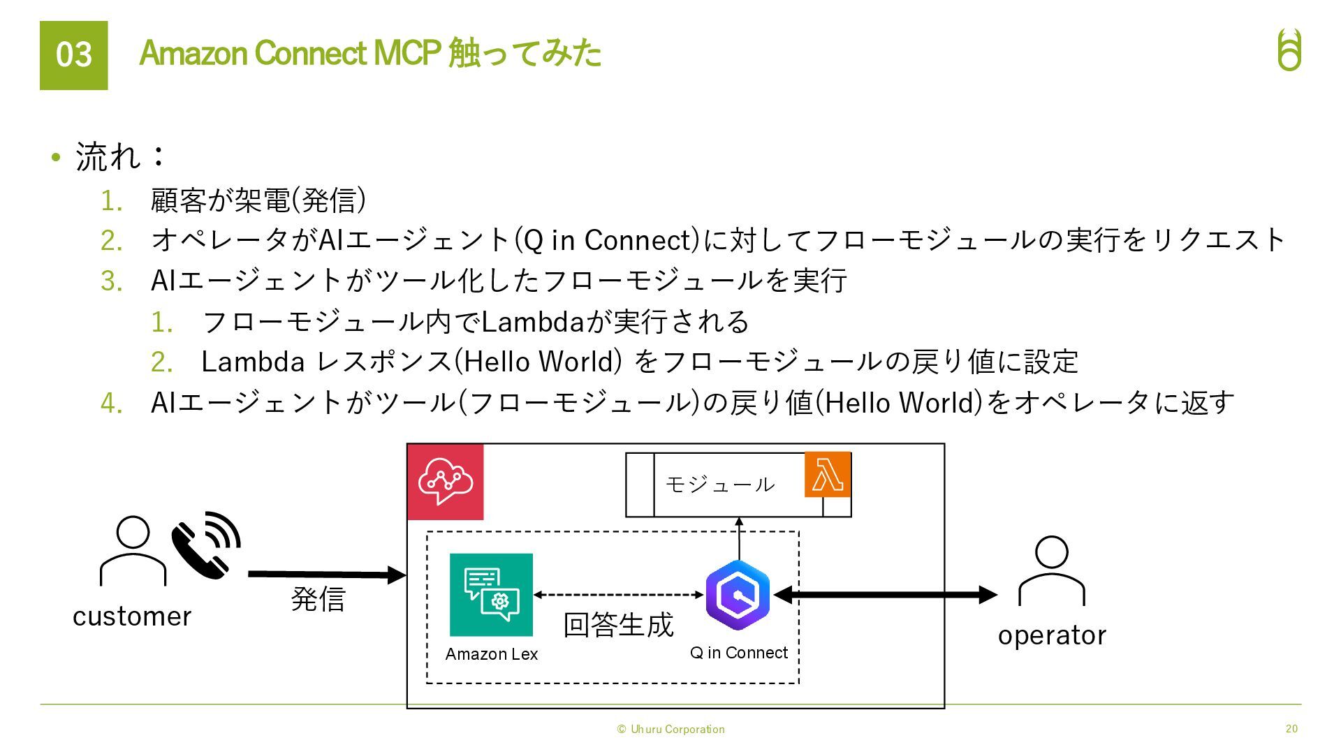 20. © Uhuru Corporation • Amazon Connect が MCPのサポートを開始! • 従来より複雑な要件(問い合わせ)に対応したAIエージェントを実装可能に