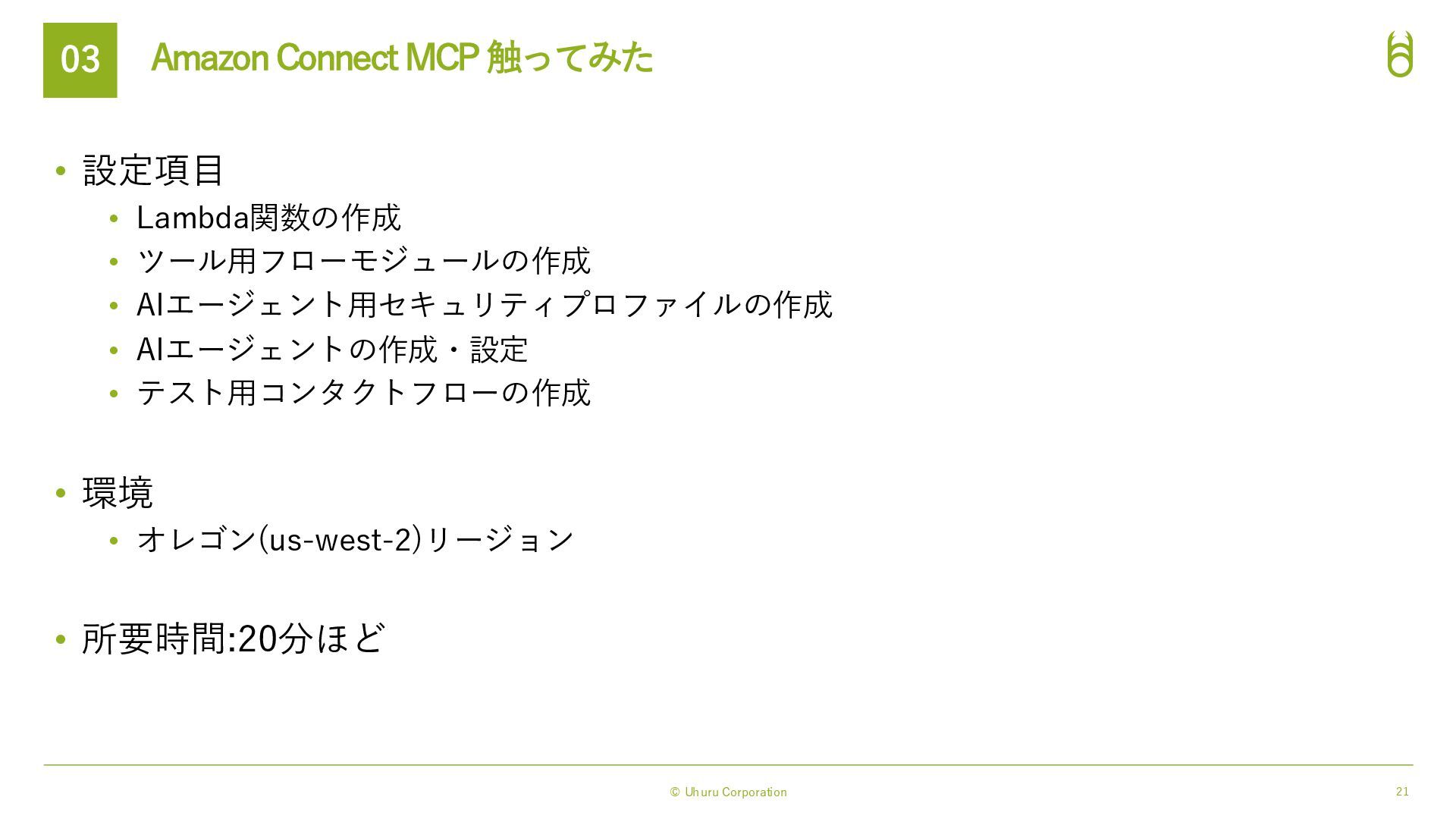 11. © Uhuru Corporation 21 Amazon Connect MCP 触ってみた 03 •