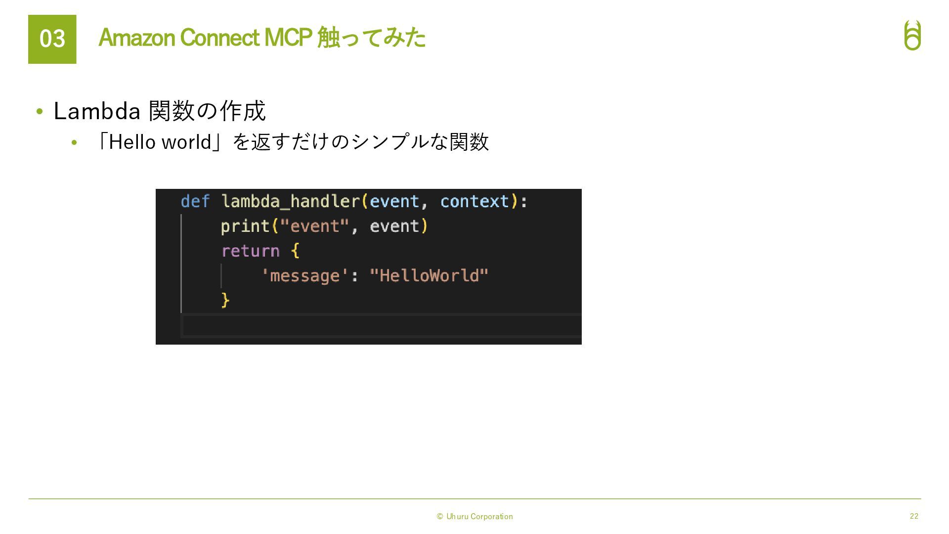 12. © Uhuru Corporation 22 Amazon Connect MCP 触ってみた 03 •