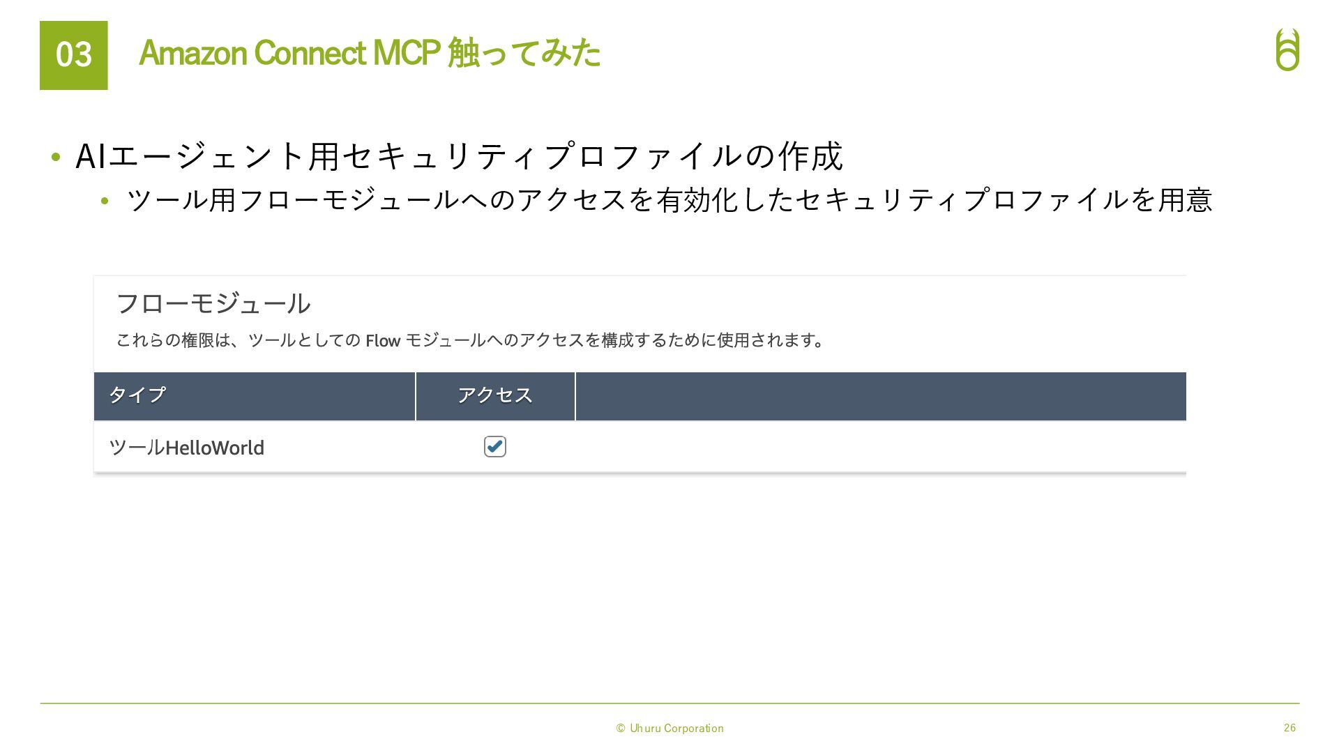14. © Uhuru Corporation 26 Amazon Connect MCP 触ってみた 03 •