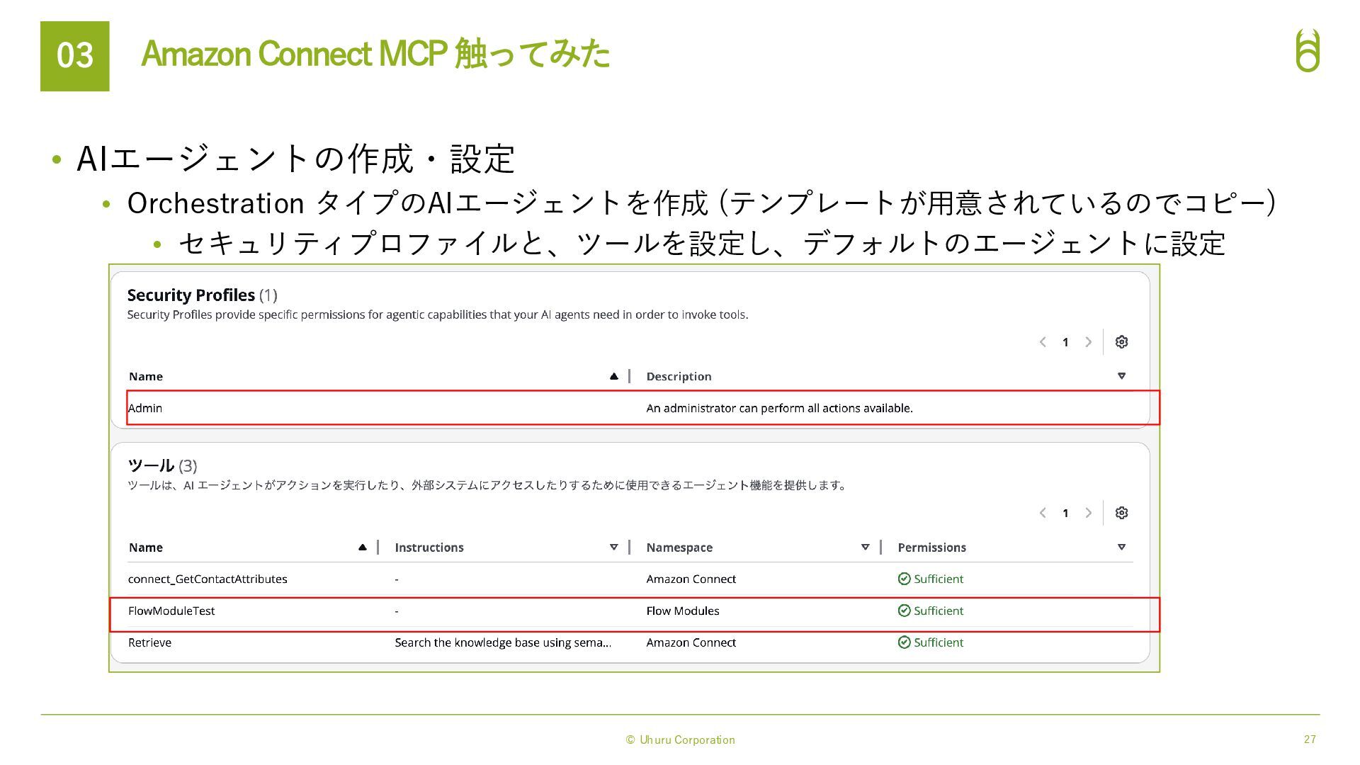 15. © Uhuru Corporation 27 Amazon Connect MCP 触ってみた 03 •