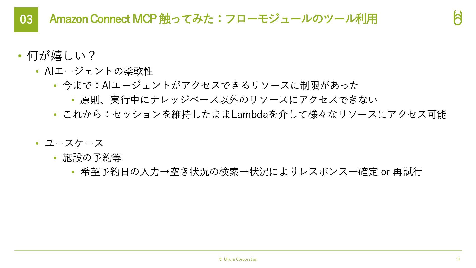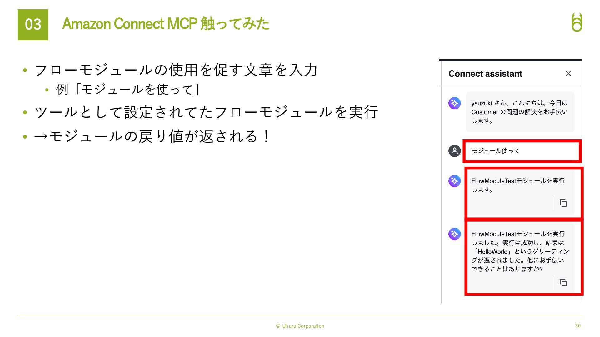 19. © Uhuru Corporation 31 Amazon Connect MCP 触ってみた:フローモジュールのツール利用 03 •