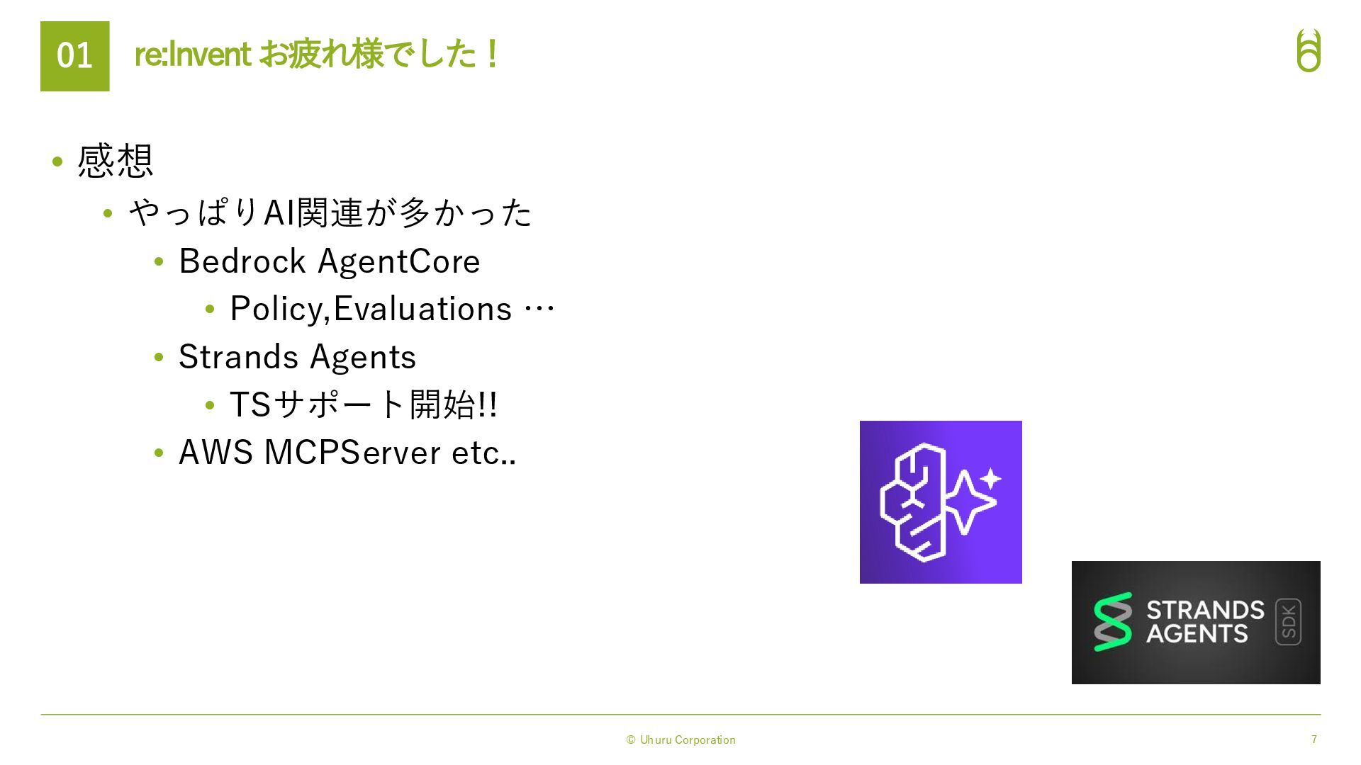 3. © Uhuru Corporation 7 re:Invent お疲れ様でした! 01 • 感想 •