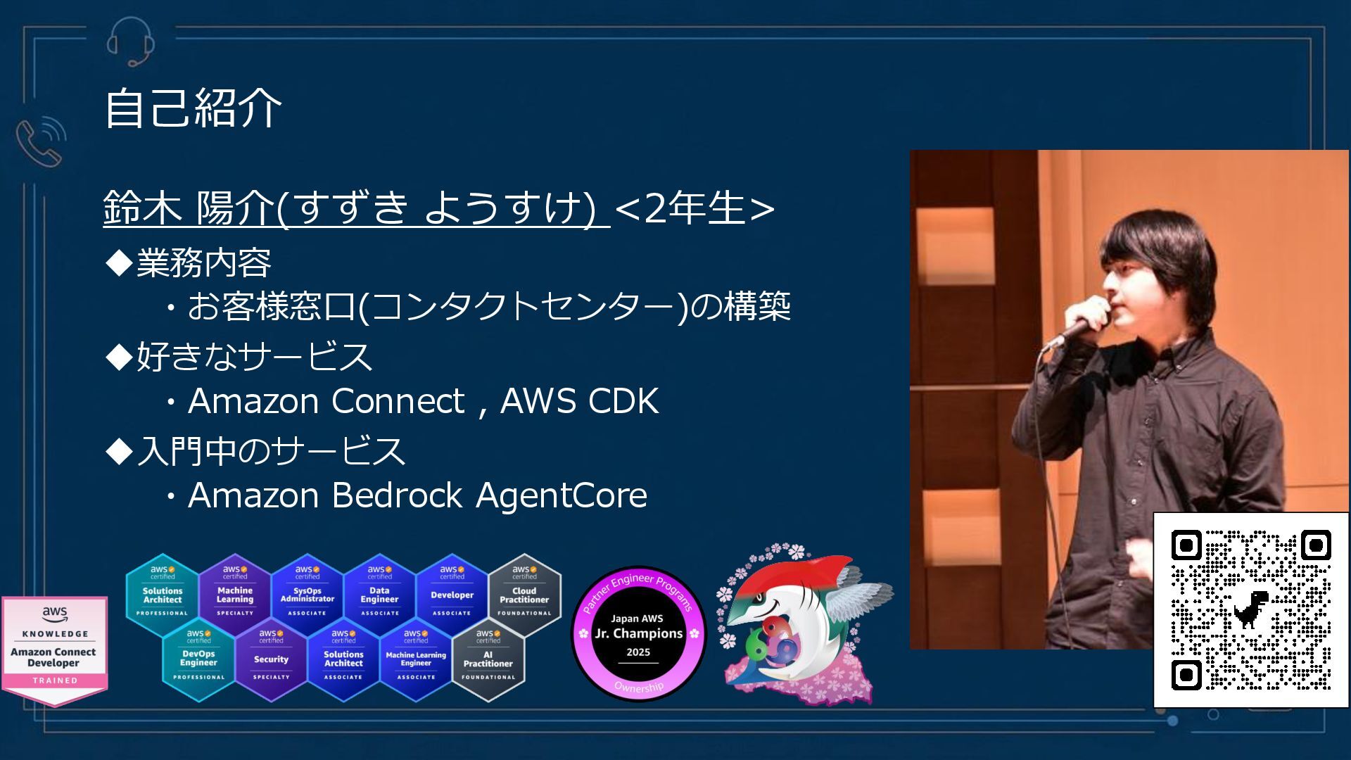 自己紹介 鈴木 陽介(すずき ようすけ) <2年生> ◆業務内容 ・お客様窓口(コンタクトセンター)の構築 ◆好きなサービス ・Amazon Connect
