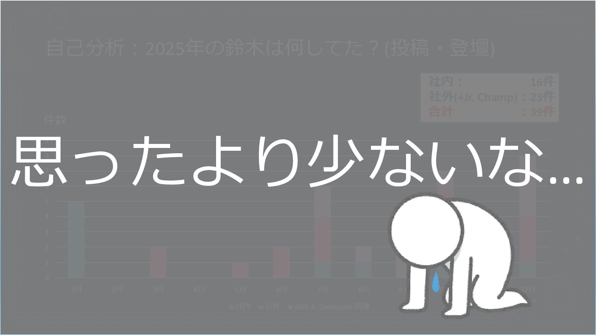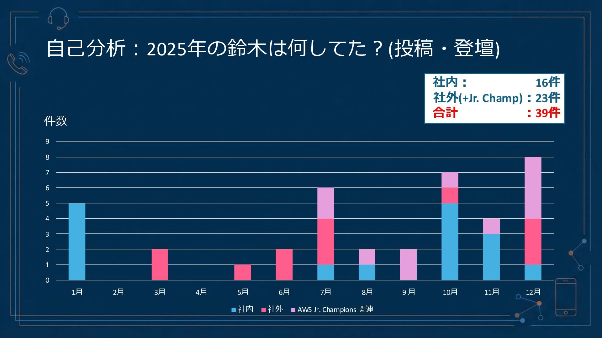 社内: 16件 社外(+Jr. Champ):23件 合計 :39件 自己分析:2025年の鈴木は何してた?(投稿・登壇) 0 1 2