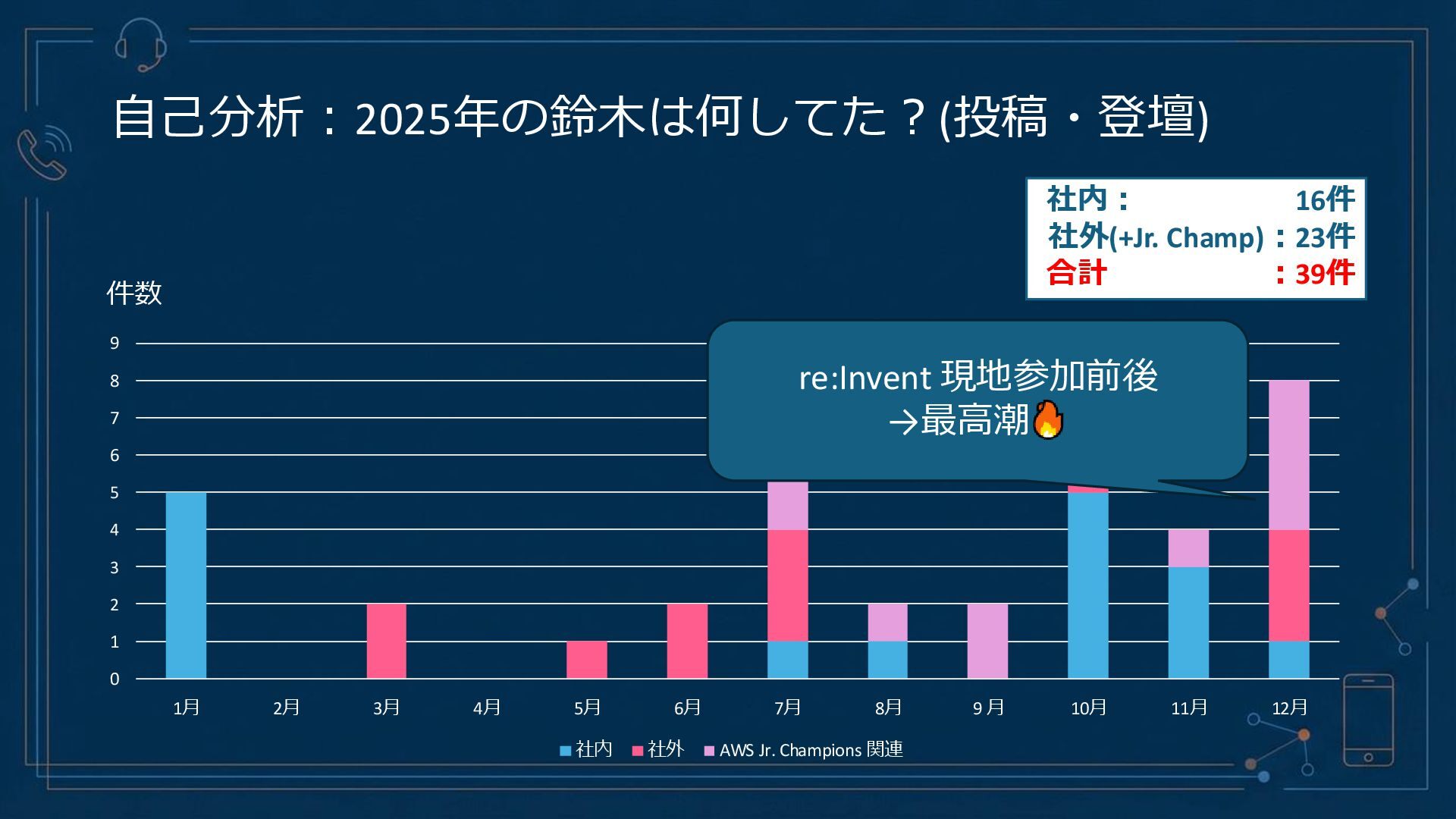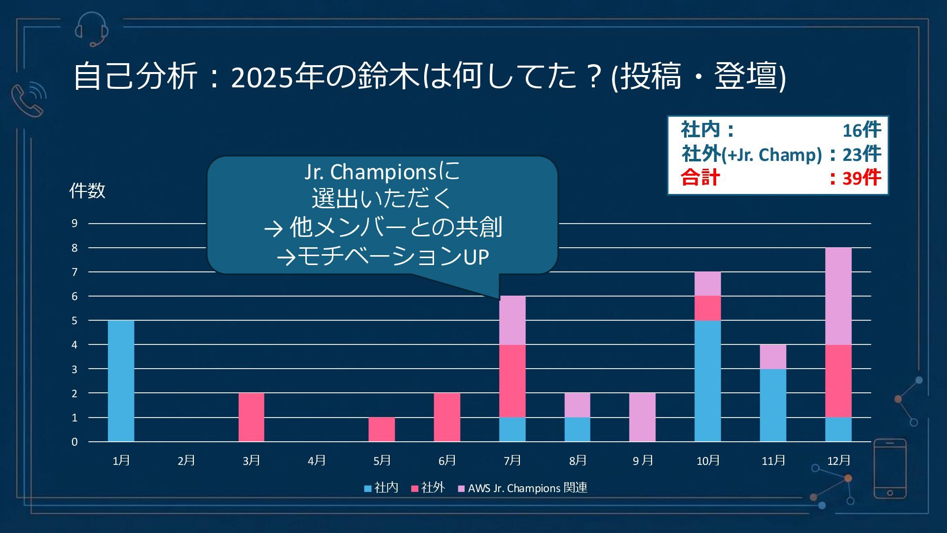 9 1月 2月 3月 4月 5月 6月 7月 8月 9 月 10月 11月 12月 件数 社内 社外 AWS Jr. Champions 関連 社内: 16件 社外(+Jr. Champ):23件 合計 :39件 re:Invent 現地参加前後 →最高潮