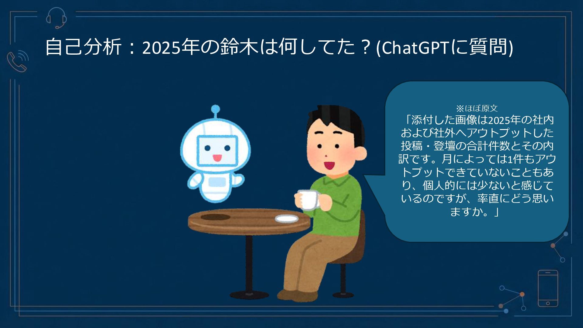 自己分析:2025年の鈴木は何してた?(ChatGPTに質問) ※ほぼ原文 「添付した画像は2025年の社内 および社外へアウトプットした 投稿・登壇の合計件数とその内 訳です。月によっては1件もアウ トプットできていないこともあ り、個人的には少ないと感じて いるのですが、率直にどう思い ますか。」