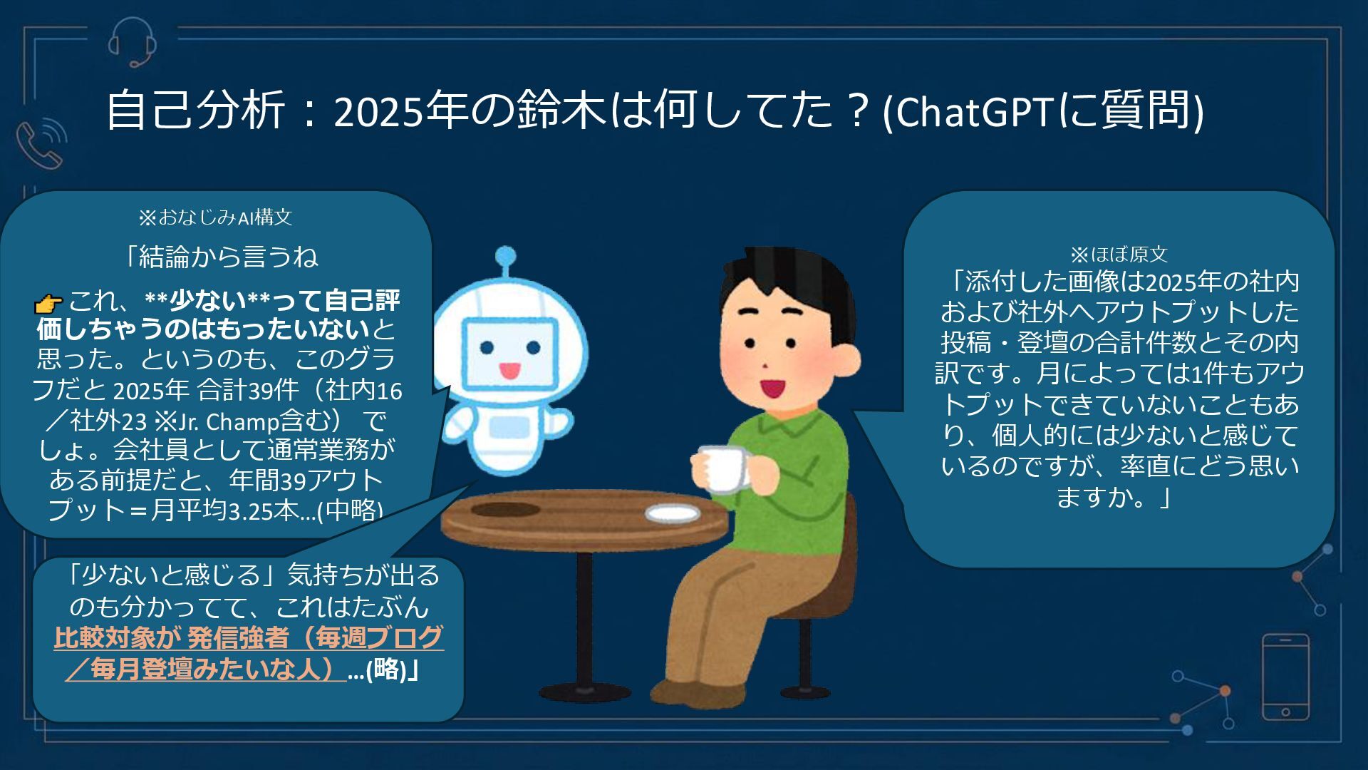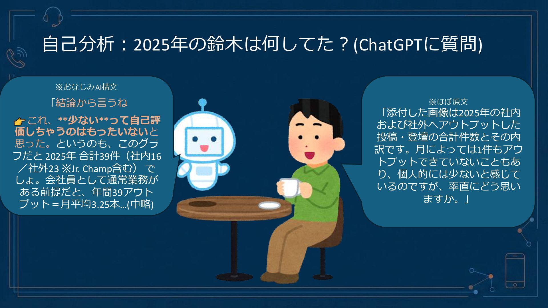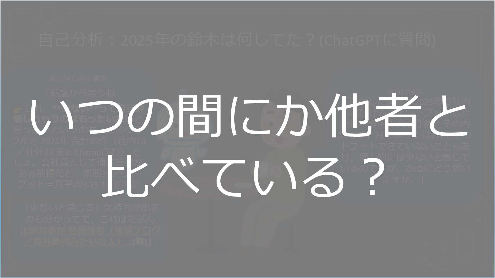 ※おなじみの構文 「結論から言うね これ、**少ない**って自己評 価しちゃうのはもったいないと 思った。というのも、このグラ フだと 2025年 合計39件(社内16 /社外23 ※Jr. Champ含む) で しょ。会社員として通常業務が ある前提だと、年間39アウト プット=月平均3.25本…(中略) 「少ないと感じる」気持ちが出る のも分かってて、これはたぶん 比較対象が 発信強者(毎週ブログ /毎月登壇みたいな人)…(略)」 いつの間にか他者と 比べている?