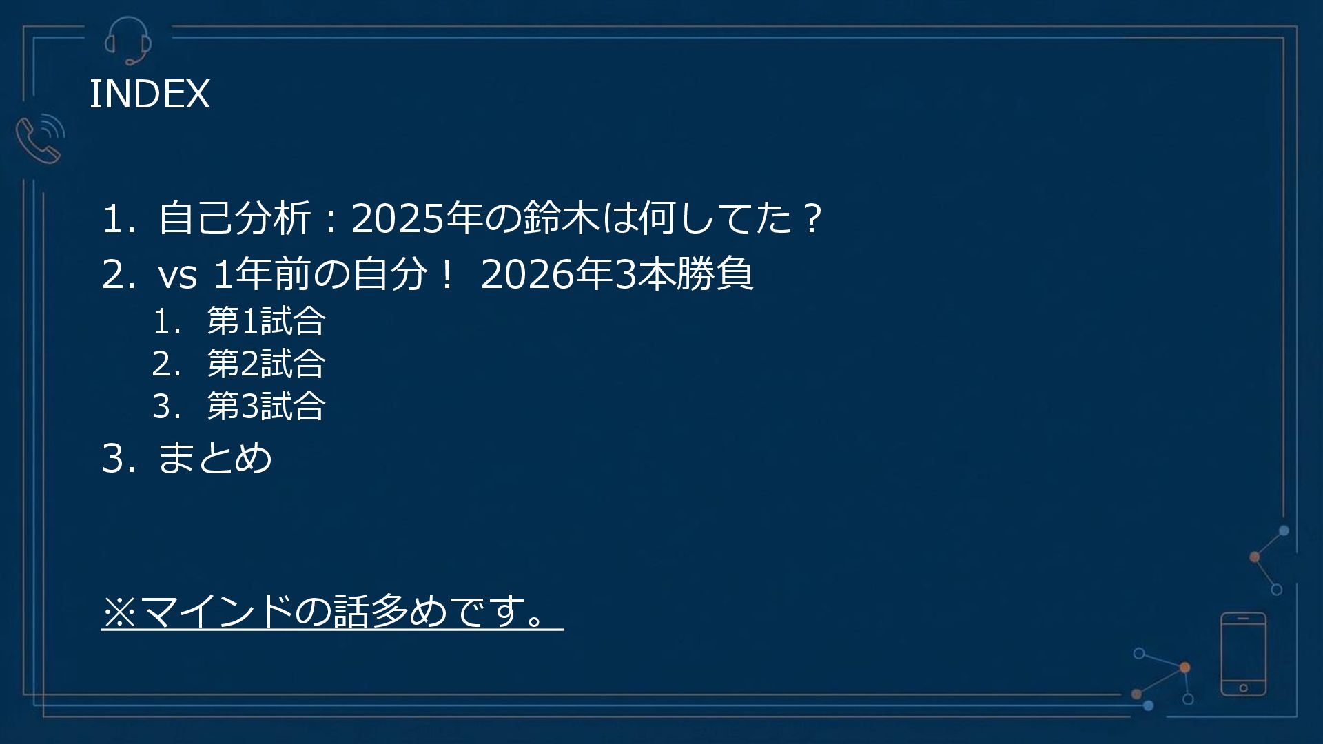 INDEX 1. 自己分析:2025年の鈴木は何してた? 2. vs 1年前の自分! 2026年3本勝負 1. 第1試合 2.