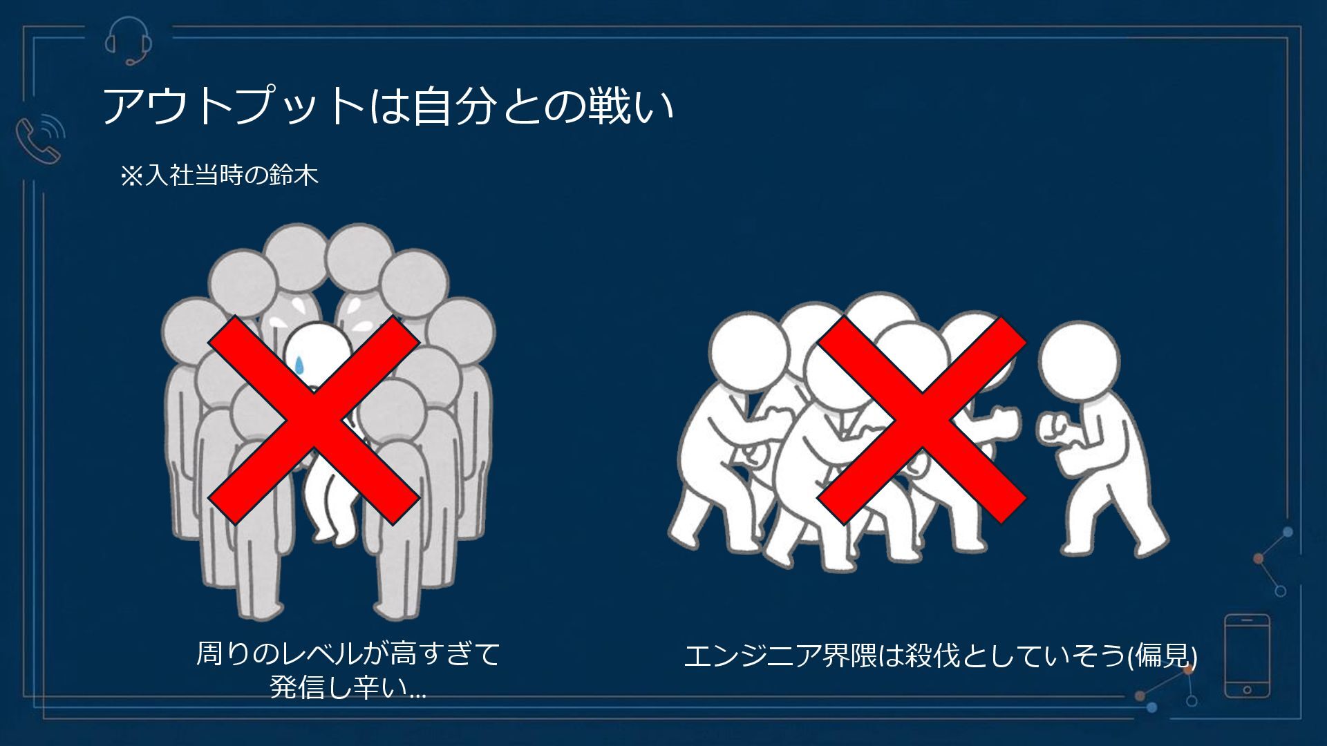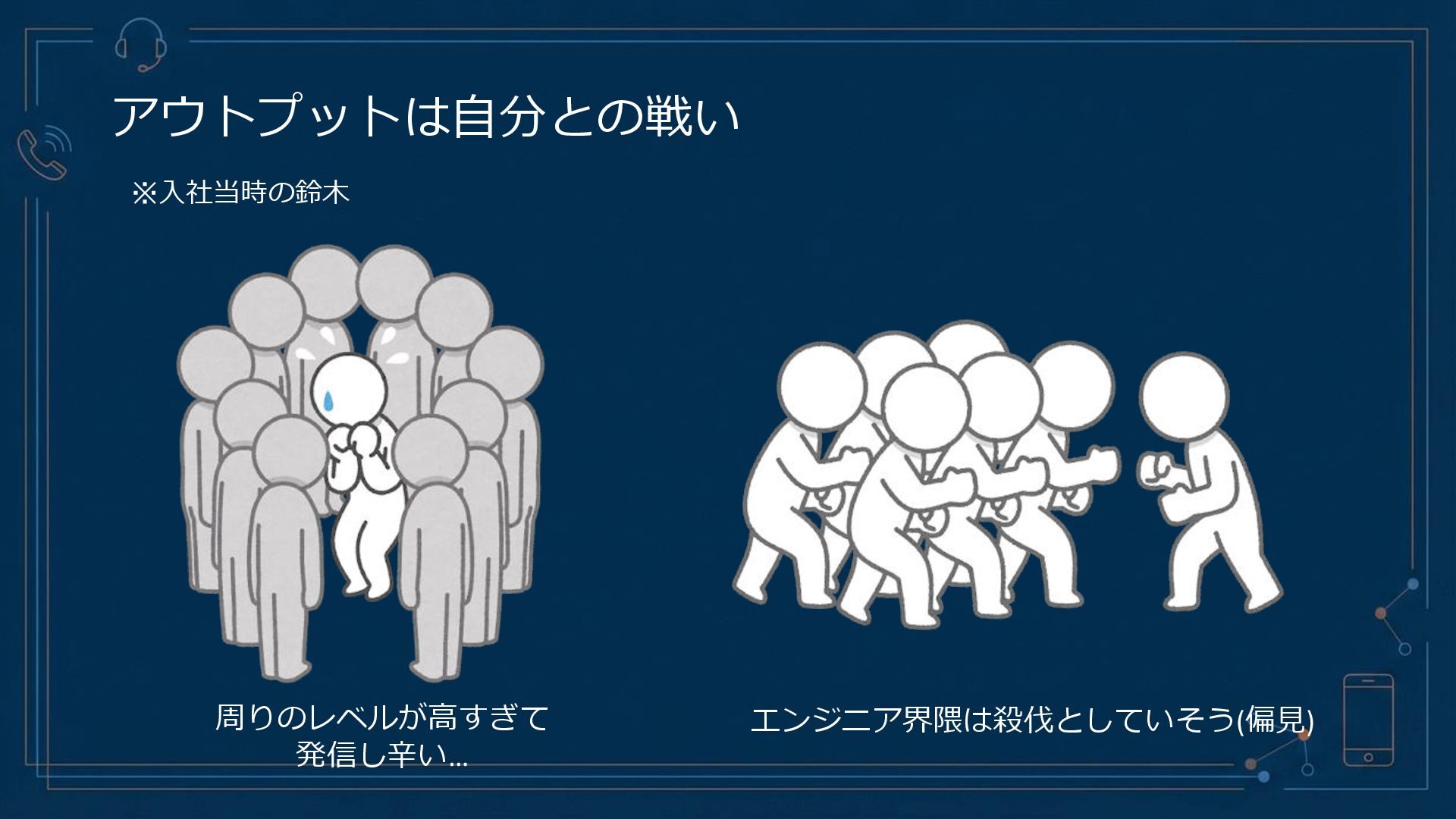 アウトプットは自分との戦い ※入社当時の鈴木 周りのレベルが高すぎて 発信し辛い… エンジニア界隈は殺伐としていそう(偏見)