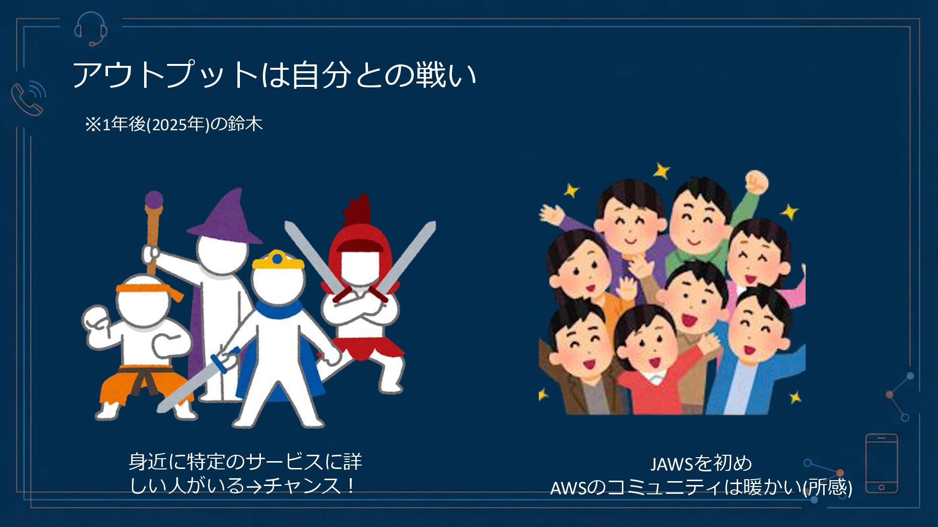 アウトプットは自分との戦い 身近に特定のサービスに詳 しい人がいる→チャンス! ※1年後(2025年)の鈴木 JAWSを初め AWSのコミュニティは暖かい(所感)