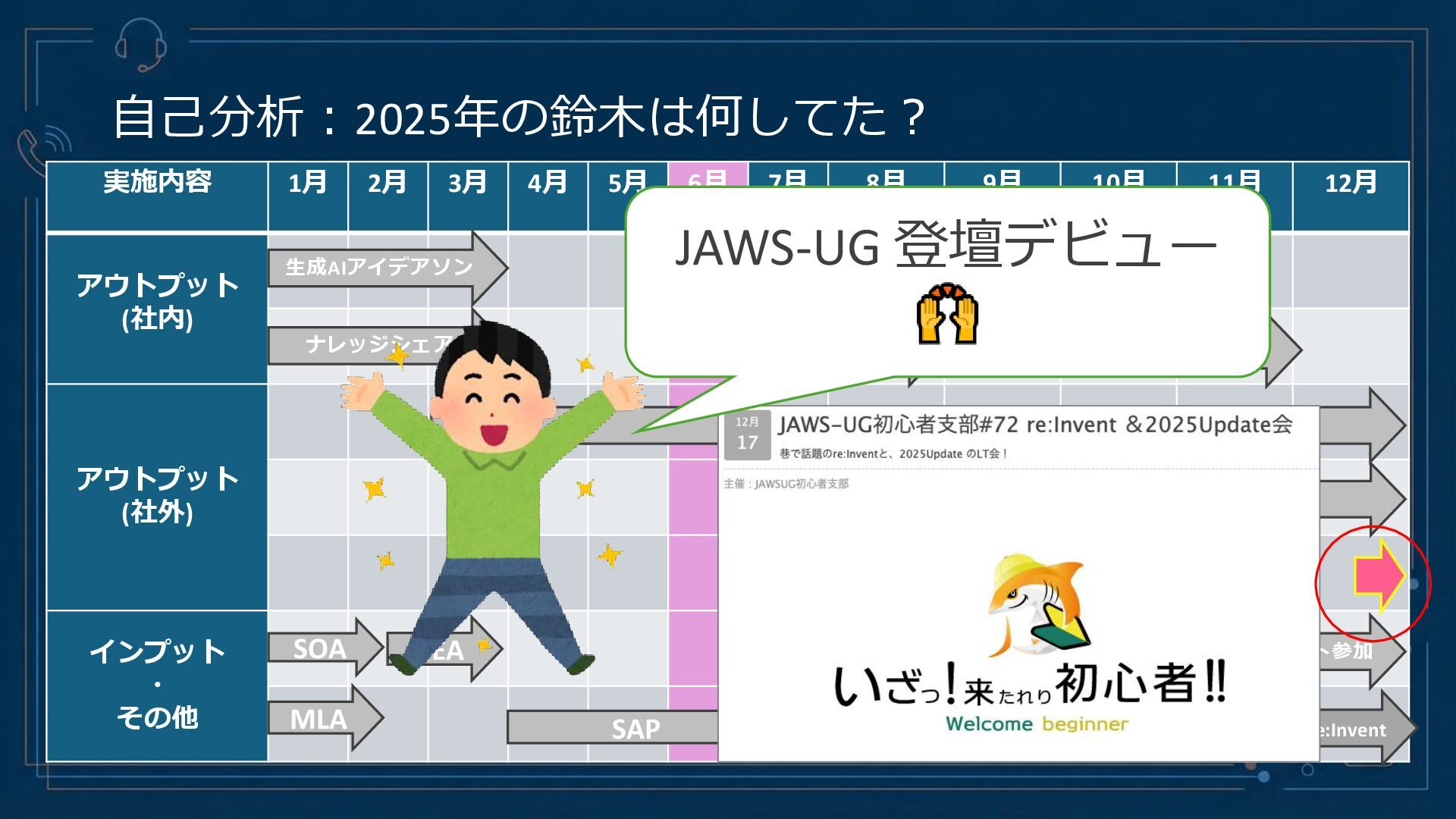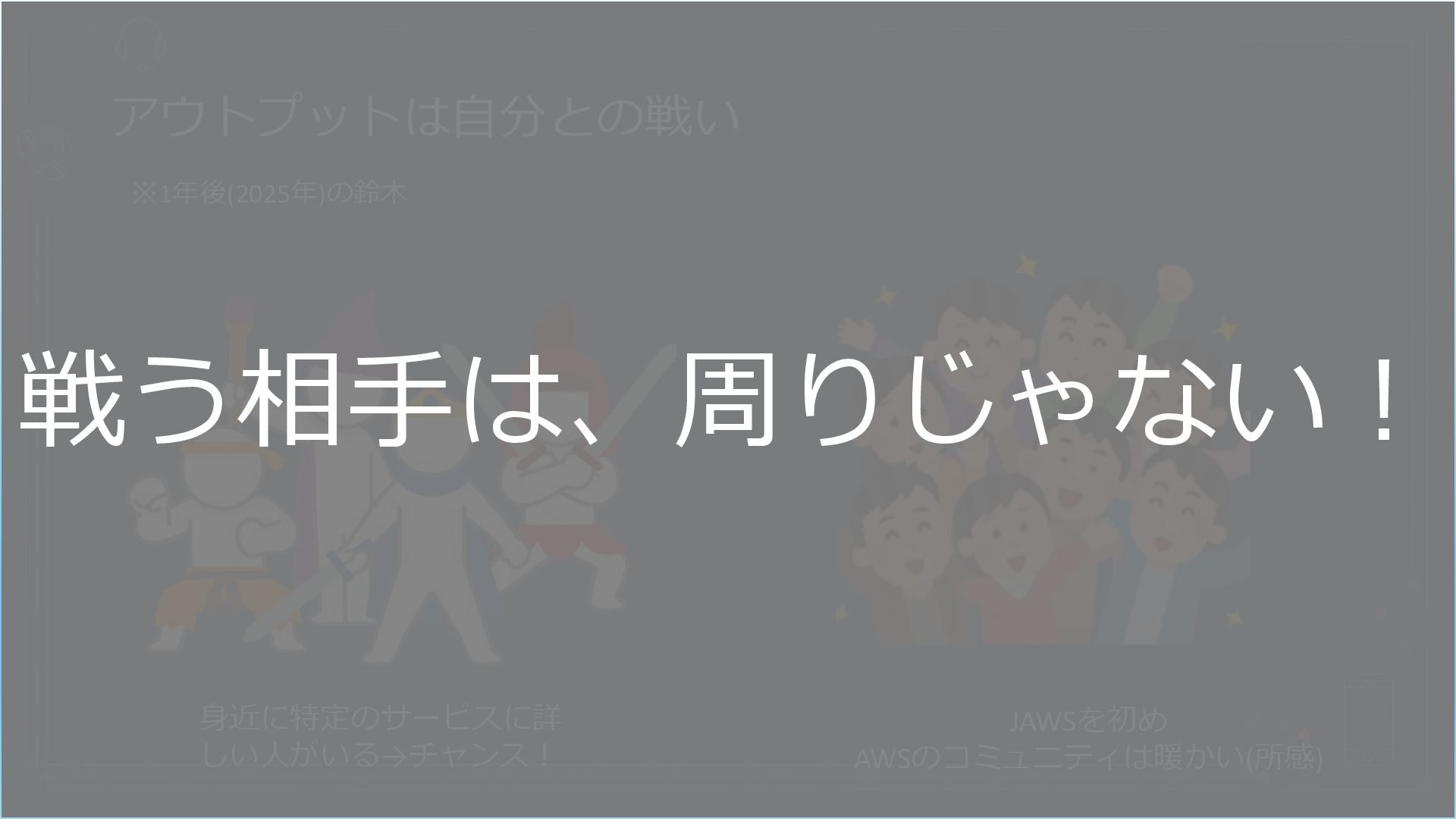 アウトプットは自分との戦い 身近に特定のサービスに詳 しい人がいる→チャンス! ※1年後(2025年)の鈴木 JAWSを初め AWSのコミュニティは暖かい(所感) 戦う相手は、周りじゃない!