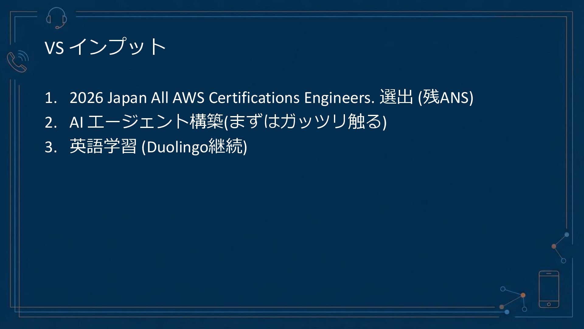 (残ANS) 2. AI エージェント構築(まずはガッツリ触る) 3. 英語学習 (Duolingo継続)