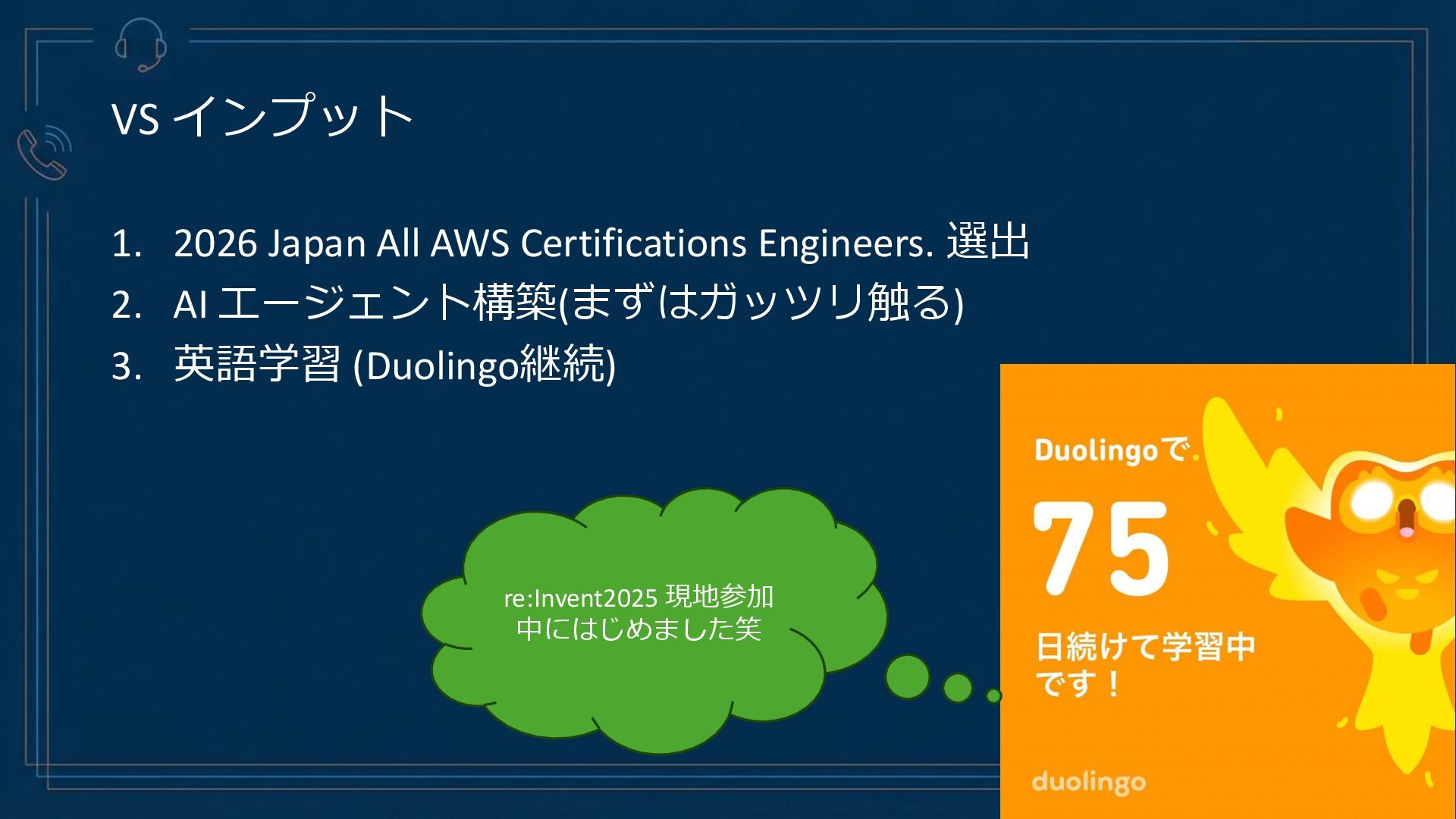 2. AI エージェント構築(まずはガッツリ触る) 3. 英語学習 (Duolingo継続) re:Invent2025 現地参加 中にはじめました笑