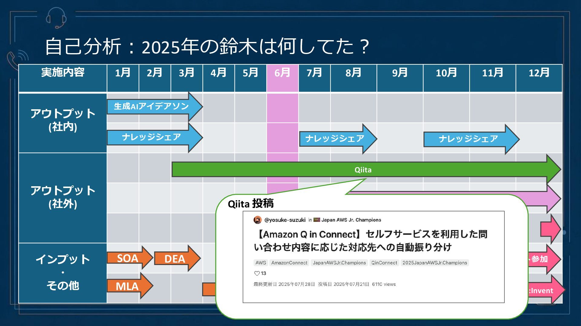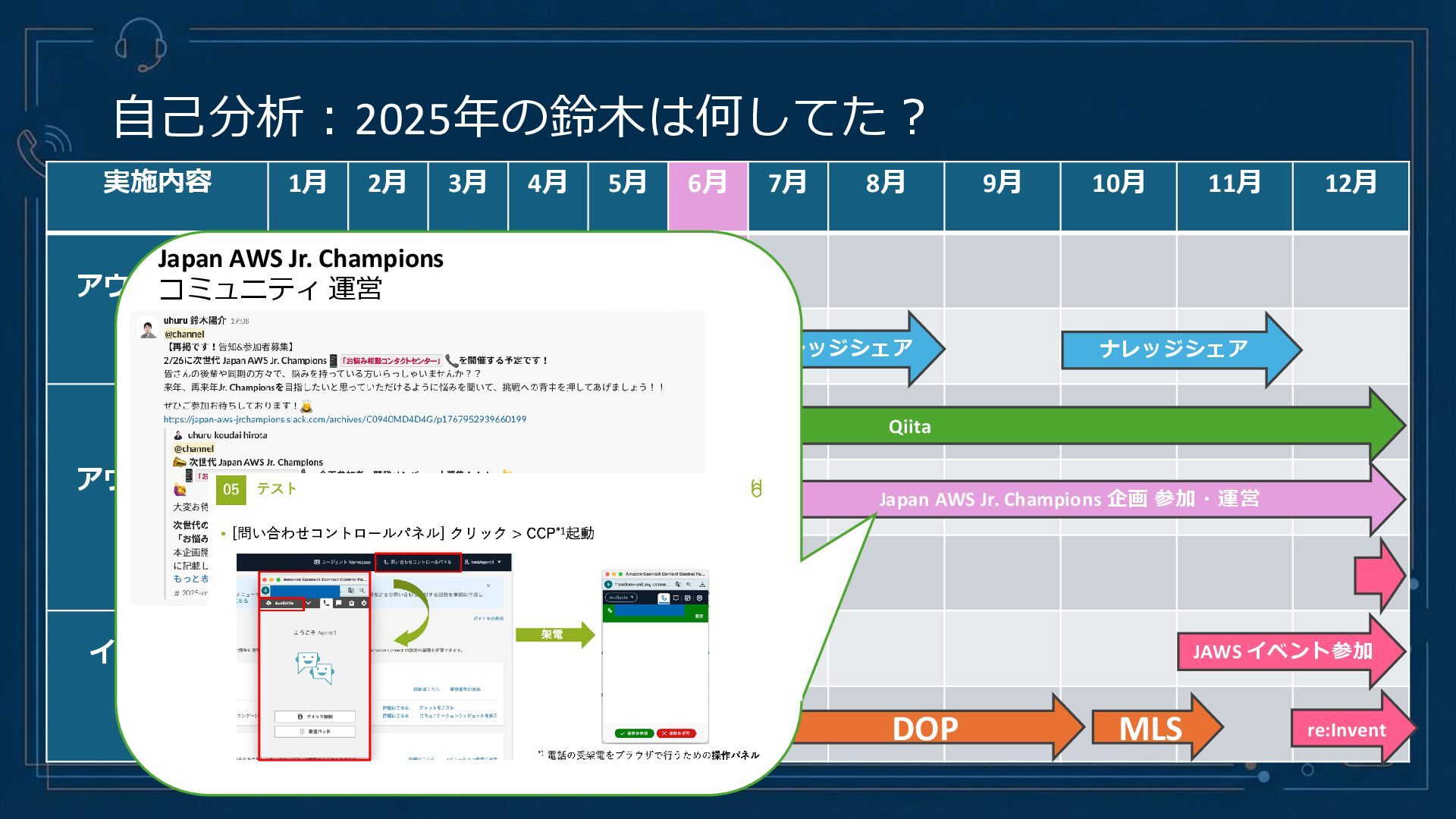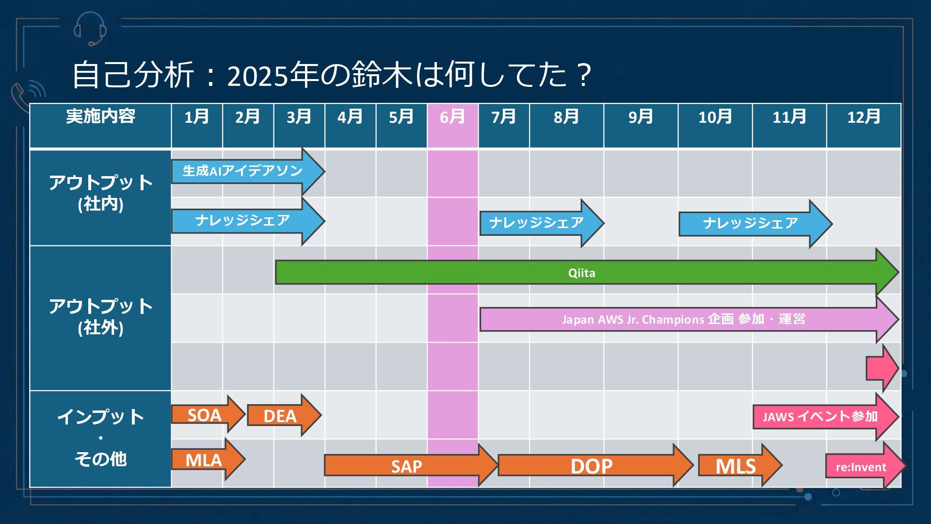 9月 10月 11月 12月 アウトプット (社内) アウトプット (社外) インプット ・ その他 生成AIアイデアソン ナレッジシェア SOA MLA DEA SAP DOP Qiita Japan AWS Jr. Champions 企画 参加・運営 MLS JAWS イベント参加 ナレッジシェア ナレッジシェア 社内イベントの運営 re:Invent