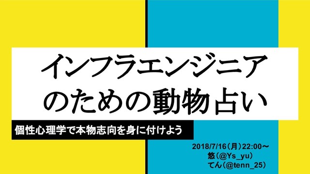 インフラエンジニア のための動物占い 個性心理学で本物志向を身に付けよう 2018/7/16(月)22:00~ 悠(@Ys_yu) てん(@tenn_25)