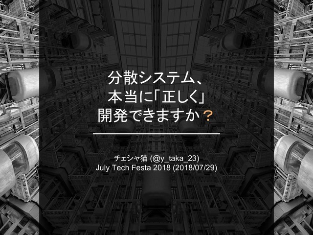 July Tech Festa 2018 で使用したスライドです。二相コミットを例として、分散アルゴリズムの検証にモデル検査を使用する手法について解説しています。また、代表的なモデル検査ツールである SPIN、TLA+、P について、同じシステムを各ツールで記述してみることでその特定の違いについて学びます。