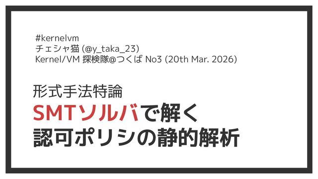 形式手法特論 SMTソルバで解く 認可ポリシの静的解析 #kernelvm チェシャ猫 (@y_taka_23) Kernel/VM 探検隊@つくば No3 (20th