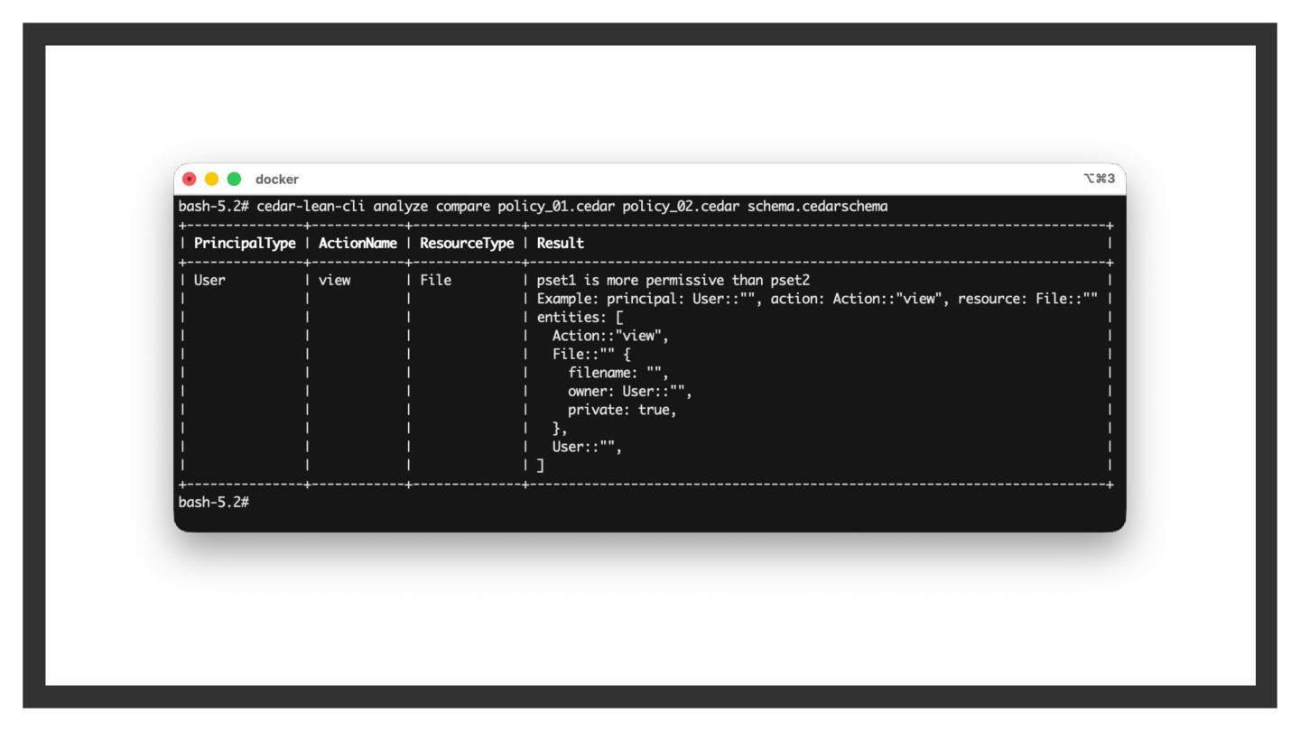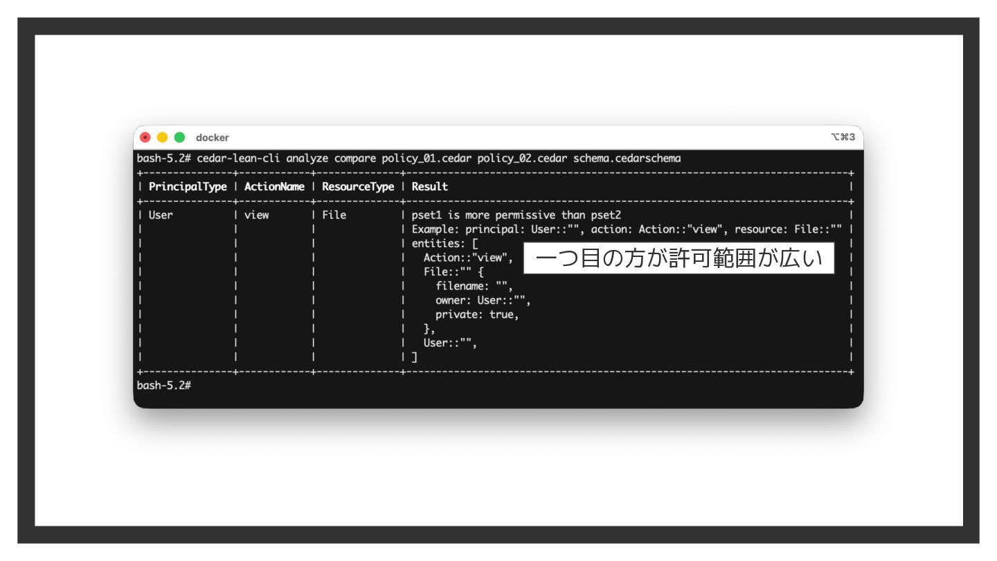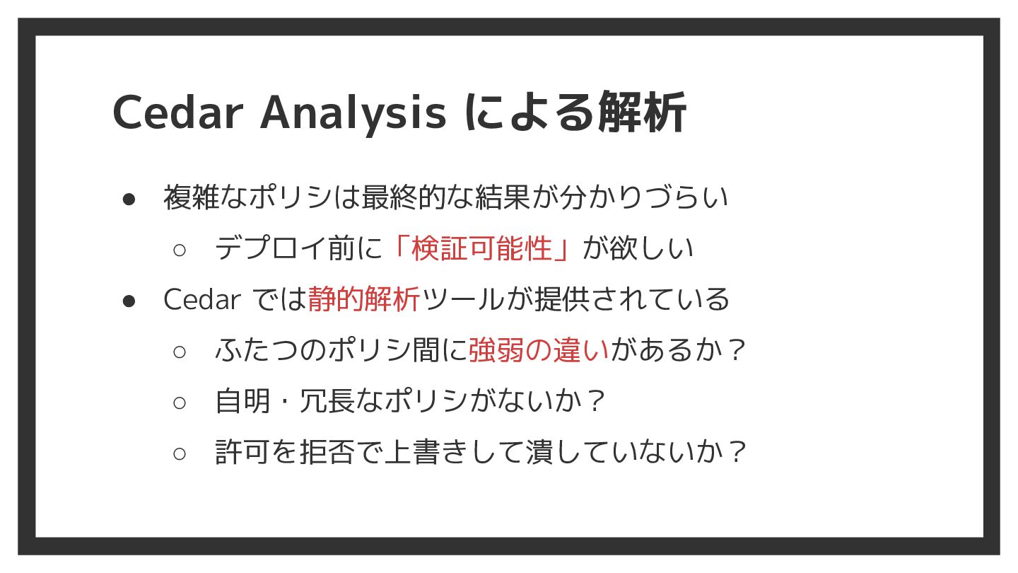 Cedar Analysis による解析 • 複雑なポリシは最終的な結果が分かりづらい ◦ デプロイ前に「検証可能性」が欲しい • Cedar では静的解析ツールが提供されている