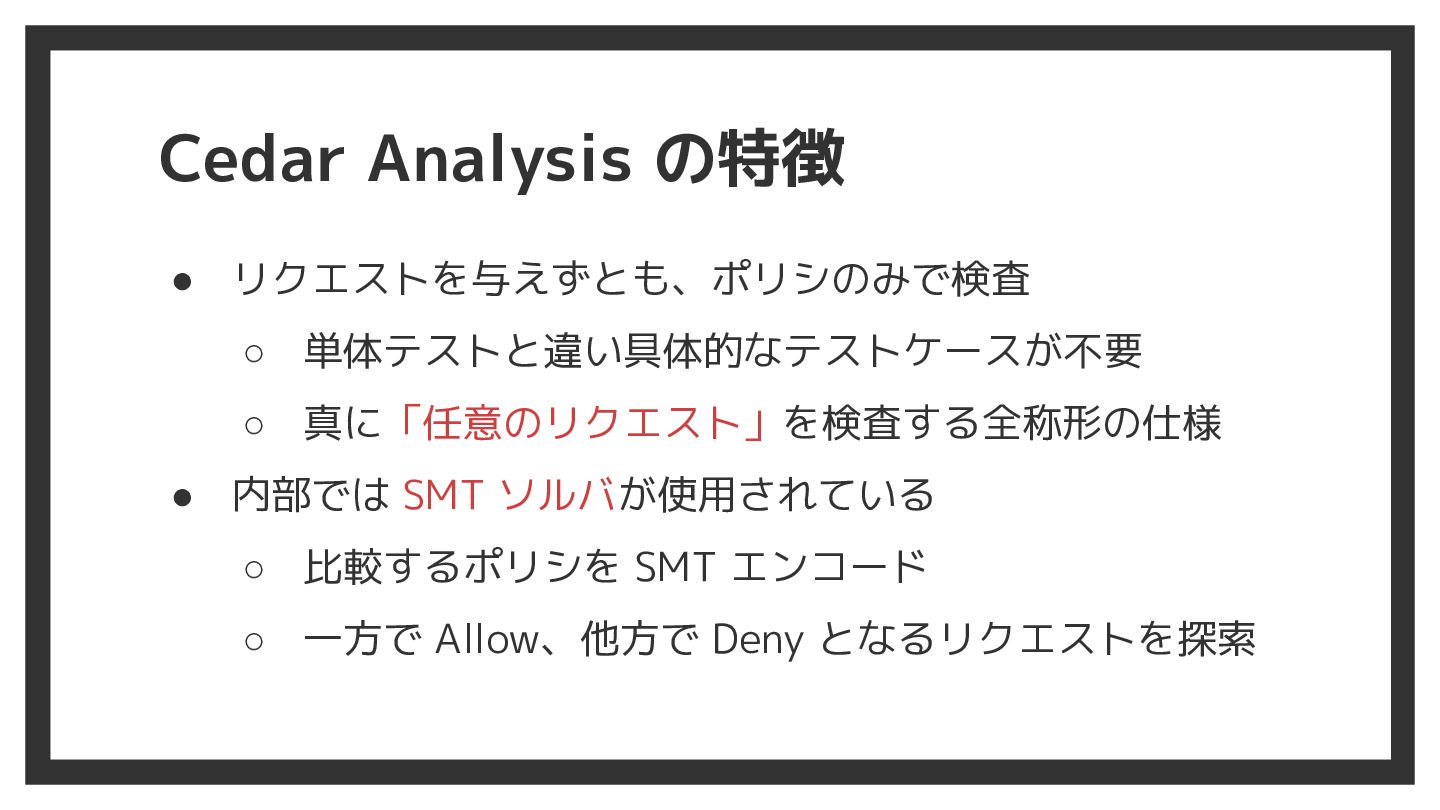 Cedar Analysis の特徴 • リクエストを与えずとも、ポリシのみで検査 ◦ 単体テストと違い具体的なテストケースが不要 ◦ 真に「任意のリクエスト」を検査する全称形の仕様 •