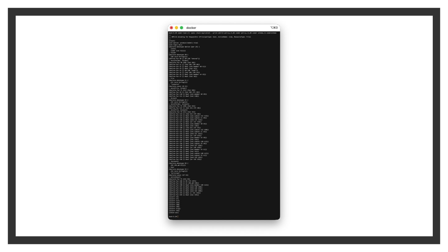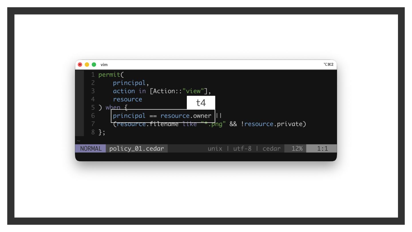 Action / Resource で指定 • Cedar Analysis ◦ ポリシの意味を静的に検査できる ◦ 内部では SMT ソルバで充足可能性を検査