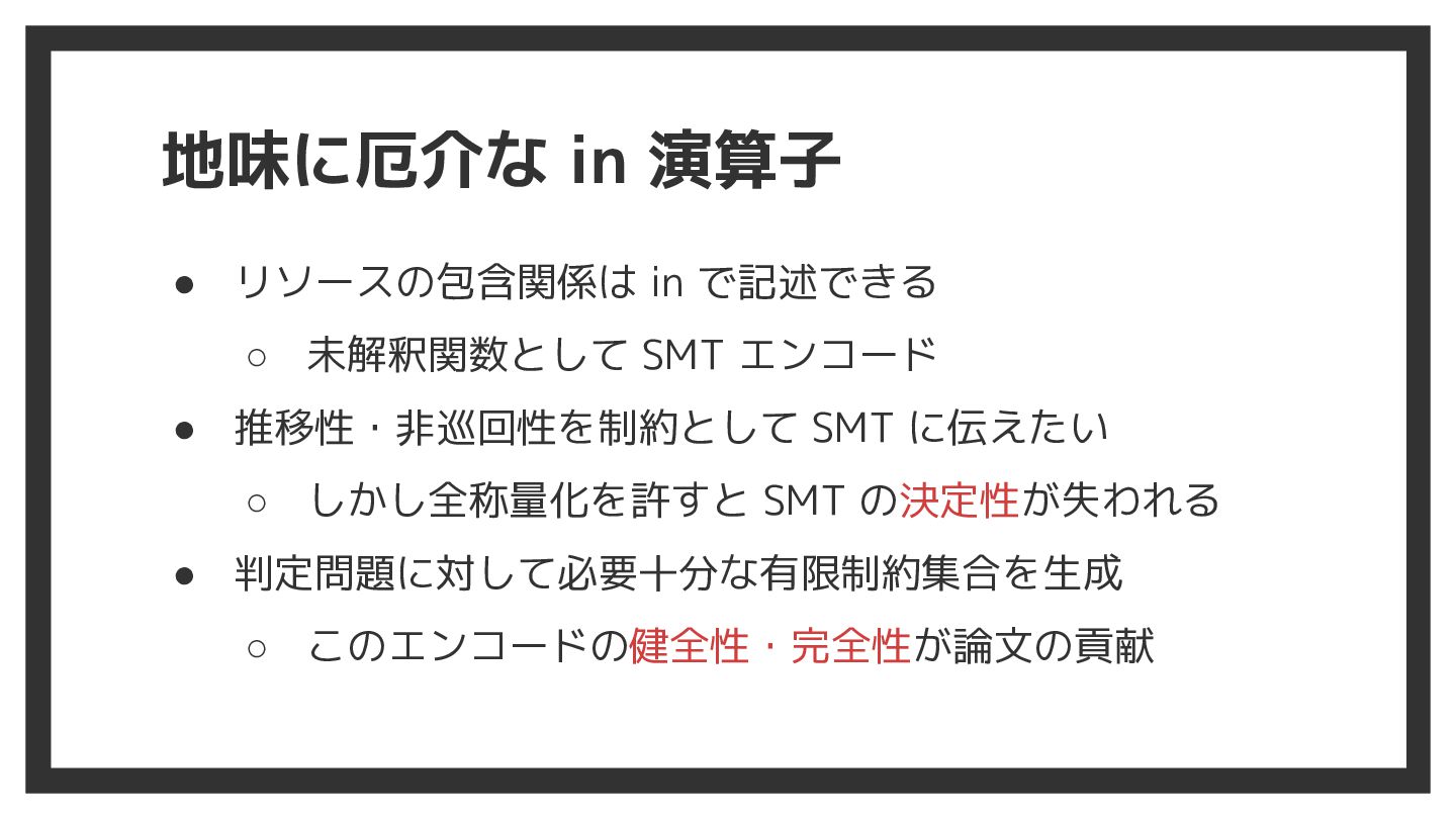 地味に厄介な in 演算子 • リソースの包含関係は in で記述できる ◦ 未解釈関数として SMT