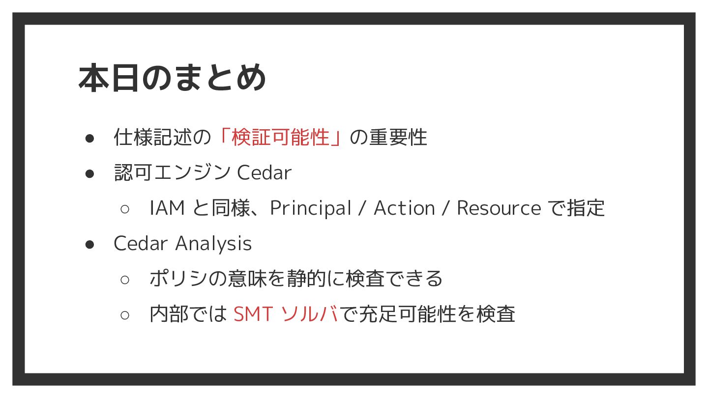 本日のまとめ • 仕様記述の「検証可能性」の重要性 • 認可エンジン Cedar ◦ IAM と同様、Principal /