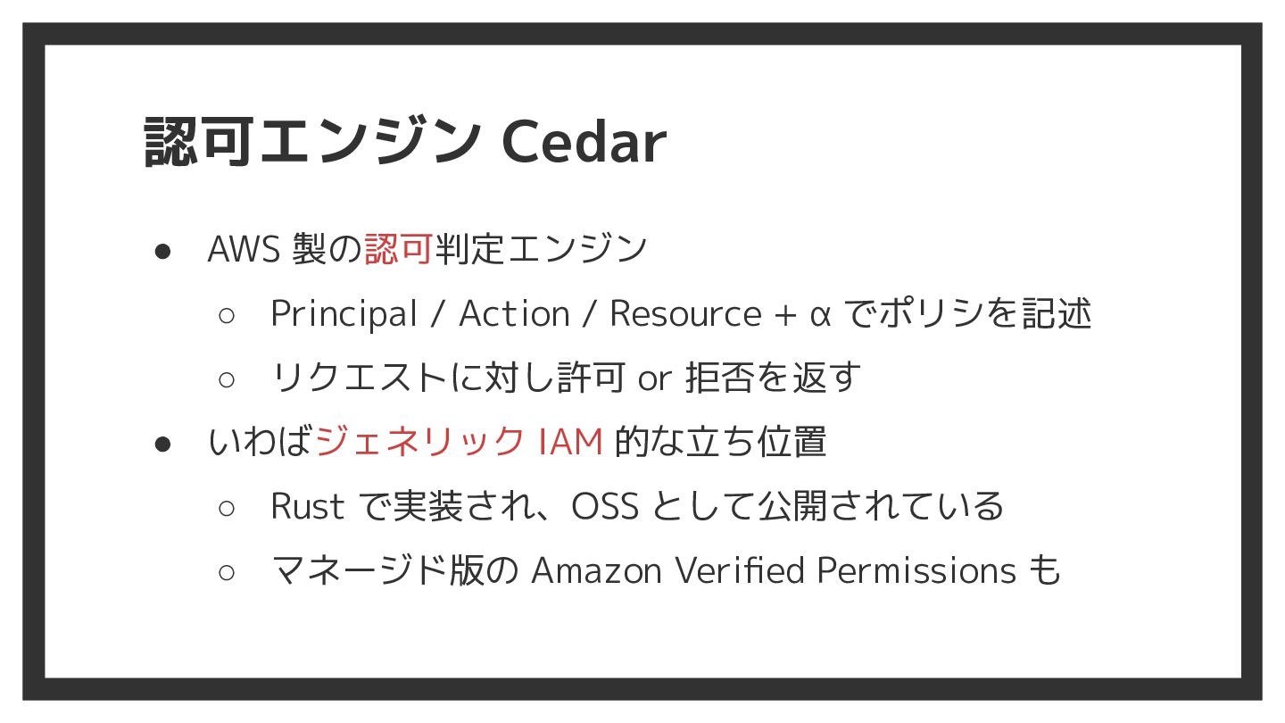 Resource + α でポリシを記述 ◦ リクエストに対し許可 or 拒否を返す • いわばジェネリック IAM 的な立ち位置 ◦ Rust で実装され、OSS として公開されている ◦ マネージド版の Amazon Verified Permissions も