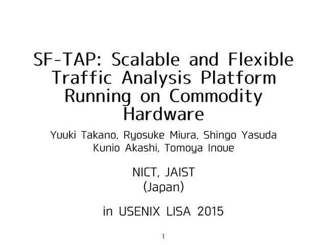 Application-level network traffic analysis and sophisticated analysis techniques such as machine learning and stream data processing for network traffic require considerable computational resources. In addition, developing an application protocol analyzer is a tedious and time- consuming task. Therefore, we propose a scalable and flexible traffic analysis platform (SF-TAP) that provides an efficient and flexible application-level stream analysis of high-bandwidth network traffic. Our platform’s flexibility and modularity allow developers to easily implement multicore scalable application-level stream analyzers. Furthermore, SF-TAP is horizontally scalable and can therefore manage high-bandwidth network traffic. We achieve this scalability by separating network traffic based on traffic flows, forwarding the separated flows to multiple SF-TAP cells, each of which consists of a traffic capturer and application-level analyzers. In this study, we discuss the design and implementation of SF-TAP and provide details of its evaluation.
