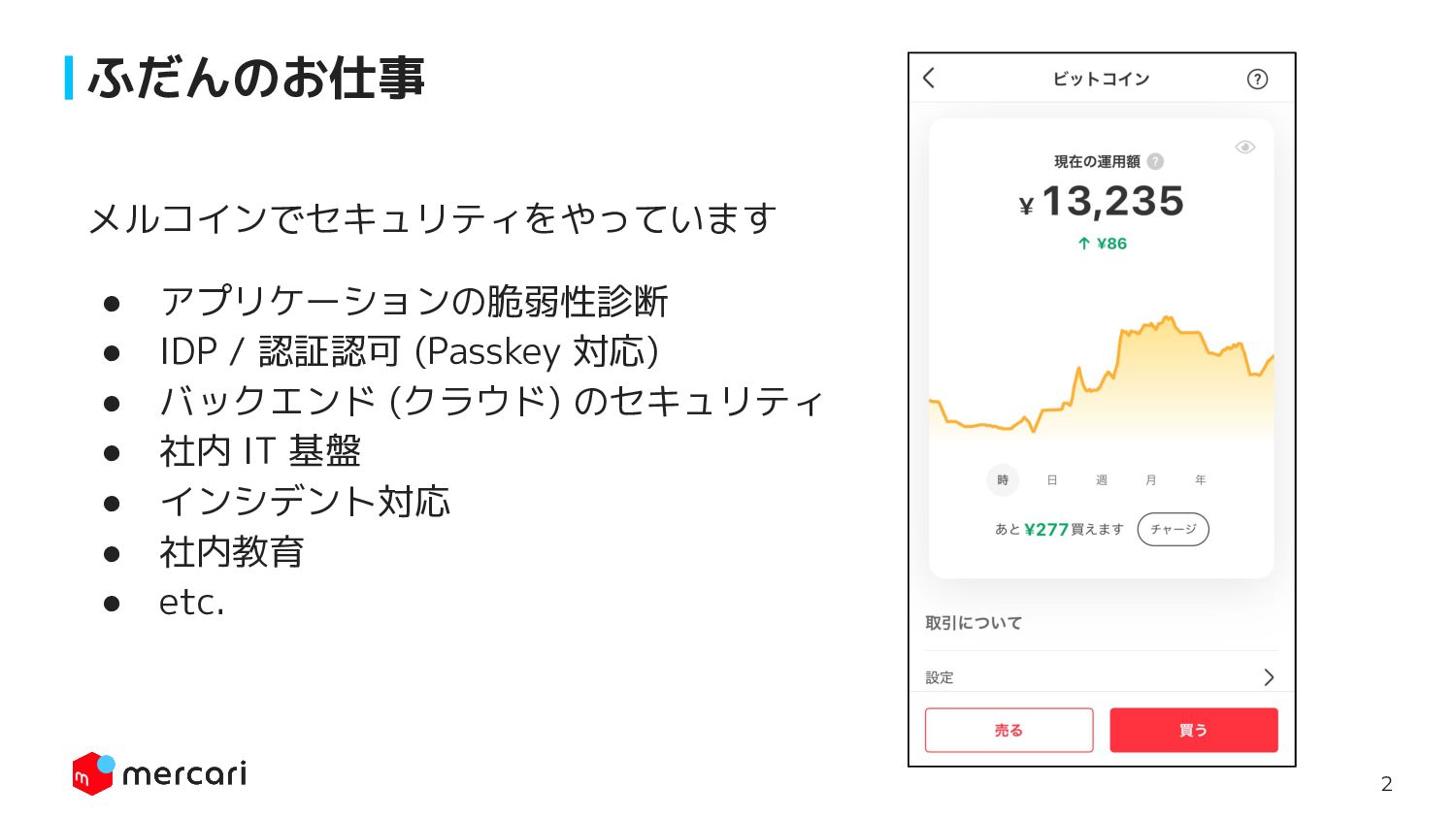 2 メルコインでセキュリティをやっています • アプリケーションの脆弱性診断 • IDP / 認証認可 (Passkey 対応)