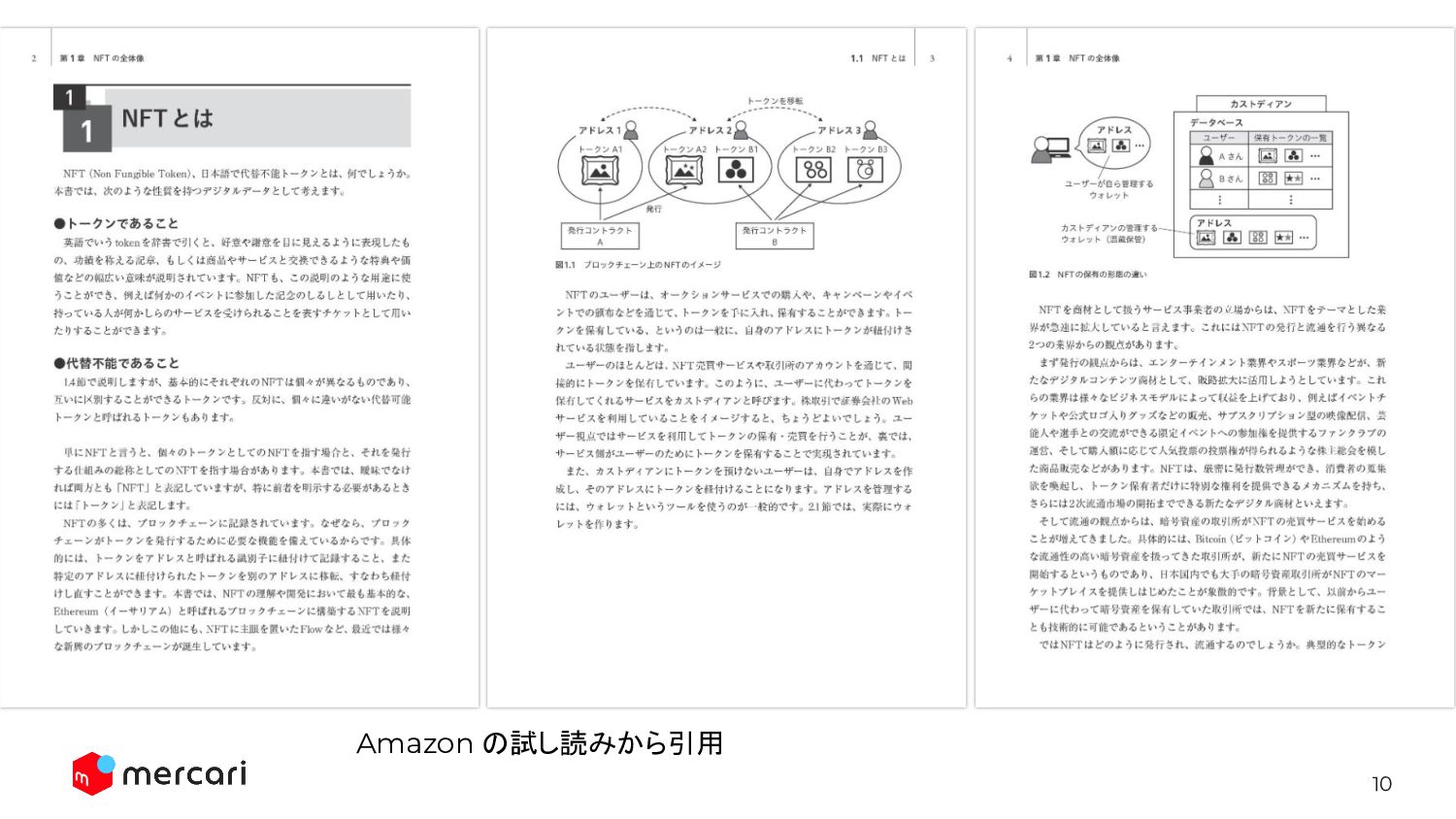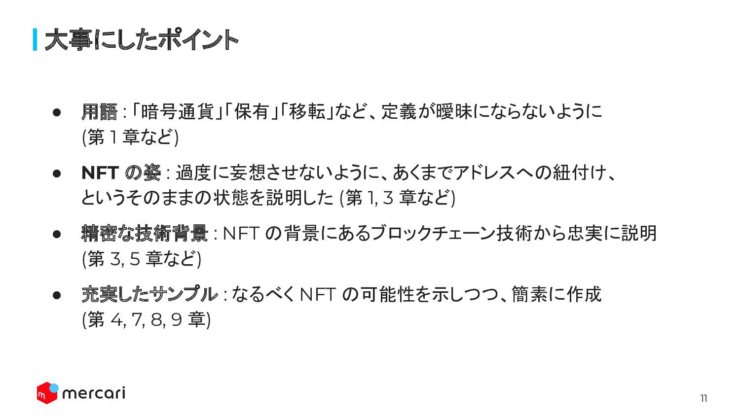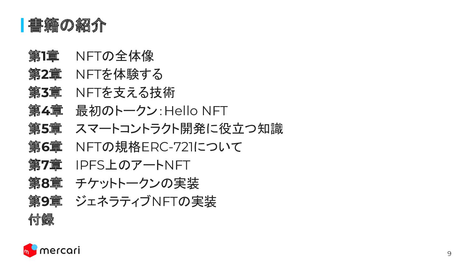 の姿 : 過度に妄想させないように、あくまでアドレスへの紐付け、 というそのままの状態を説明した (第 1, 3 章など) • 精密な技術背景 : NFT の背景にあるブロックチェーン技術から忠実に説明 (第 3, 5 章など) • 充実したサンプル : なるべく NFT の可能性を示しつつ、簡素に作成 (第 4, 7, 8, 9 章) 大事にしたポイント