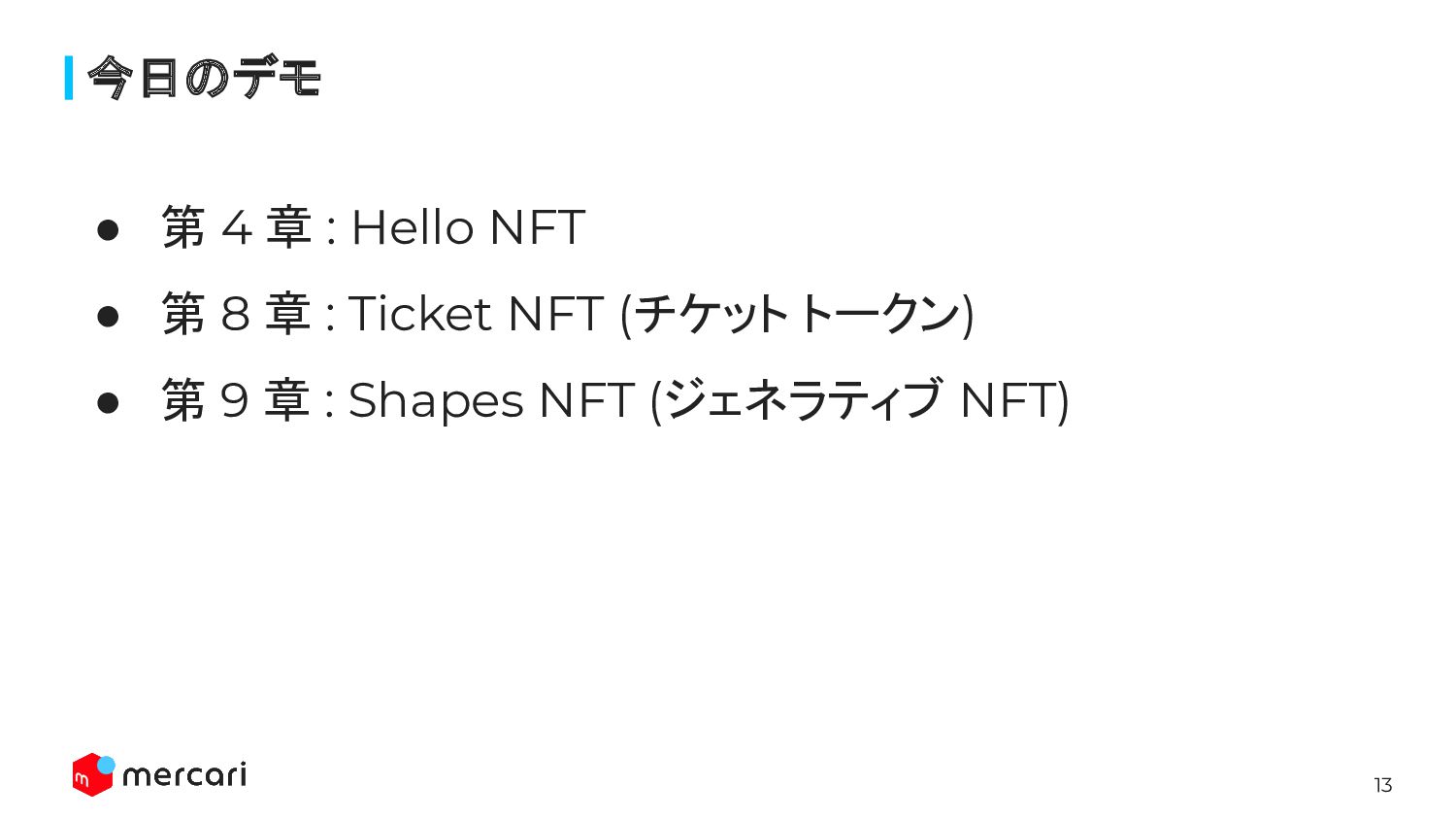 8 章 : Ticket NFT (チケット トークン) • 第 9 章 : Shapes NFT (ジェネラティブ NFT) 今日のデモ