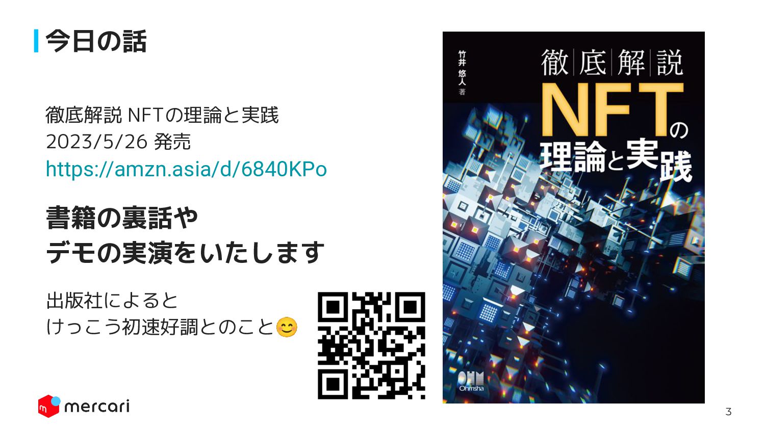 3 徹底解説 NFTの理論と実践 2023/5/26 発売 https://amzn.asia/d/6840KPo 書籍の裏話や デモの実演をいたします 出版社によると けっこう初速好調とのこと😊